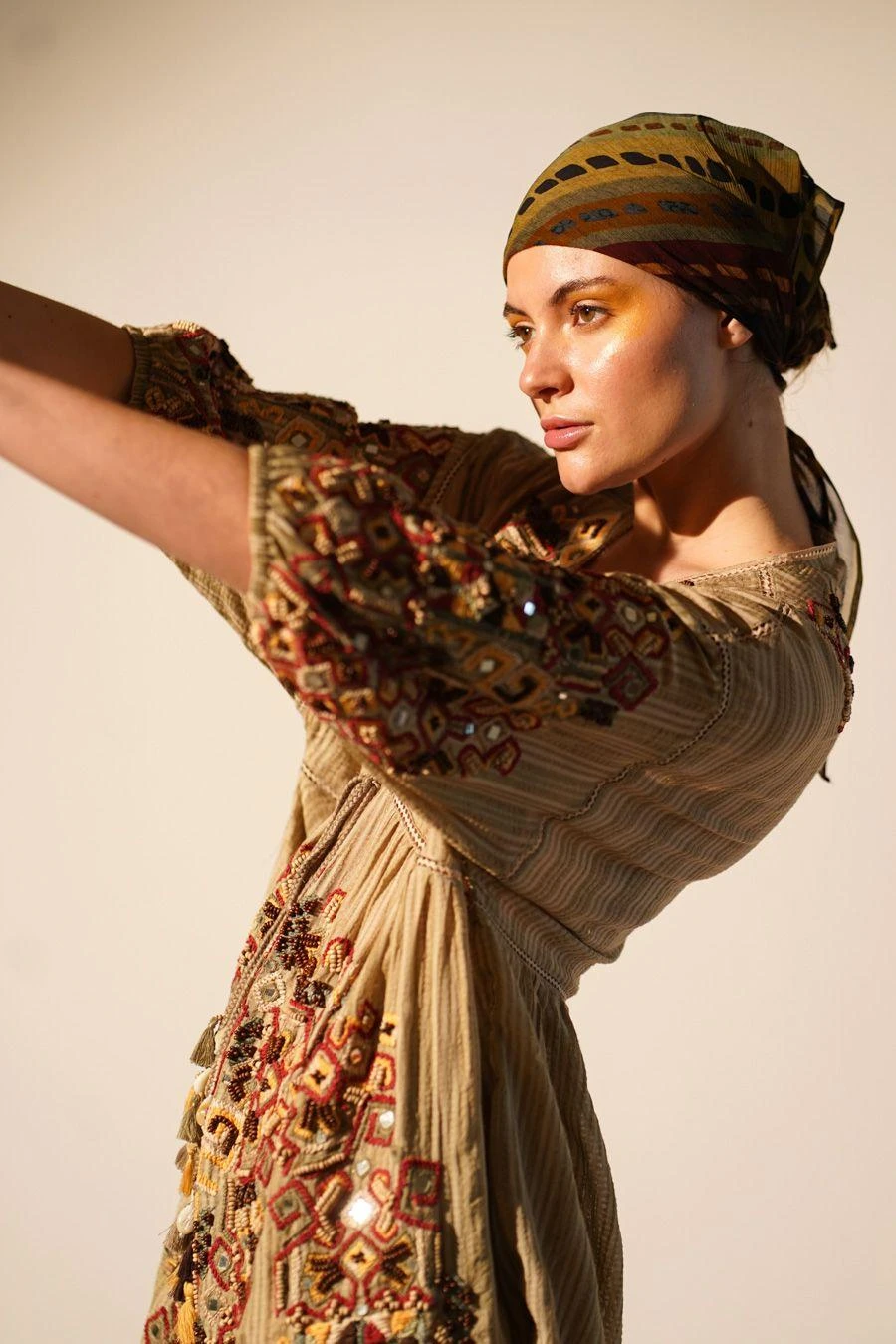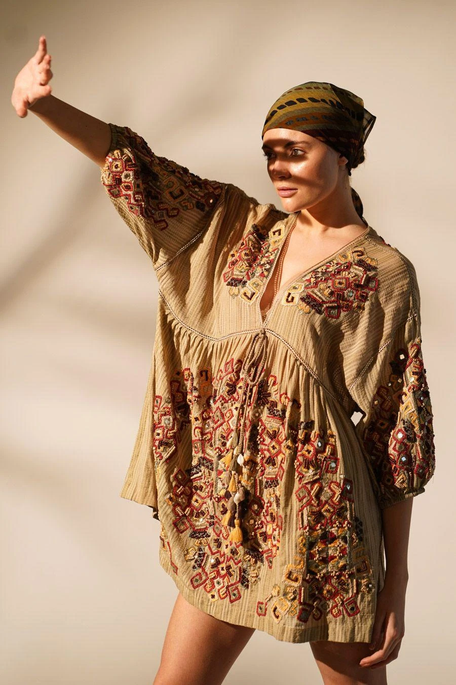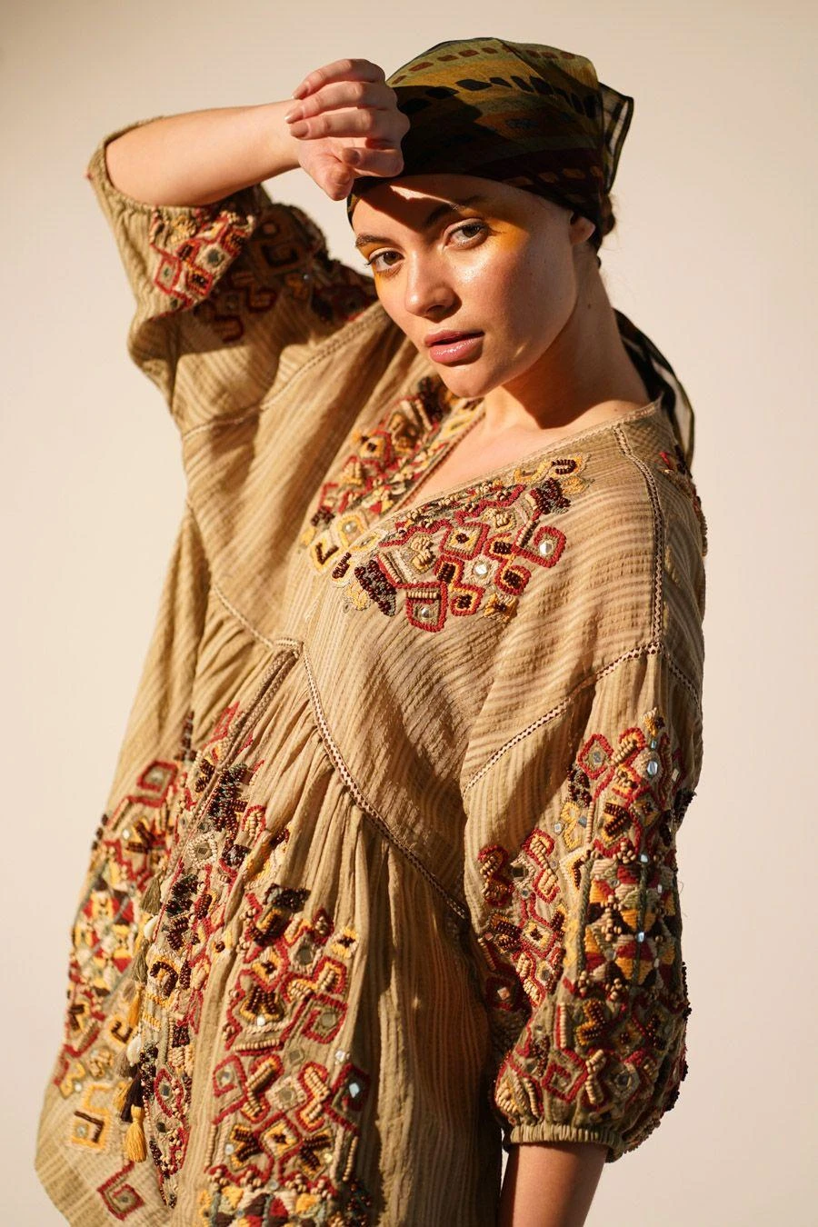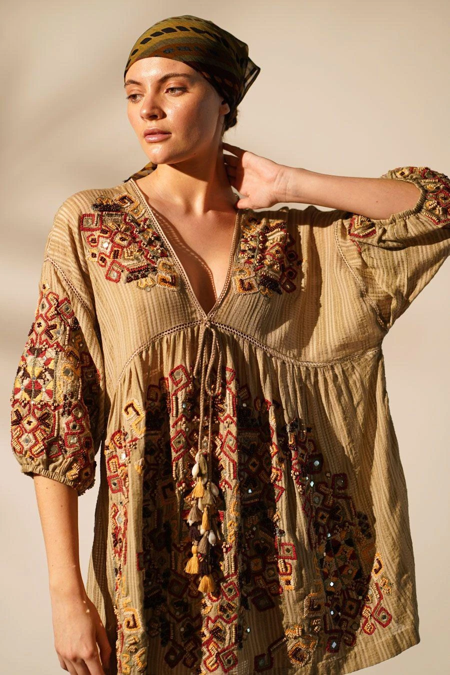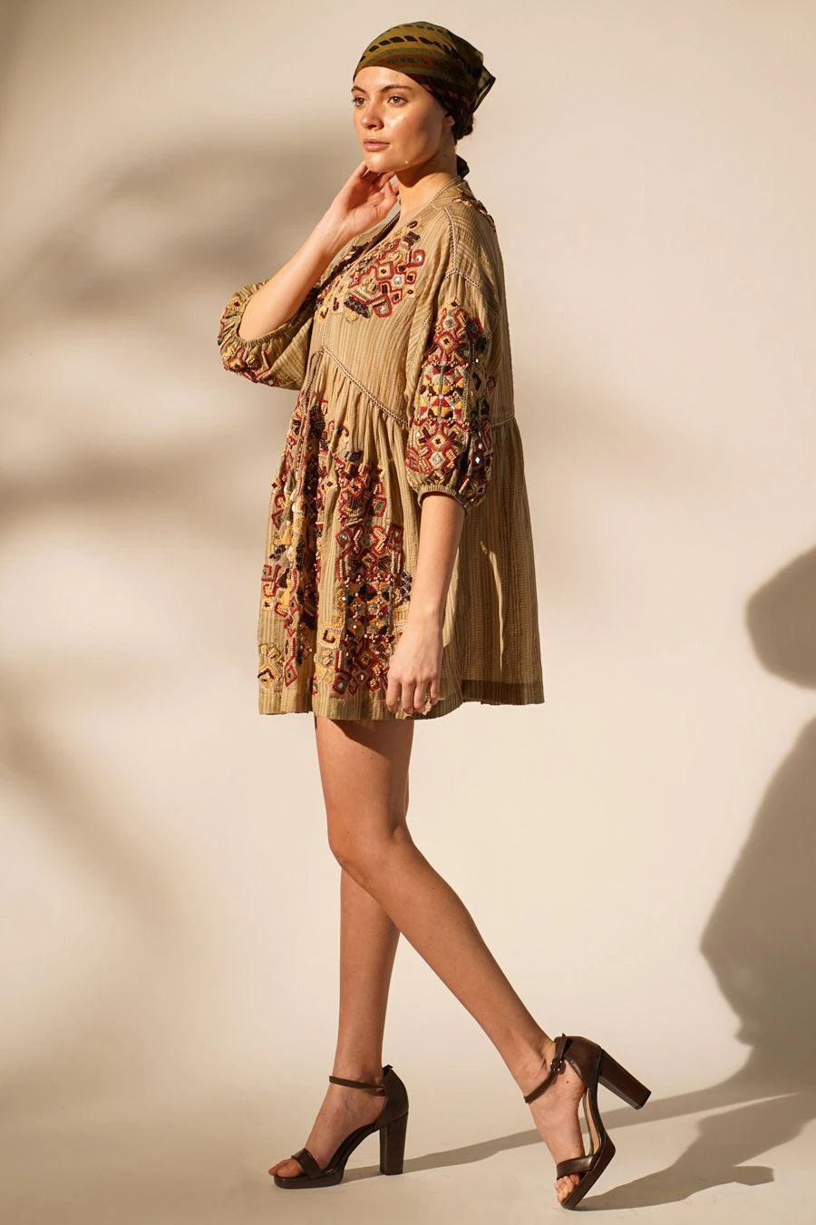 Add a layer of statement and glamour to your resort getaways with this khaki short dress. Crafted in striped chanderi, this shirt dress features hand done thread & wooden embellishments.