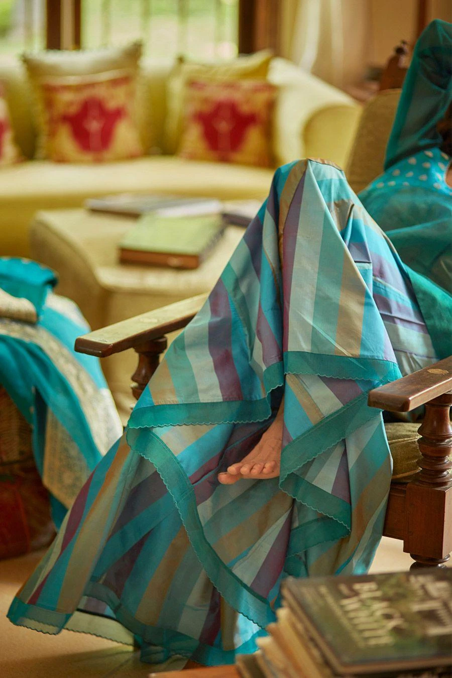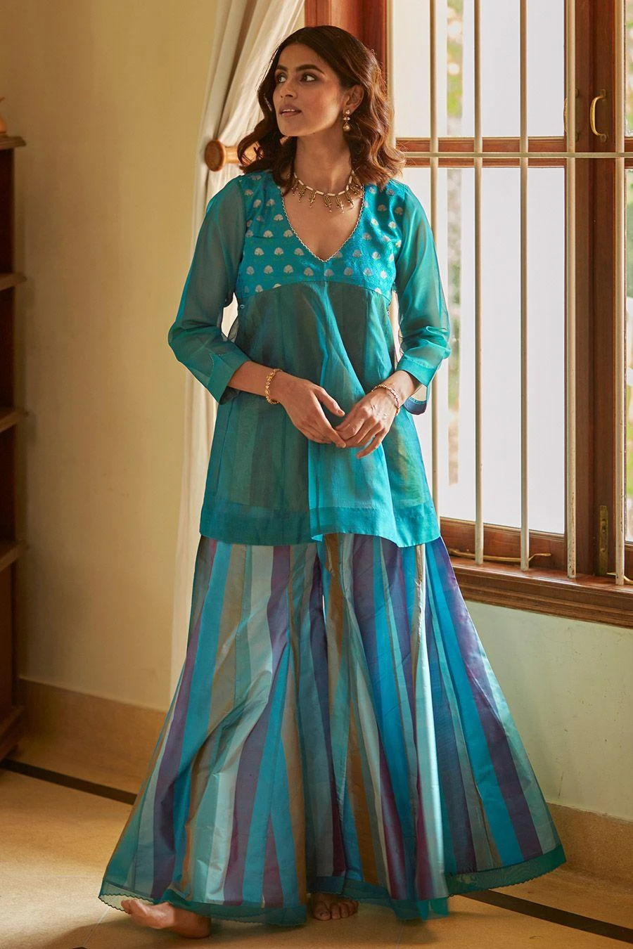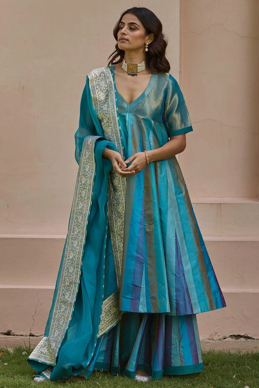 Inspired by royal Awadhi silhouettes, the Malhari Gharara is tailored in handwoven Pachranga silk that is painstakingly handwoven by artisans in Benaras with a specialised dyeing and warp preparation making this gharara extra special.