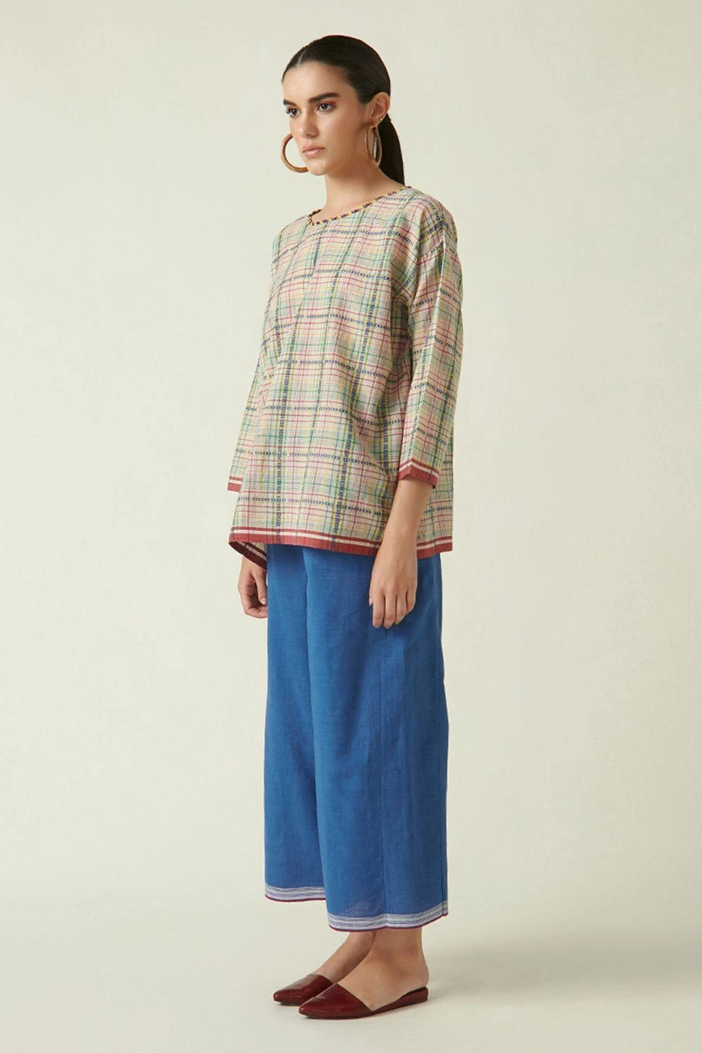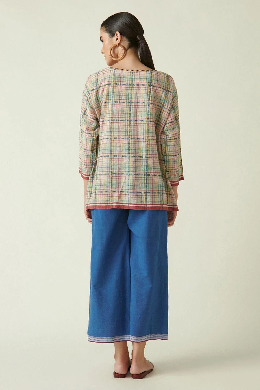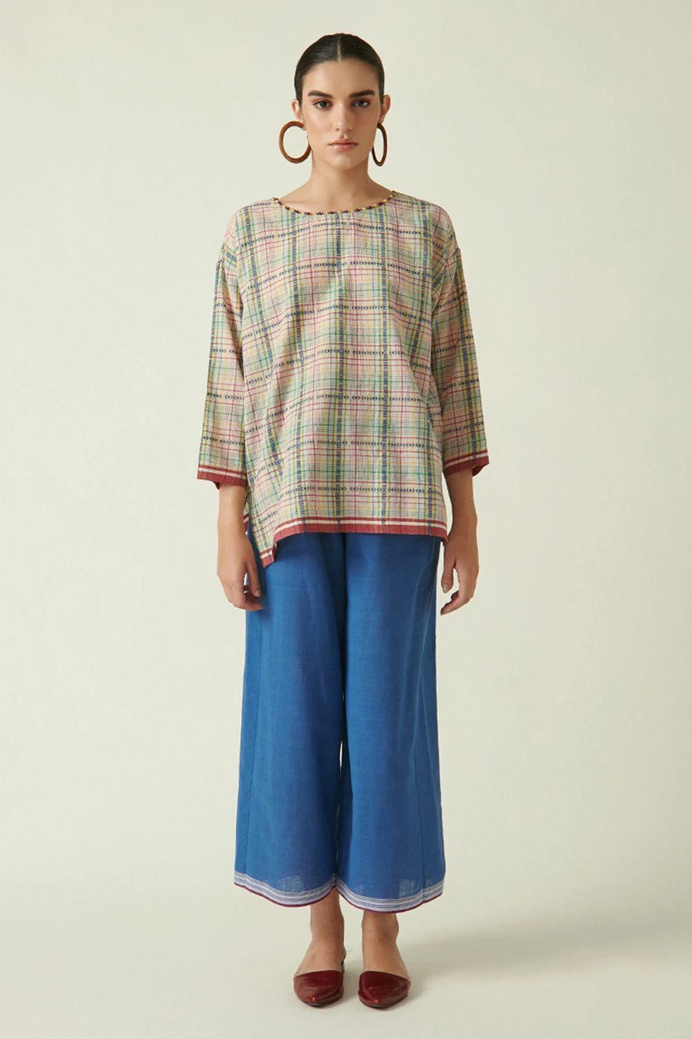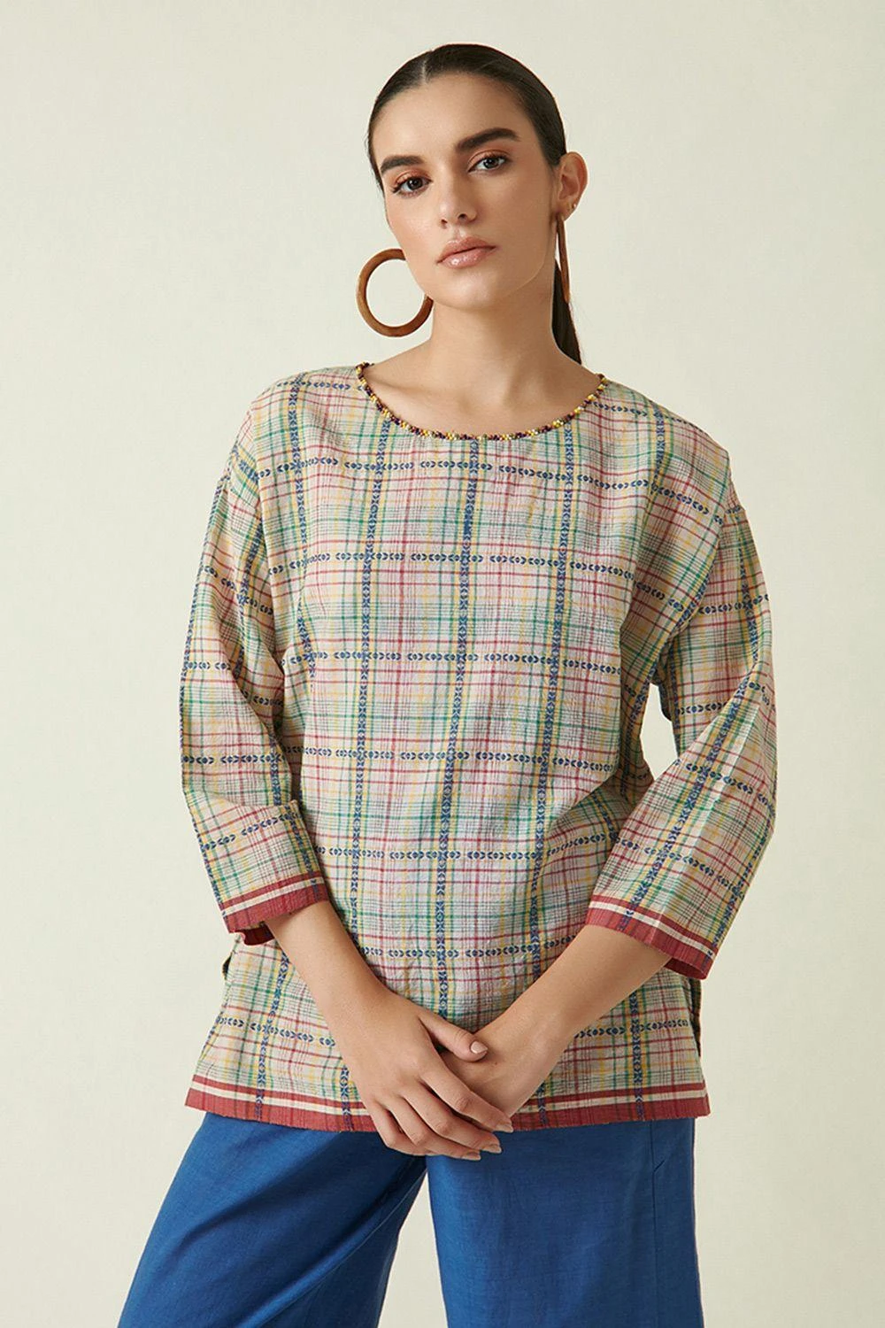 This beige round neck top cut in handloom cotton features beading details and dobby weaves creating a checks pattern. Complete the look by styling this top with some blue straight fit pants and boho jewellery.