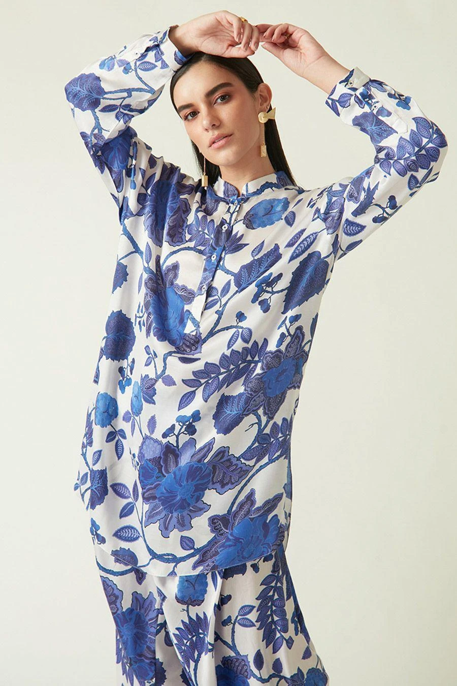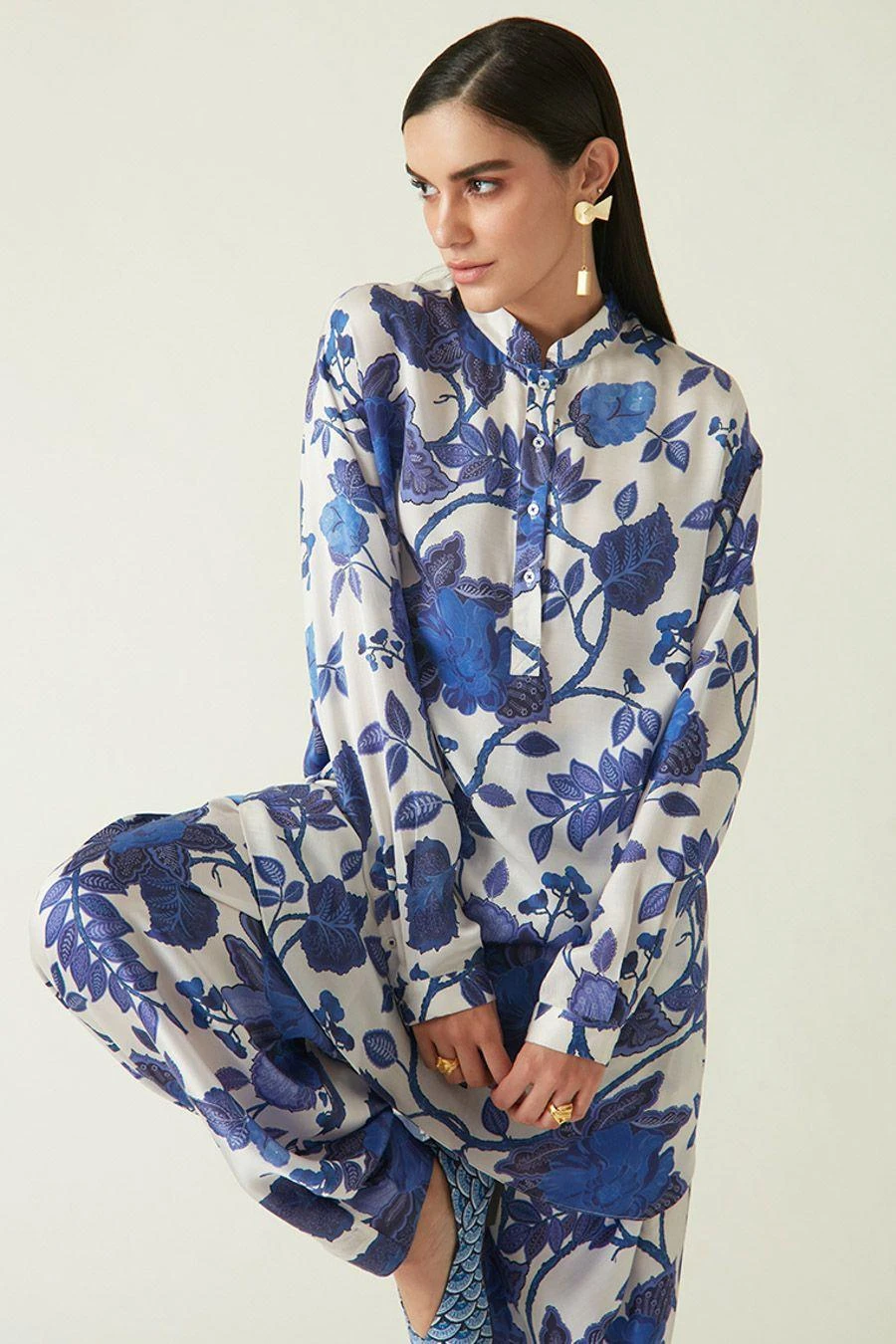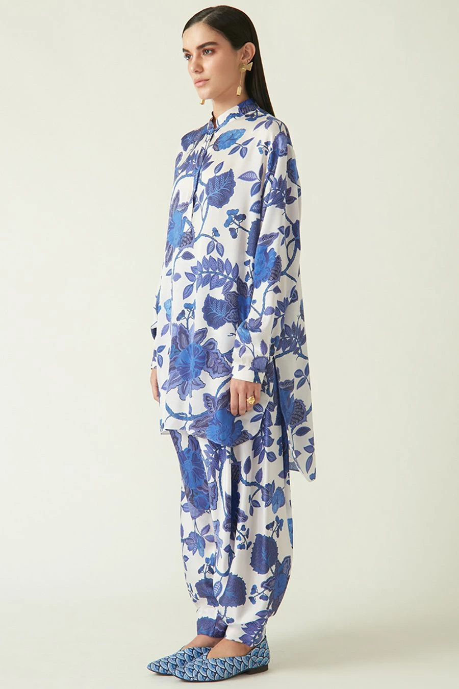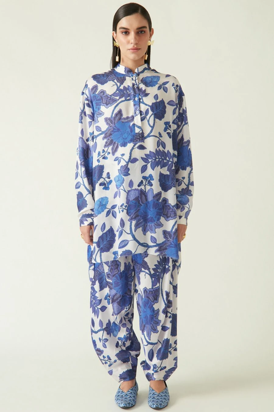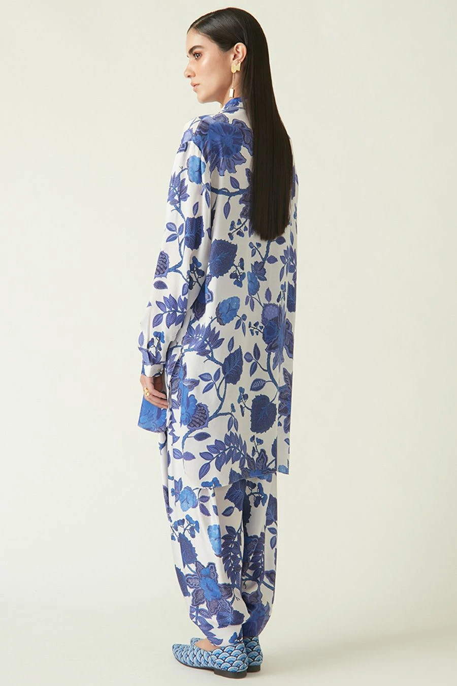 Crafted in modal satin, this printed cowl salwar features side pockets and abstract print all over. Style these pants with the White & navy Sungai printed tunic from the collection to complete the set.