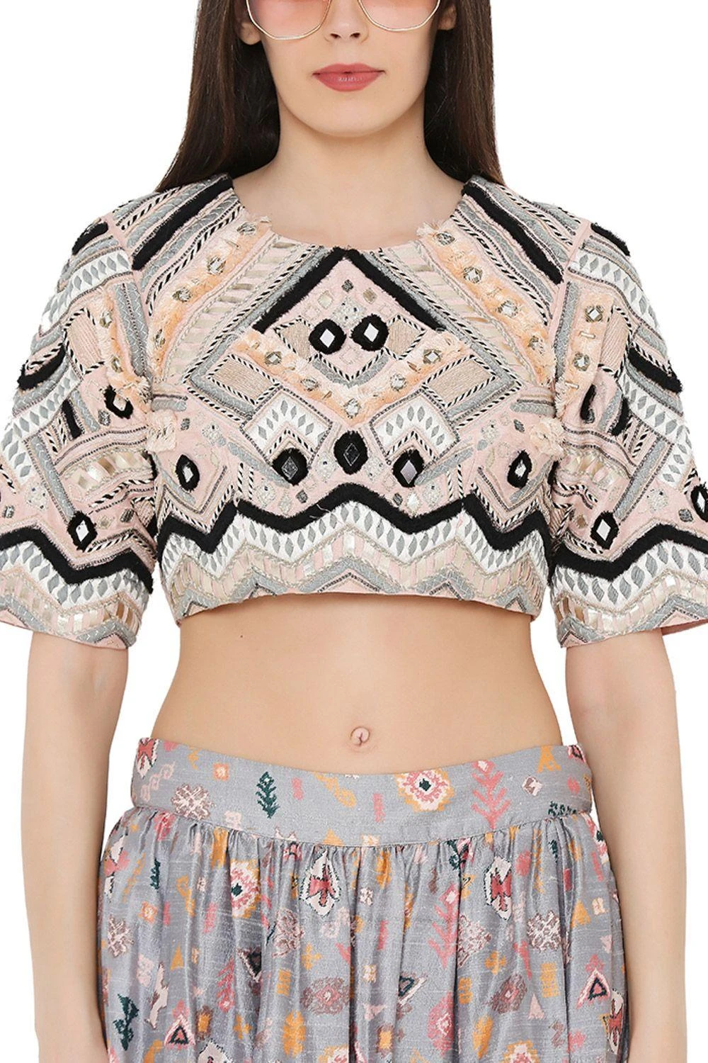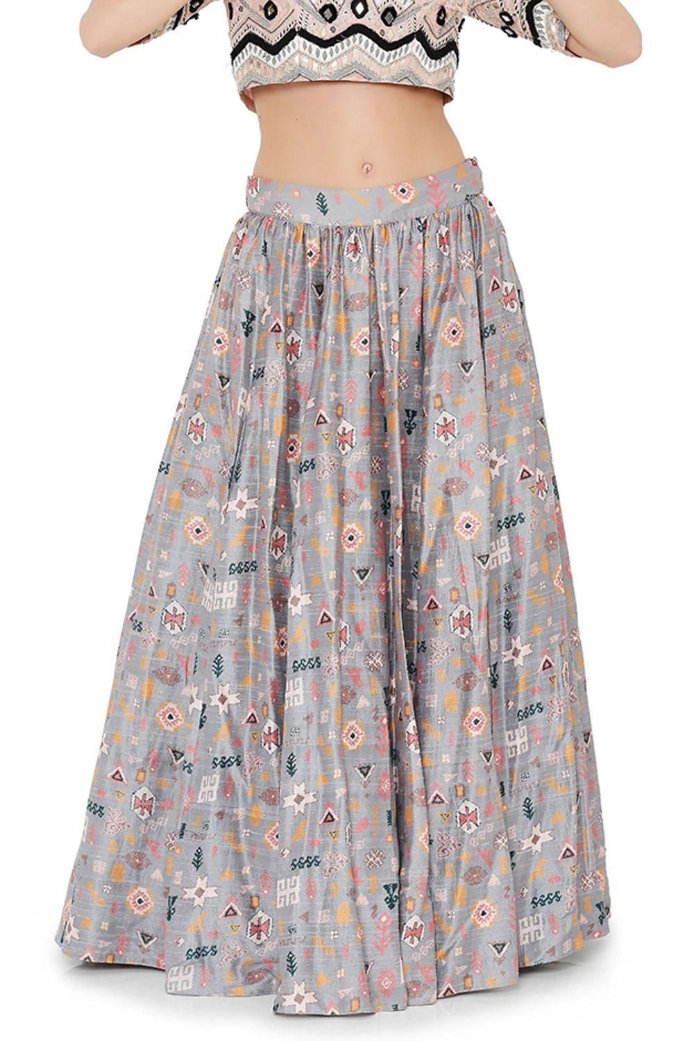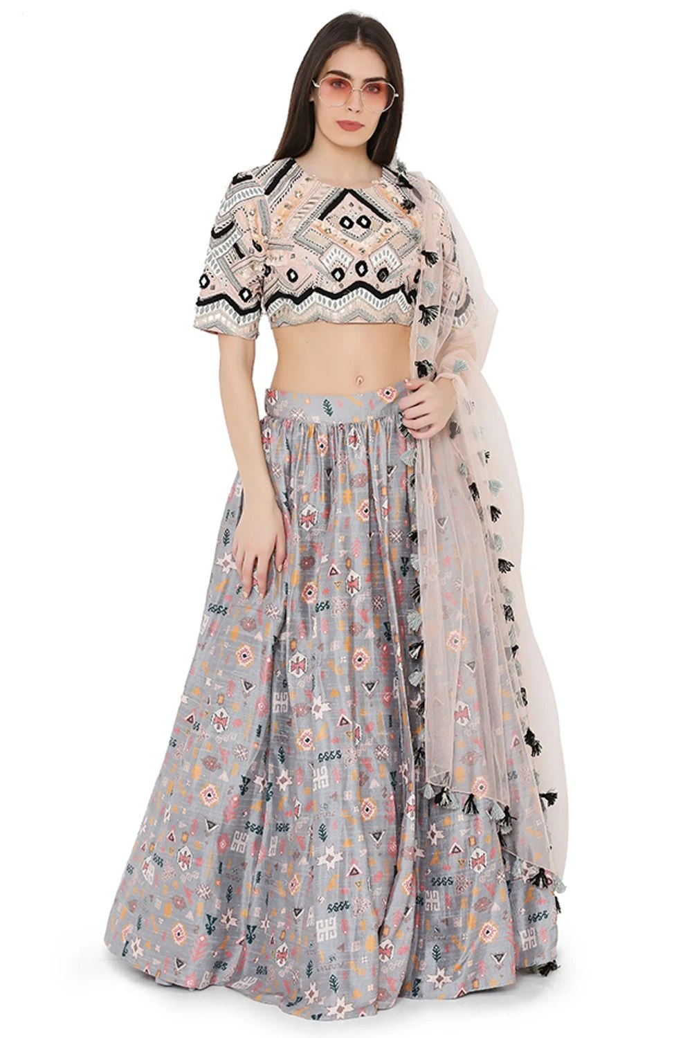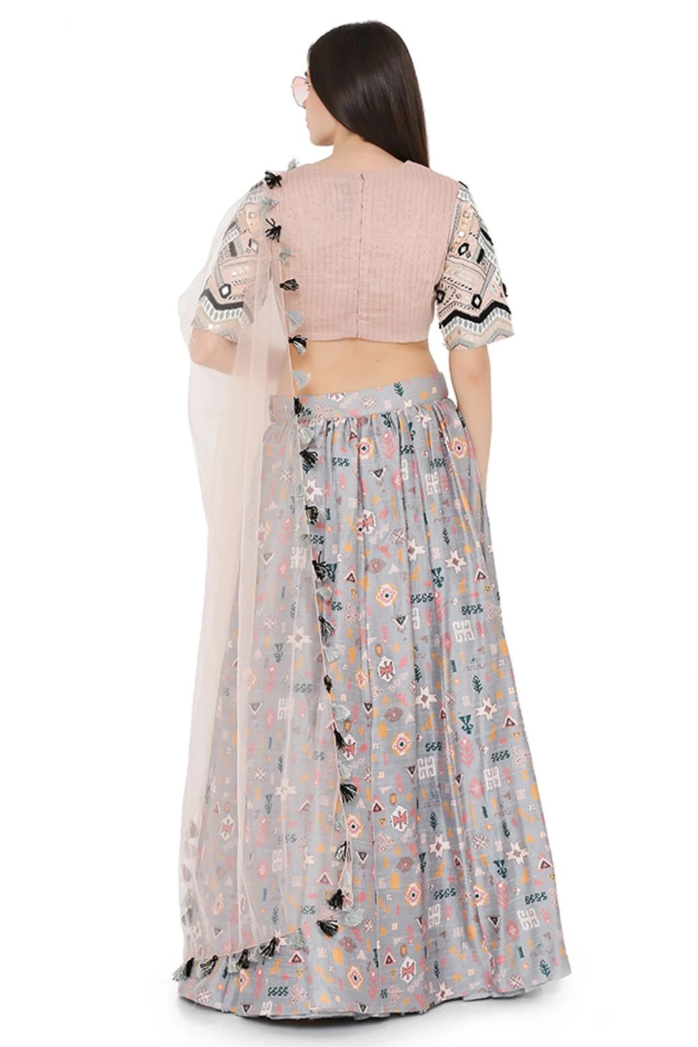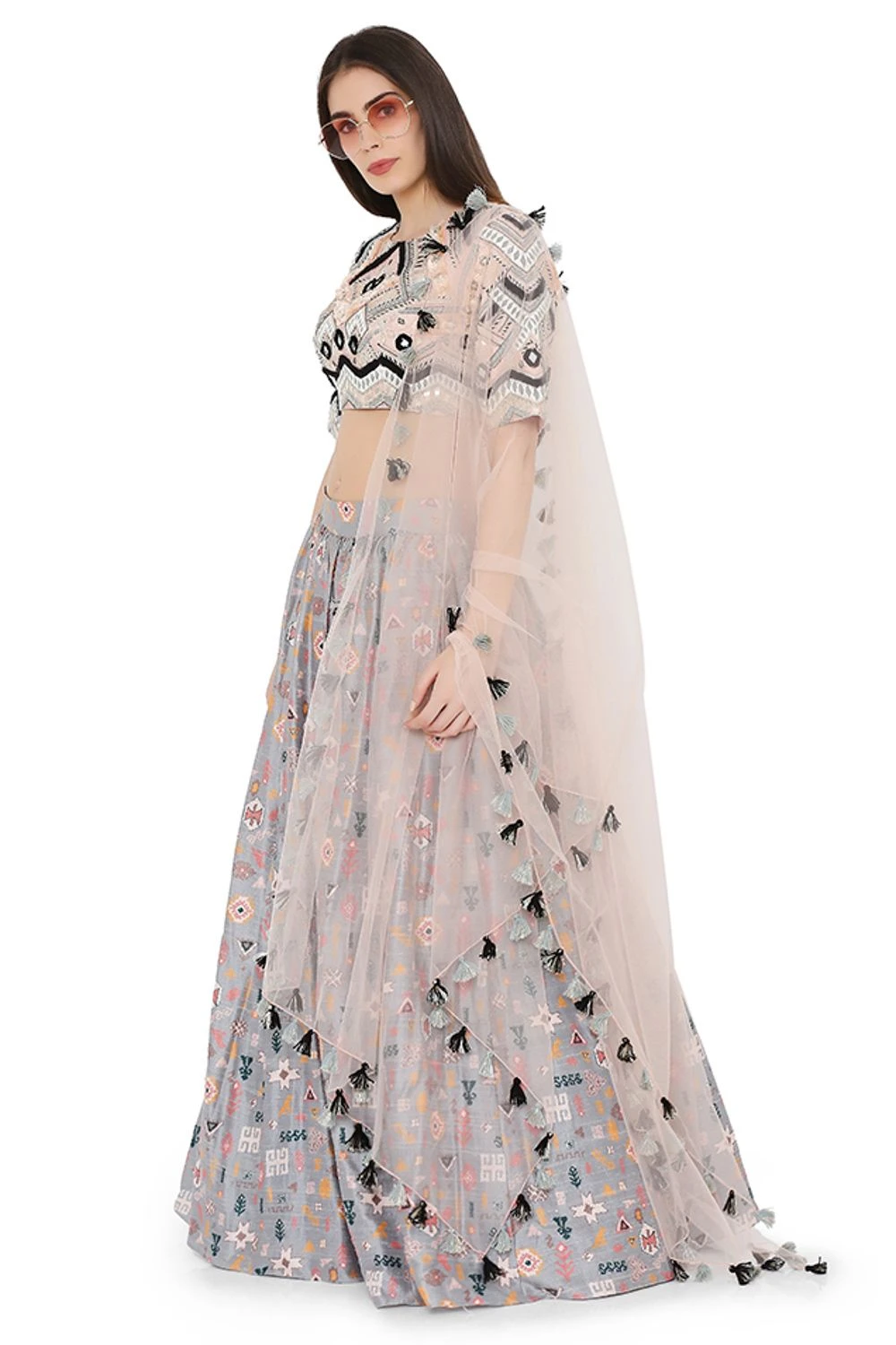 This dull lavender coloured lehenga set comes with an embroidered silk choli, net dupatta with tassel details & a grey bandhani kilim print lehenga. Style this summery set for daytime wedding events.