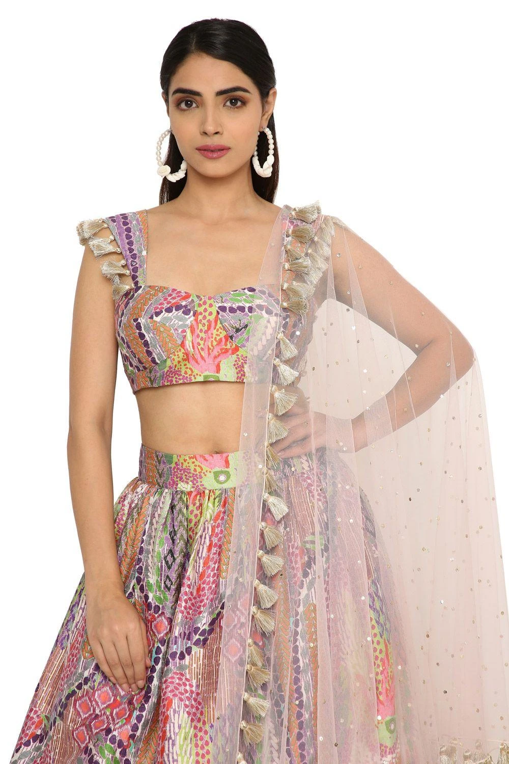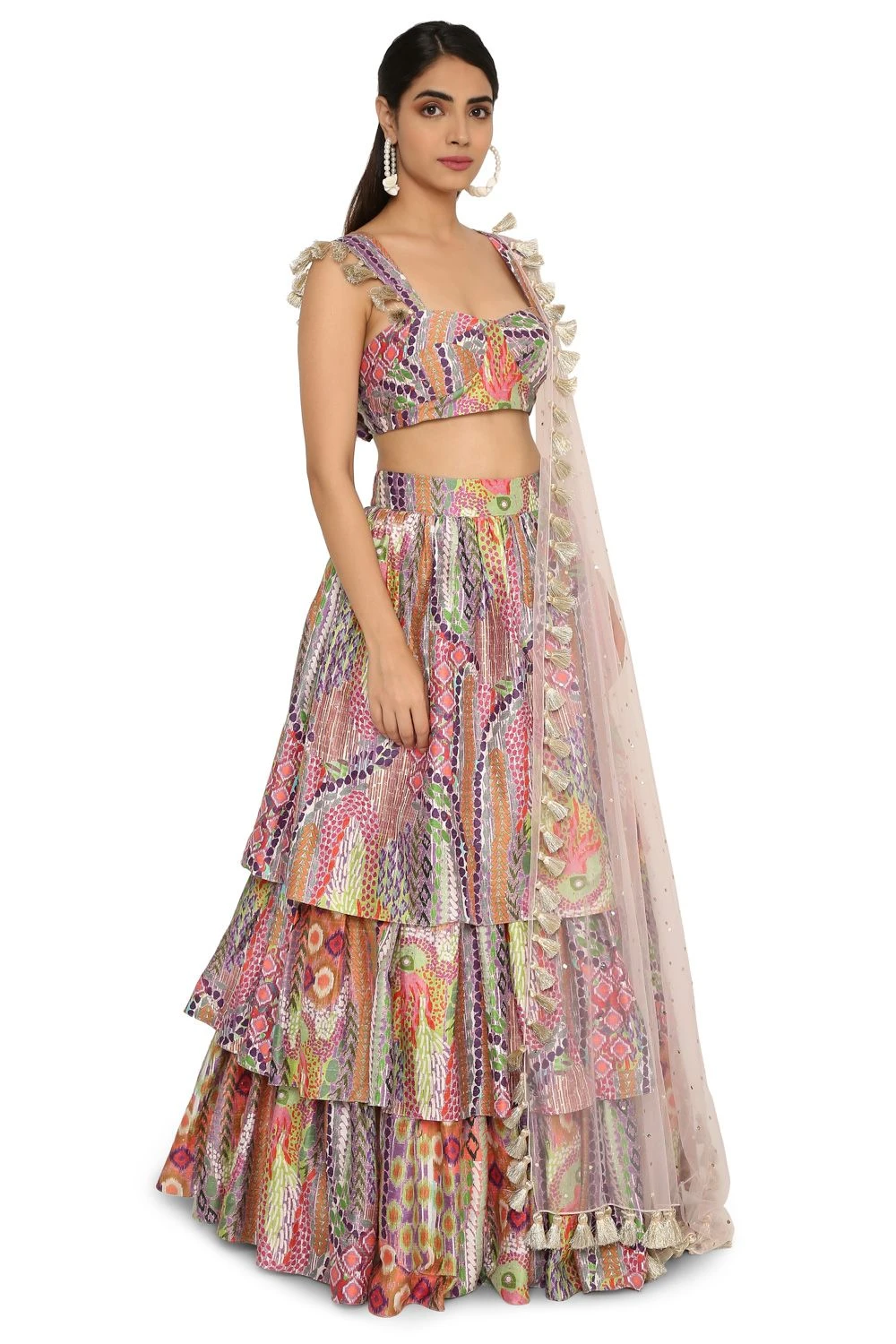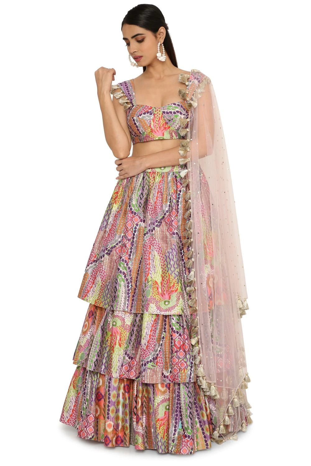Put a modern twist to your occasionwear with this tribal printed ruffled silk lehenga. It is well paired with a multi-coloured silk bustier and a baby pink mukaish net dupatta. You can style it for your mehendi function.