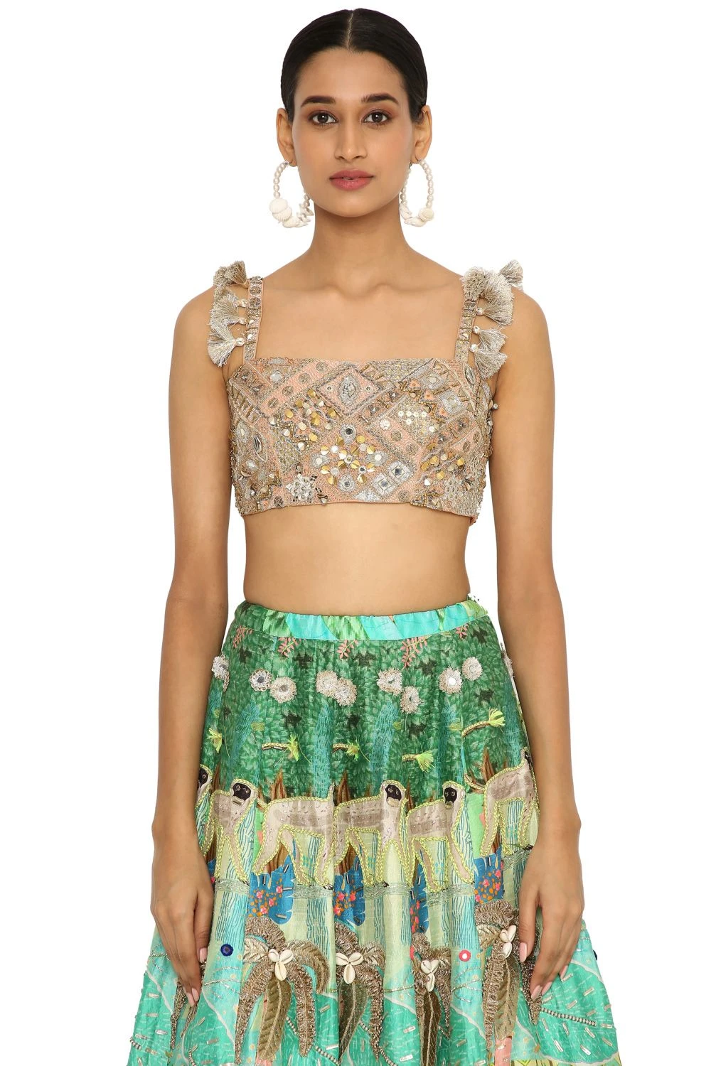 This vibrant lehenga is composed with the notes of the season, in an exuberant trail of prints & embroidery. It comes along with a hamsa embroidered bustier and a peach mukaish net dupatta with tassels.