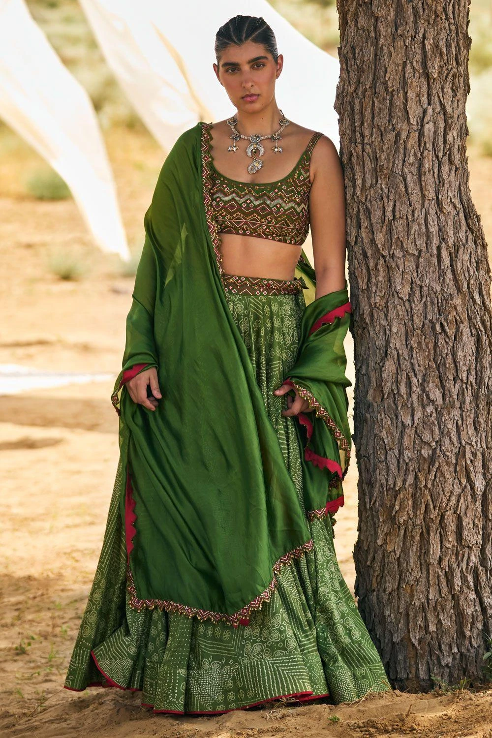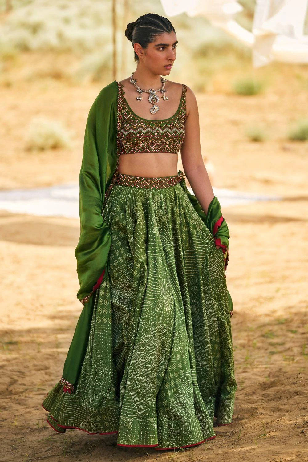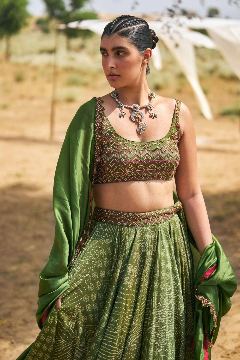 Embrace the artistry of Rajasthani heritage with this Kaccha Aam Lehenga. It beautifully weaves together eight distinct Bandhini patterns, creating a tapestry of folksy crafts with a modern twist.