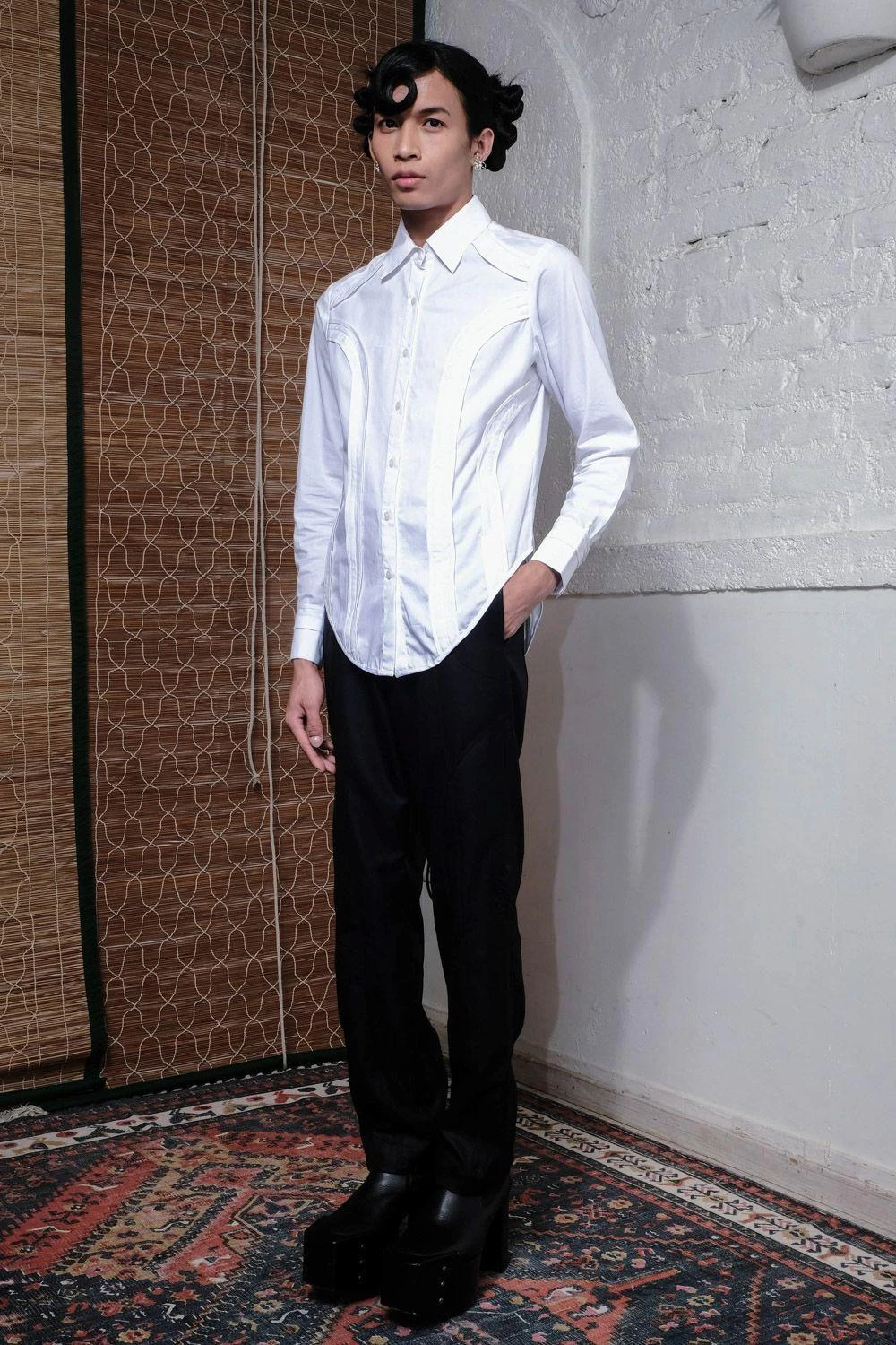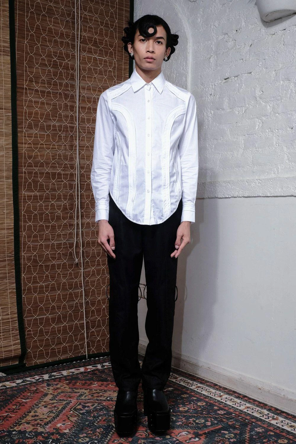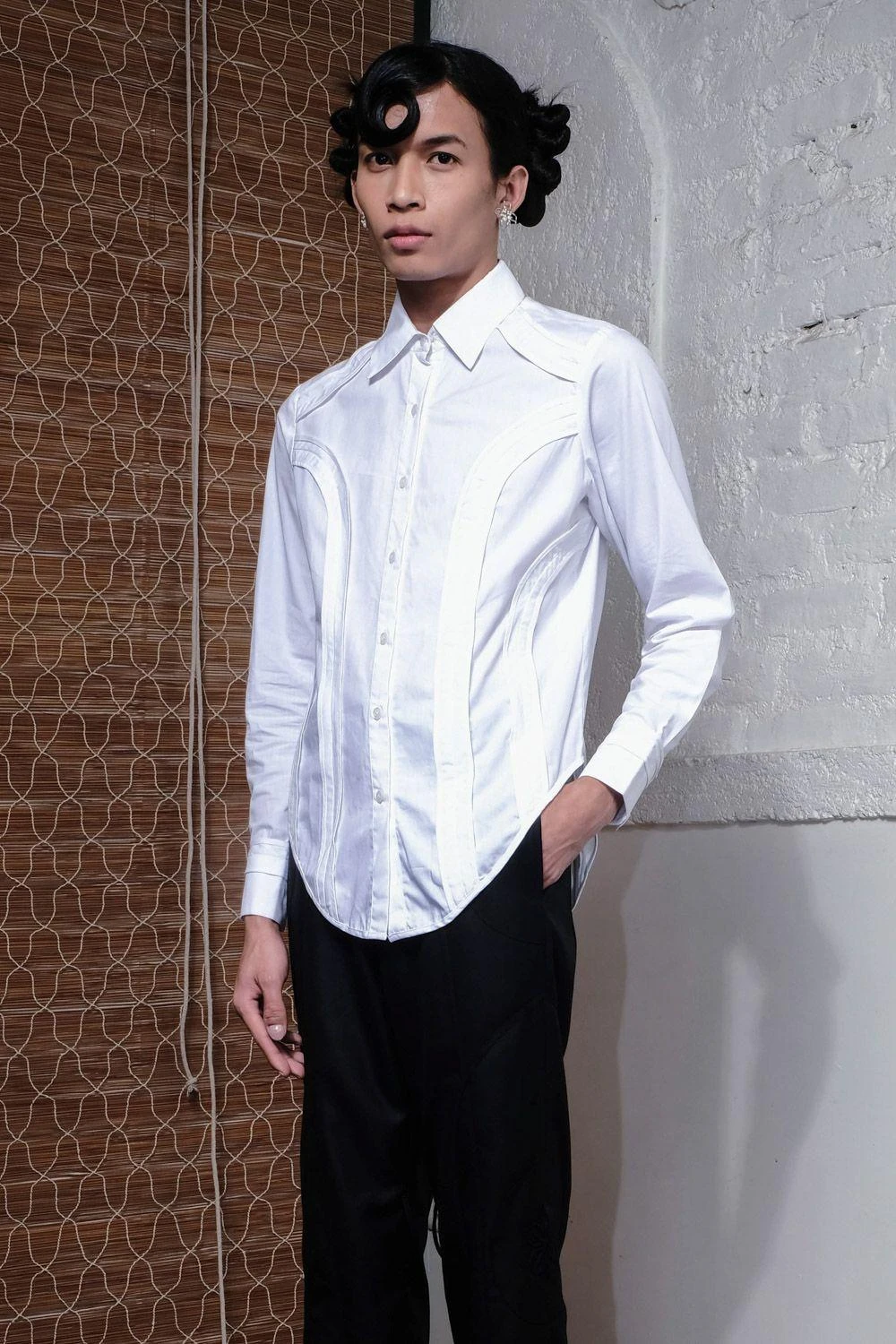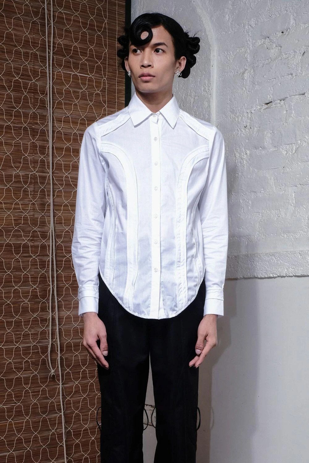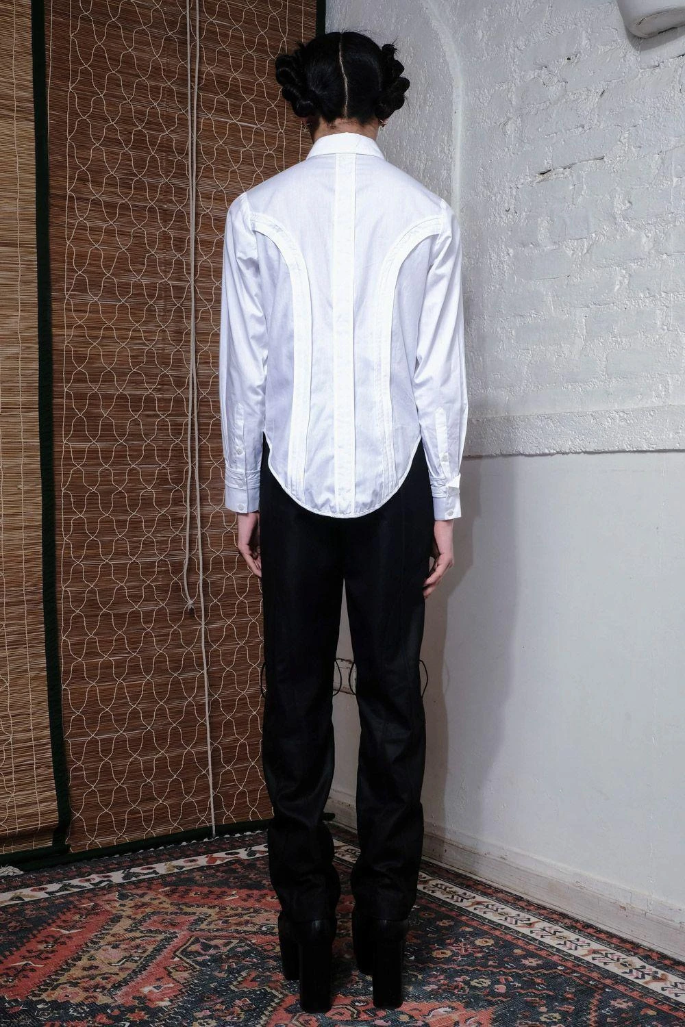 Experience timeless elegance in this white poplin shirt. Crafted with precision, shaped seams and inside-out bound seams create a distinctive appeal on both front and back.