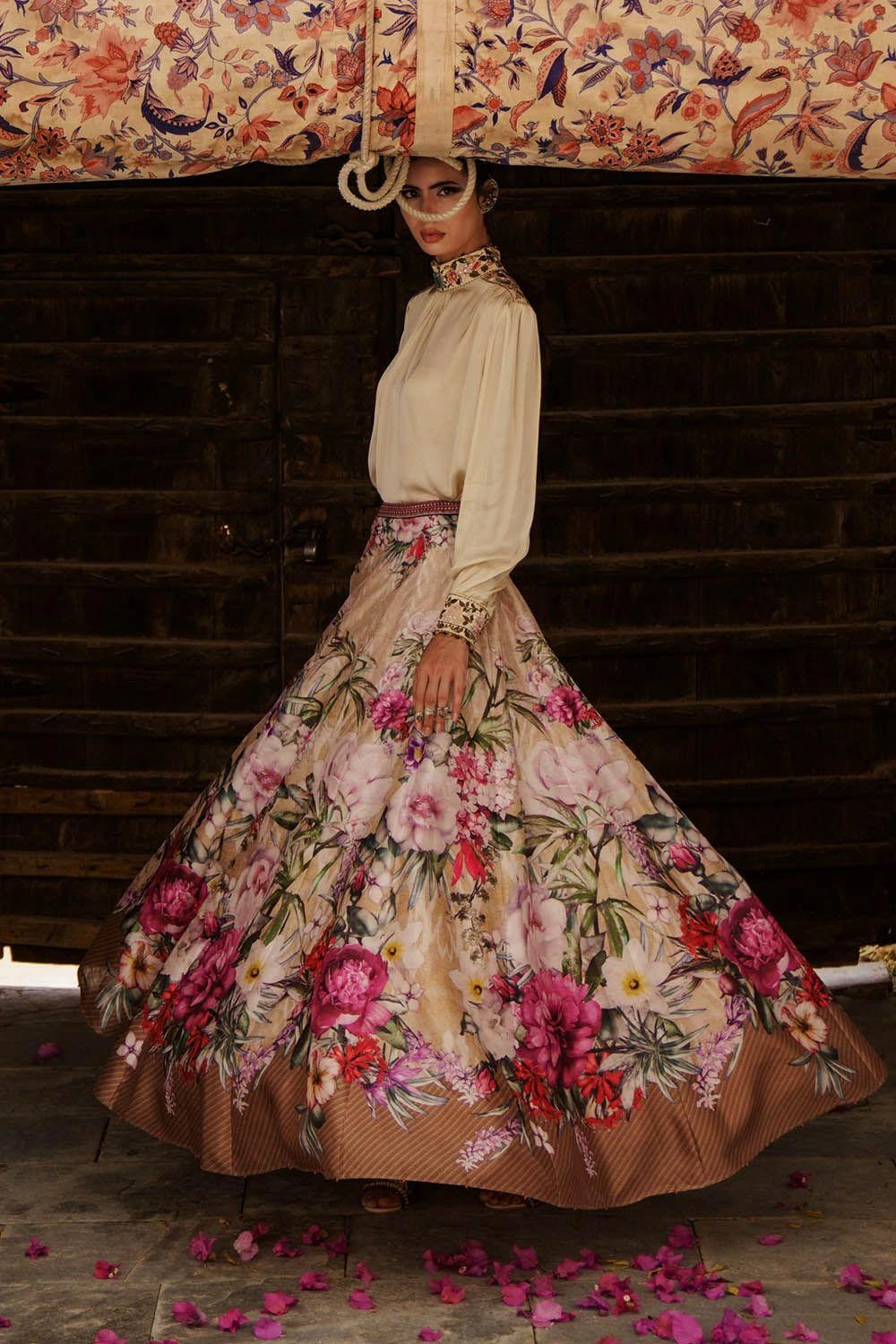This cream top with back buttons is set in pure silk. It is highlighted with a high embroidered neck and cuffs. This stylish piece can be paired with this printed lehenga or tailored pants for an ethereal look.