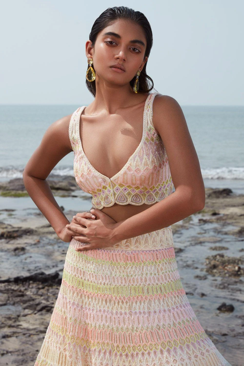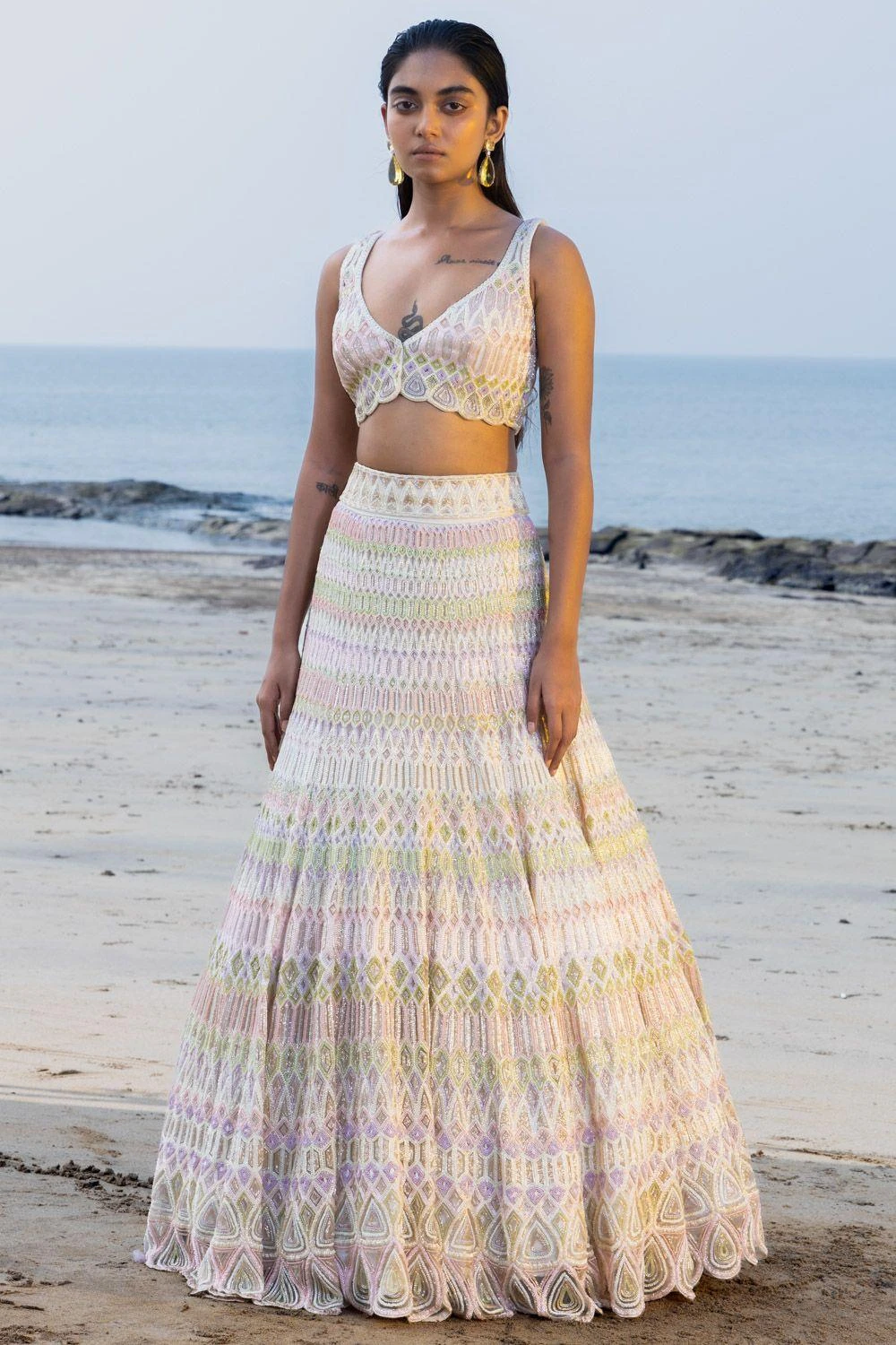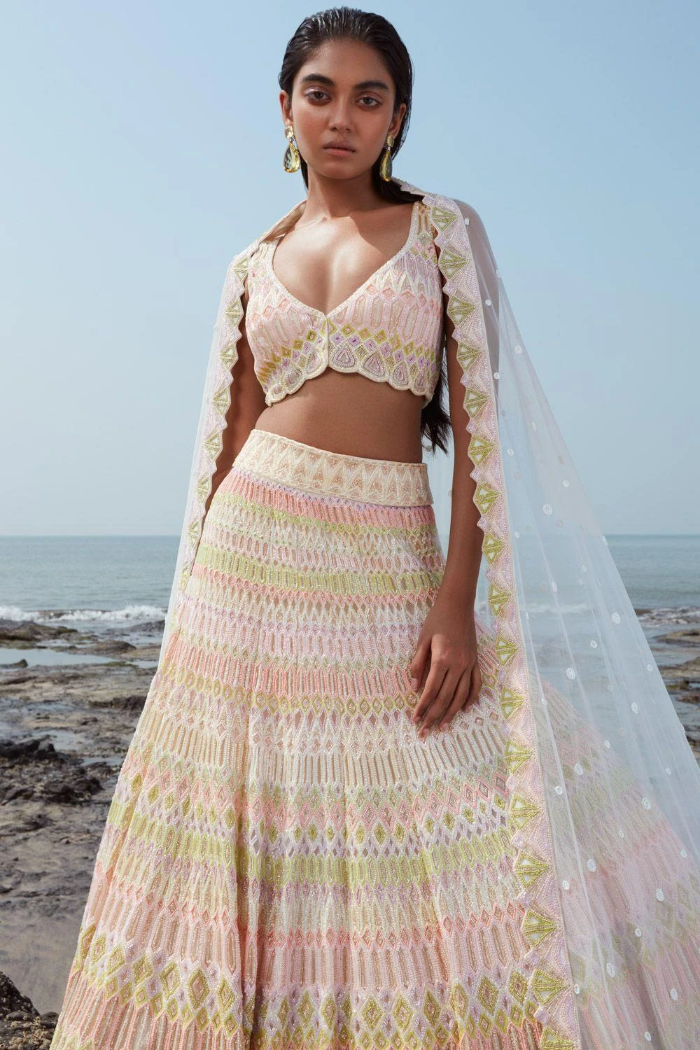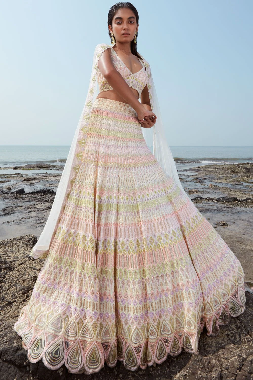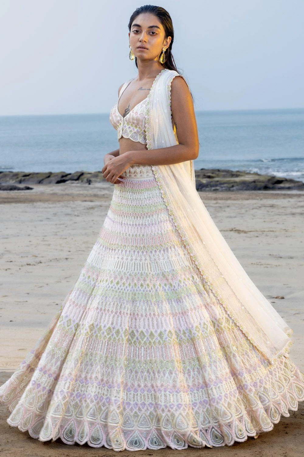 This ivory & pastel hand embroidered lehenga is perfect for spring wedding festivities. Style this ethereal set with jhumkas & a choker for a chic daytime look.