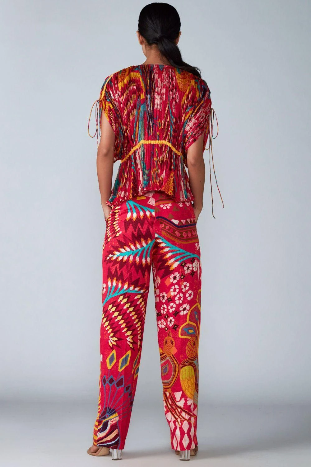 This abstract bird printed cotton silk top is crafted painstakingly using hand micro pleating technique. Style it with a skirt or matching printed trousers for a dressy daytime look.