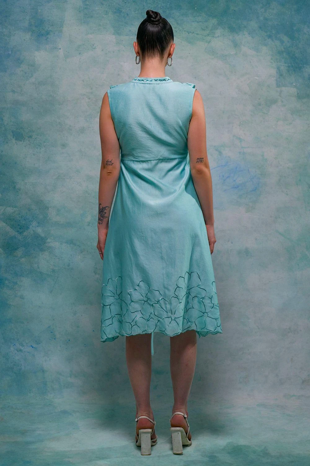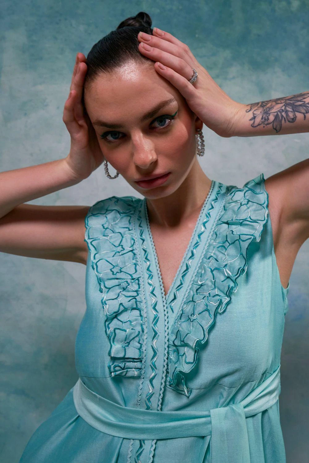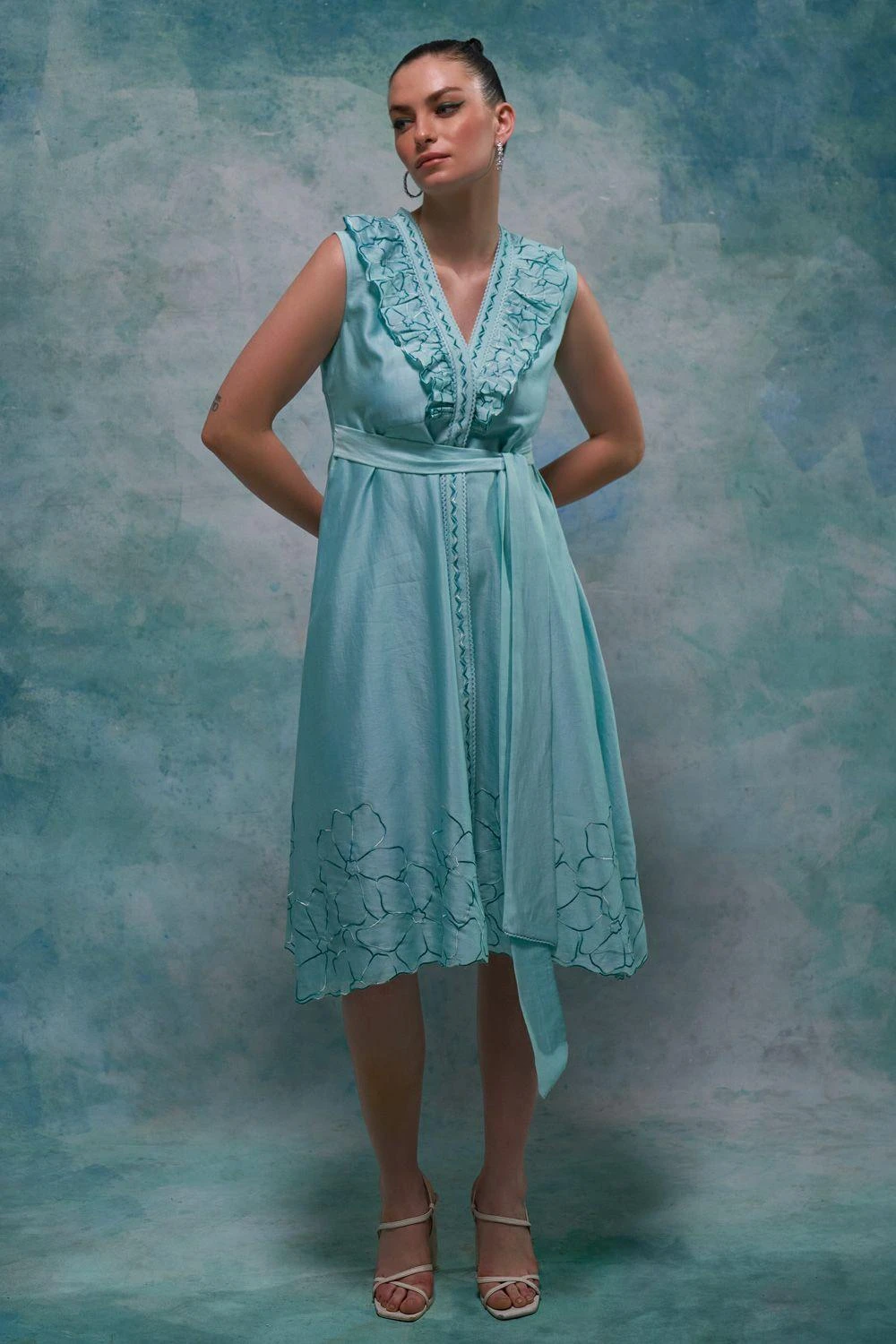 Elevate your allure in a sleeveless midi dress, adorned with a V-neck embroidered ruffle trim & a front button-up detail. The embroidered hem conceals pockets, culminating in a refined tie-upùan exquisite narrative of charm & sophistication.