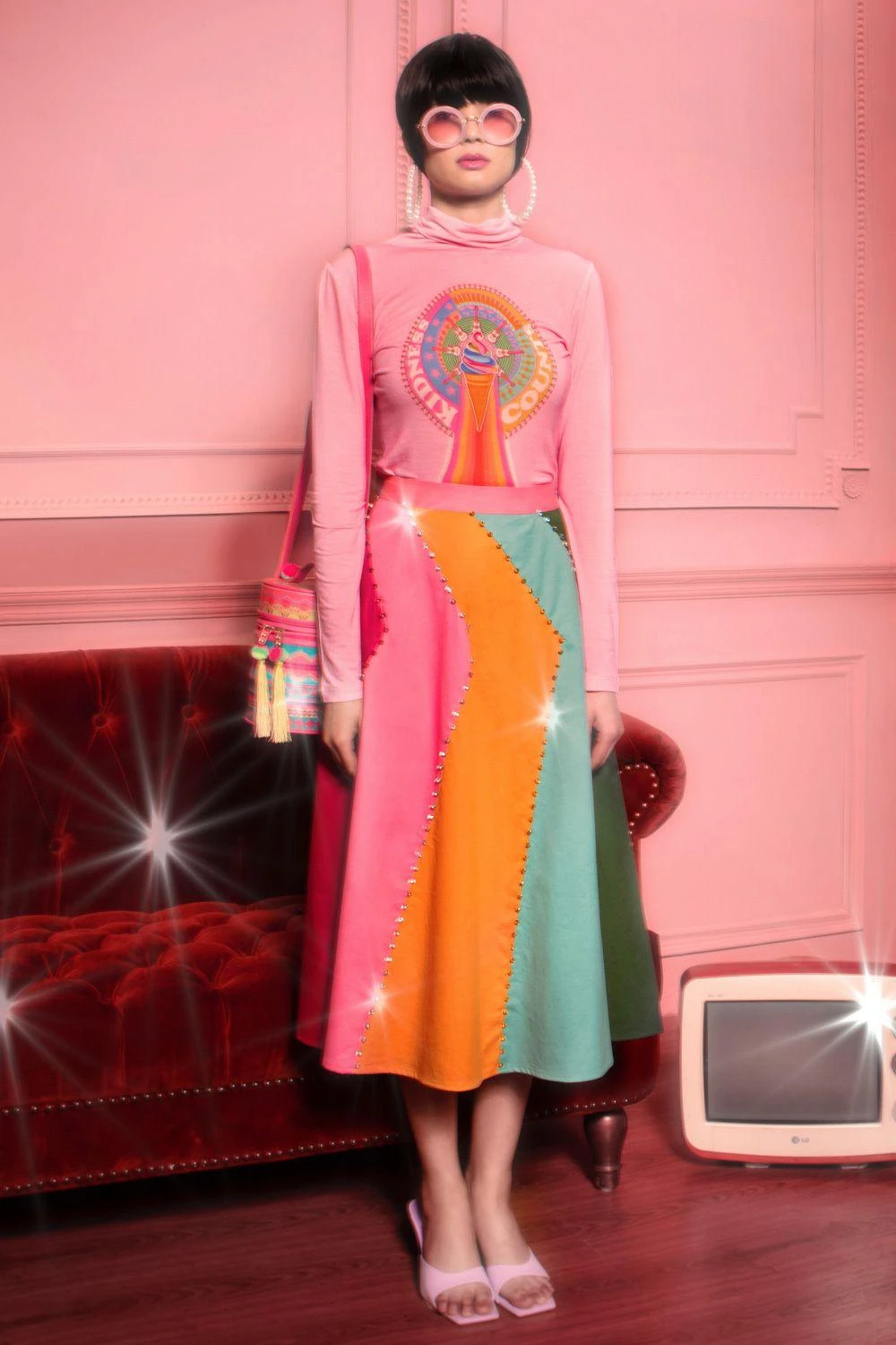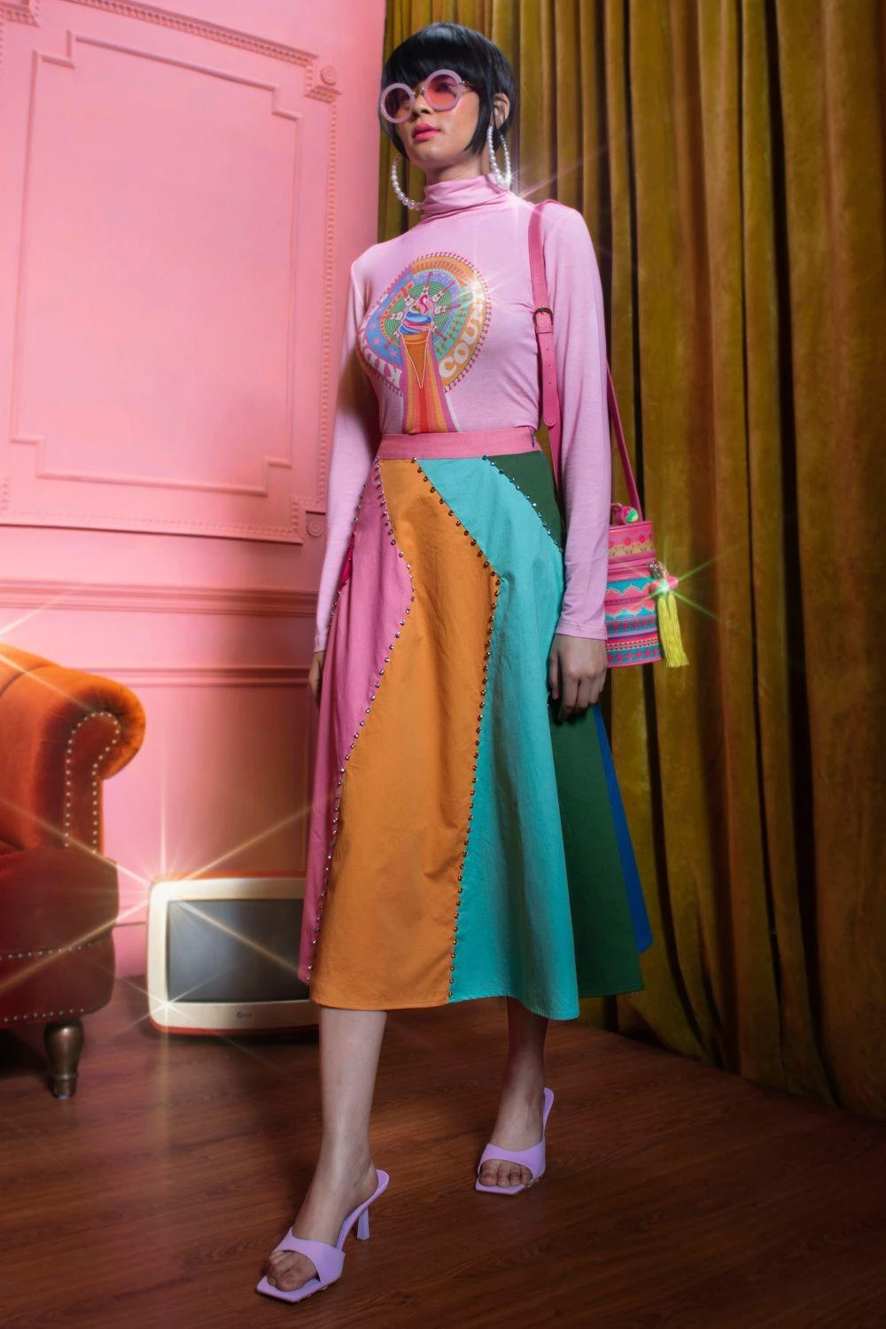 This playful multi coloured panel pleated midi skirt is perfect for the summer. Style this chic set with a top or bustier for a casual daytime look.