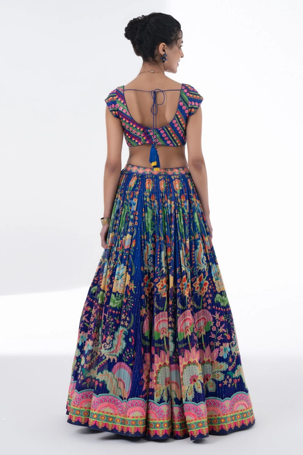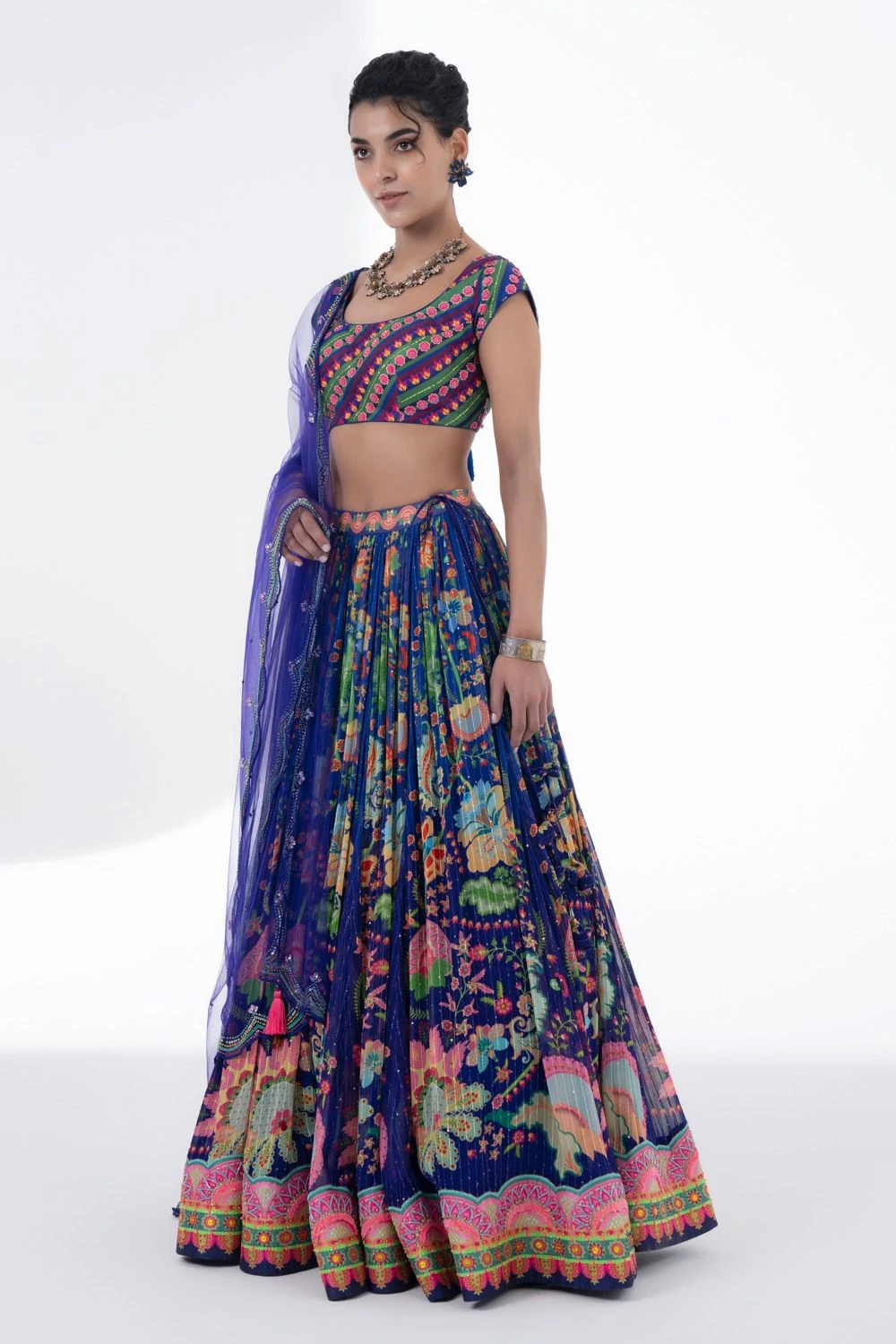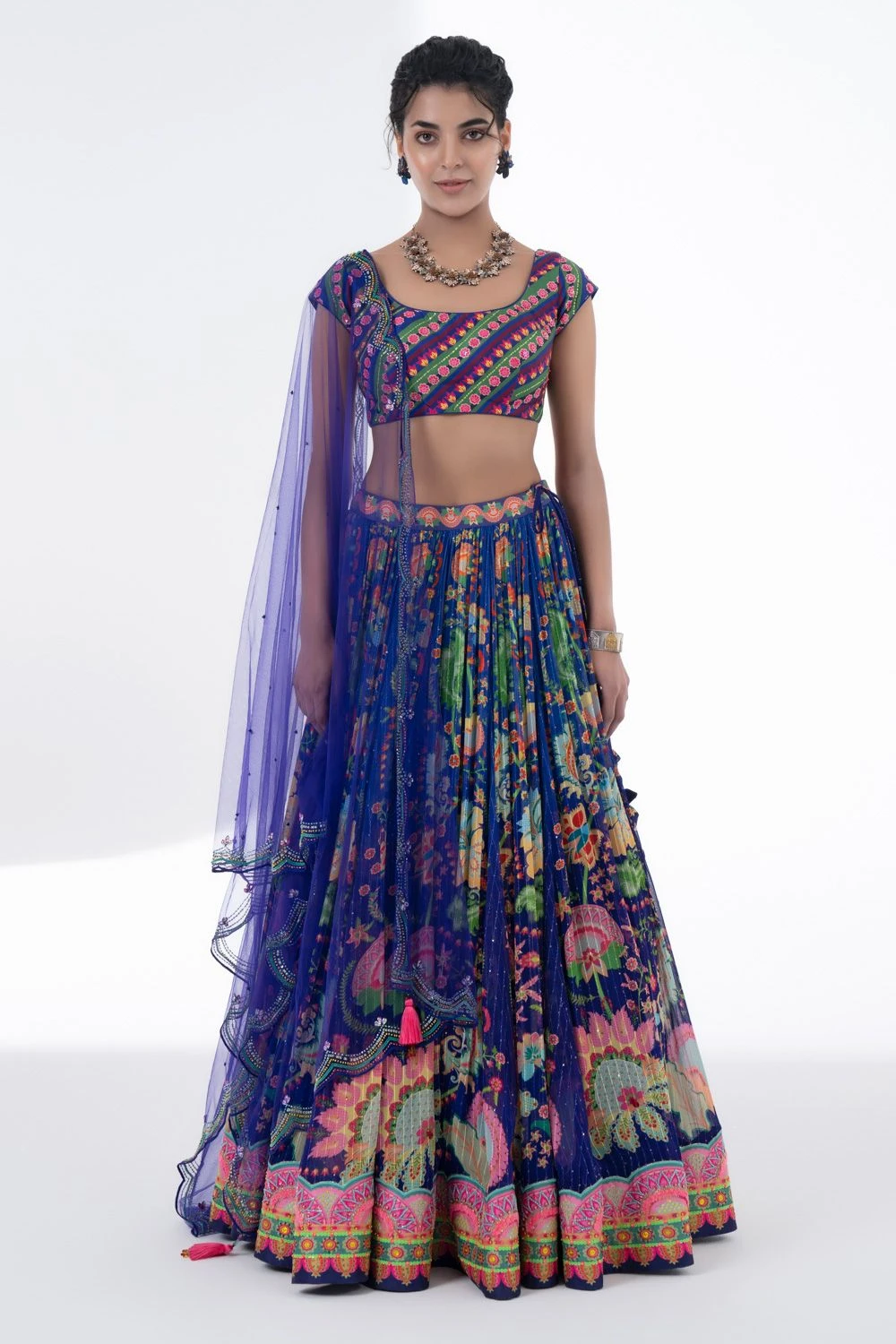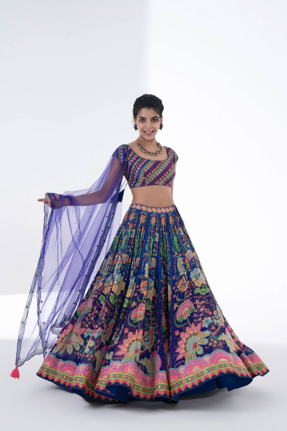 Step into style with this exquisite lehenga set. Intricate floral & geometric prints, delicate hand embroidery, paired with a blouse & scallop-edged dupatta. Elevate soirÒes or make a statement at elite gatherings. Timeless grace, redefined.