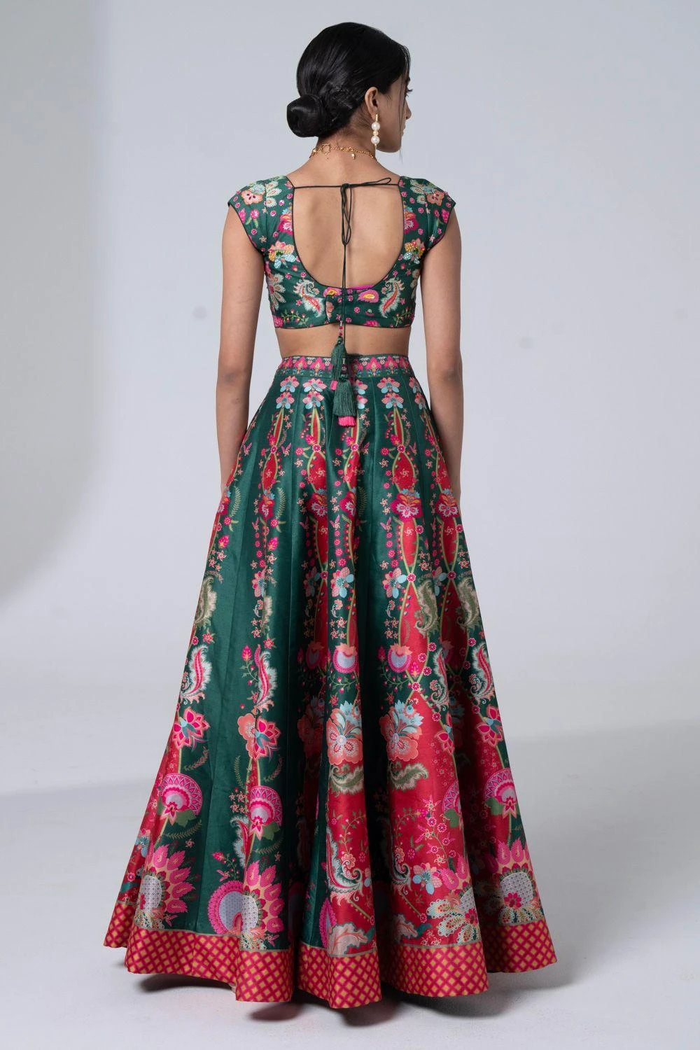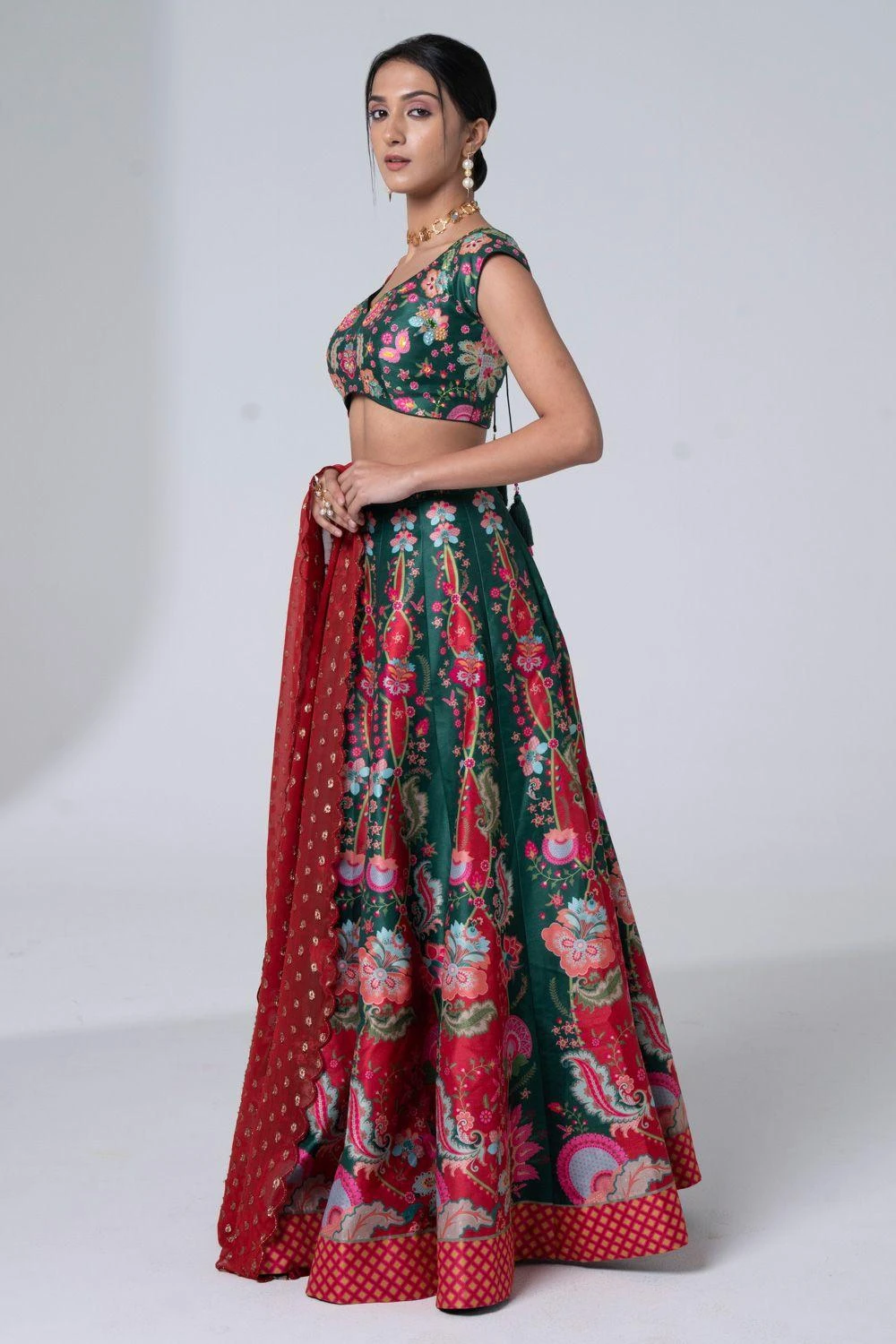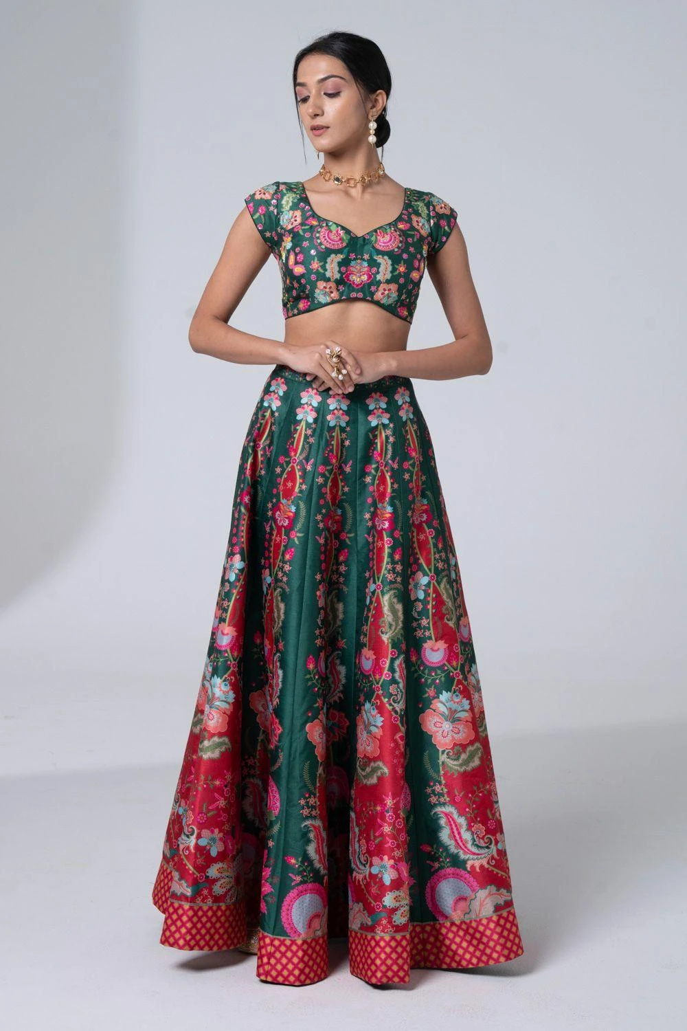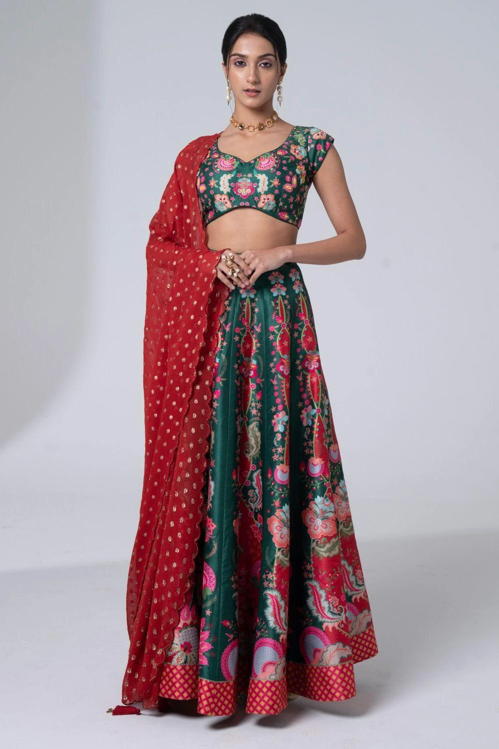 Step into style with this exquisite lehenga set. Intricate floral & geometric prints, delicate hand embroidery, paired with a blouse & scallop-edged dupatta. Elevate soirÃ’es or make a statement at elite gatherings. Timeless grace, redefined.
