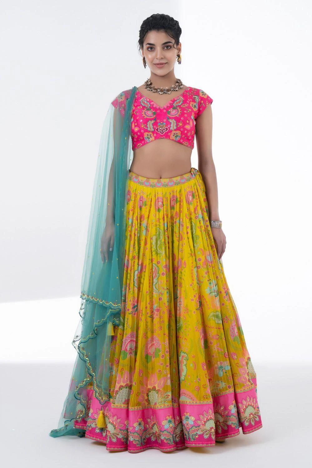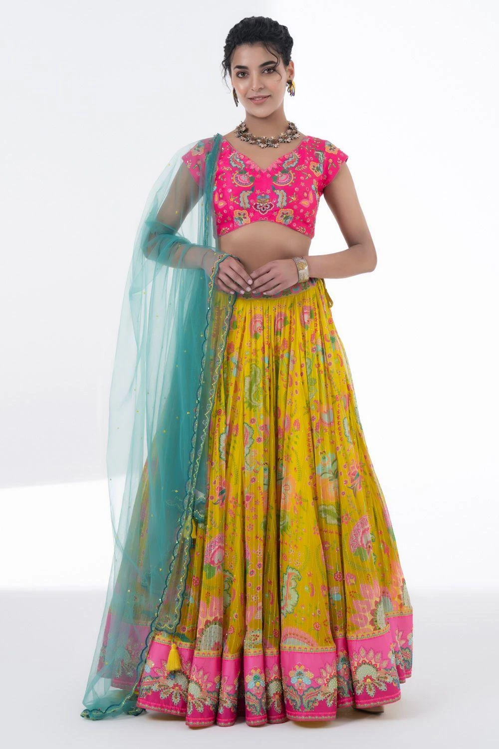Step into elegance with this exquisite lehenga set. Intricate floral & geometric prints, delicate hand embroidery, paired with a blouse & scallop-edged dupatta. Elevate soirÃ’es or make a statement at elite gatherings. Timeless grace, redefined.