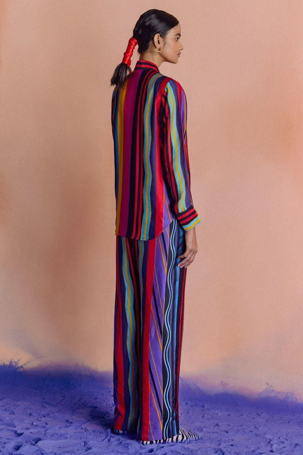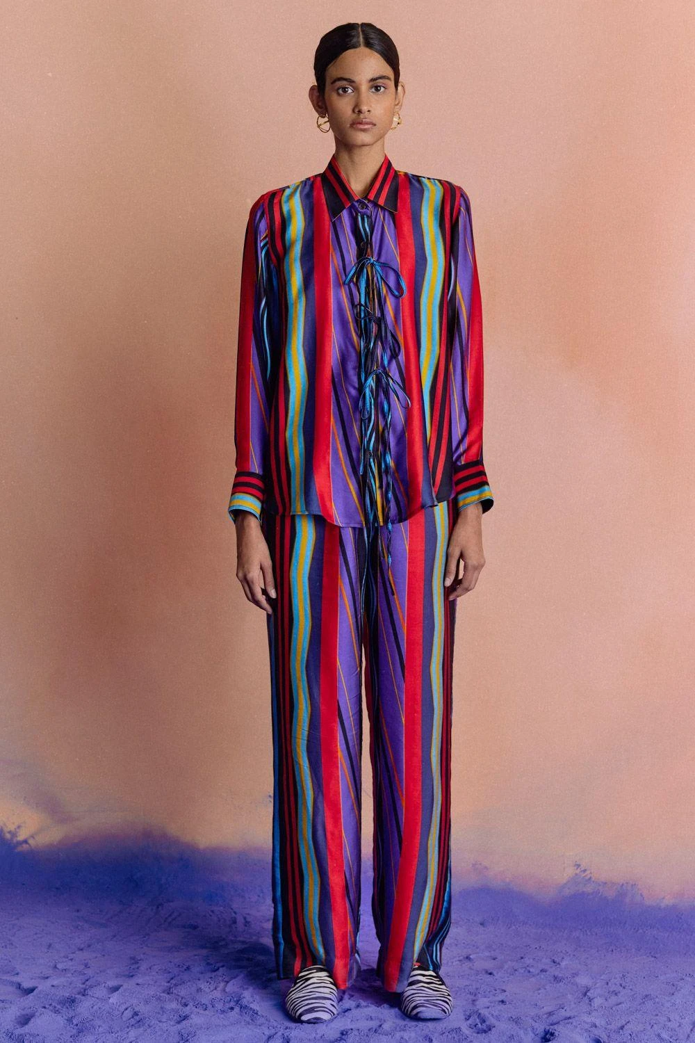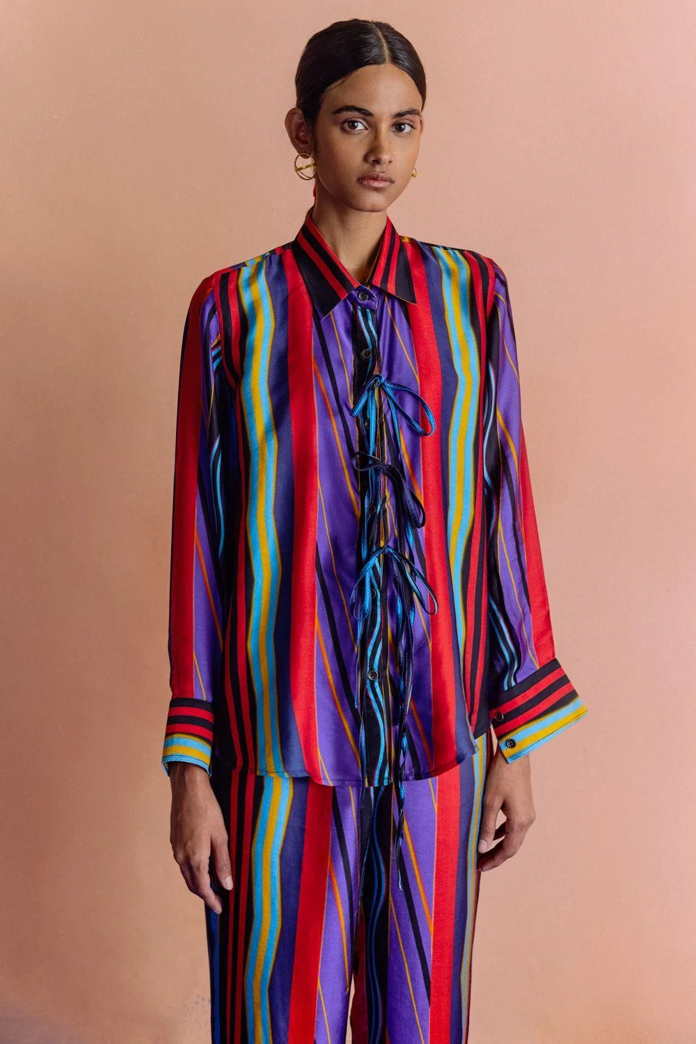 For your fashion forward taste, this dhari shirt will make a perfect addition. It is mindfully crafted in vegan silk fabric and printed in eclectic leheriya. The knots on the front placket adds an interesting element to this look.
