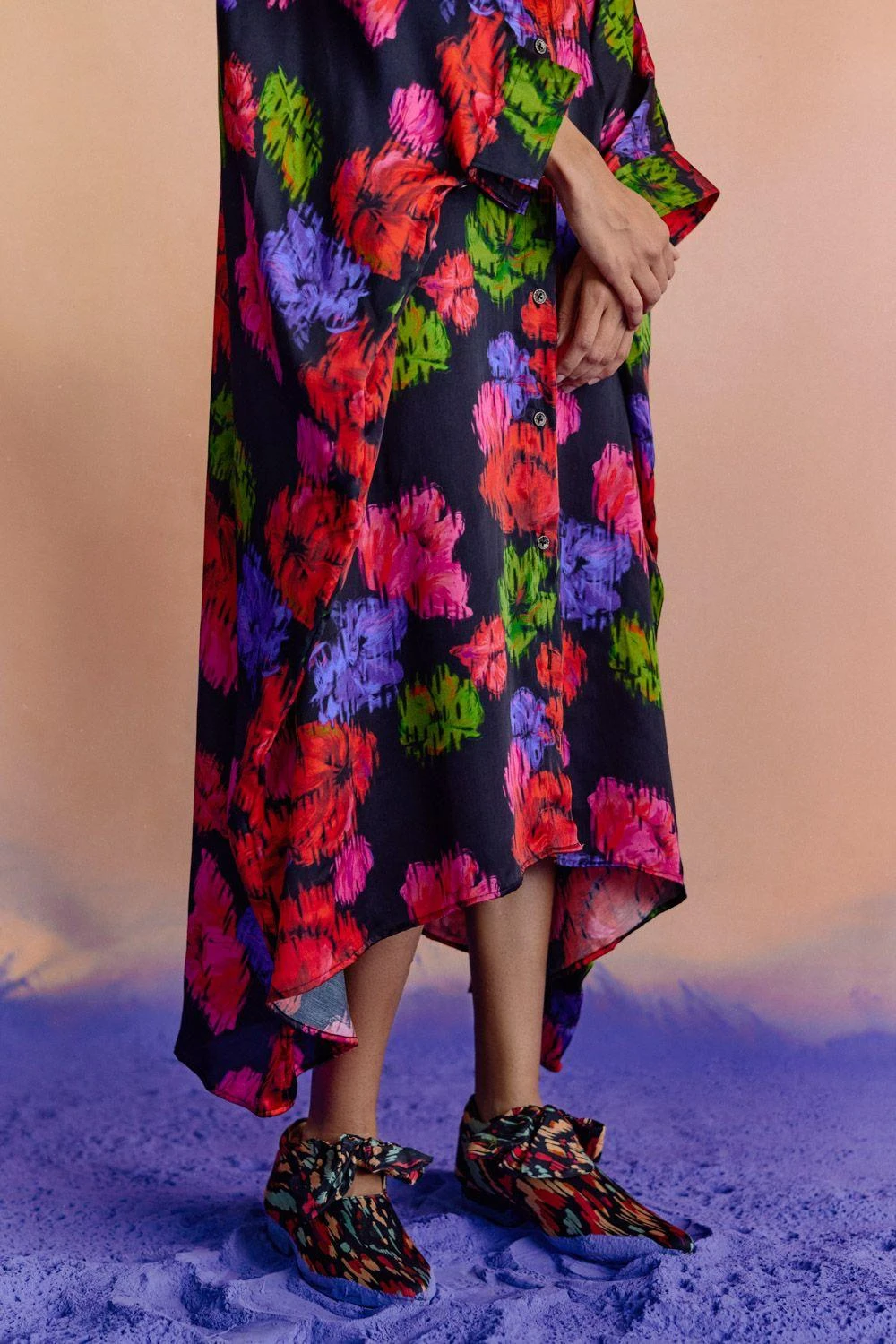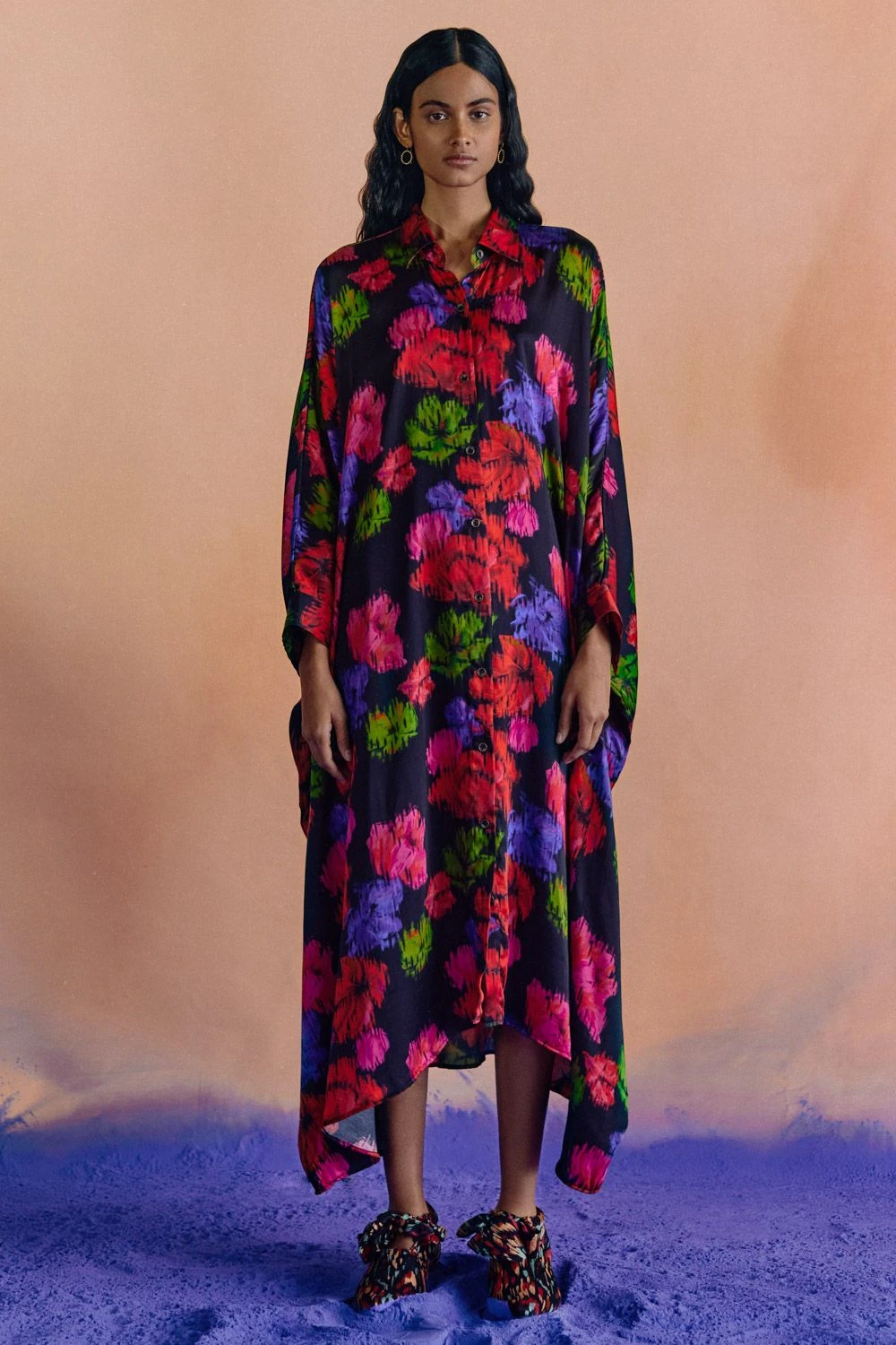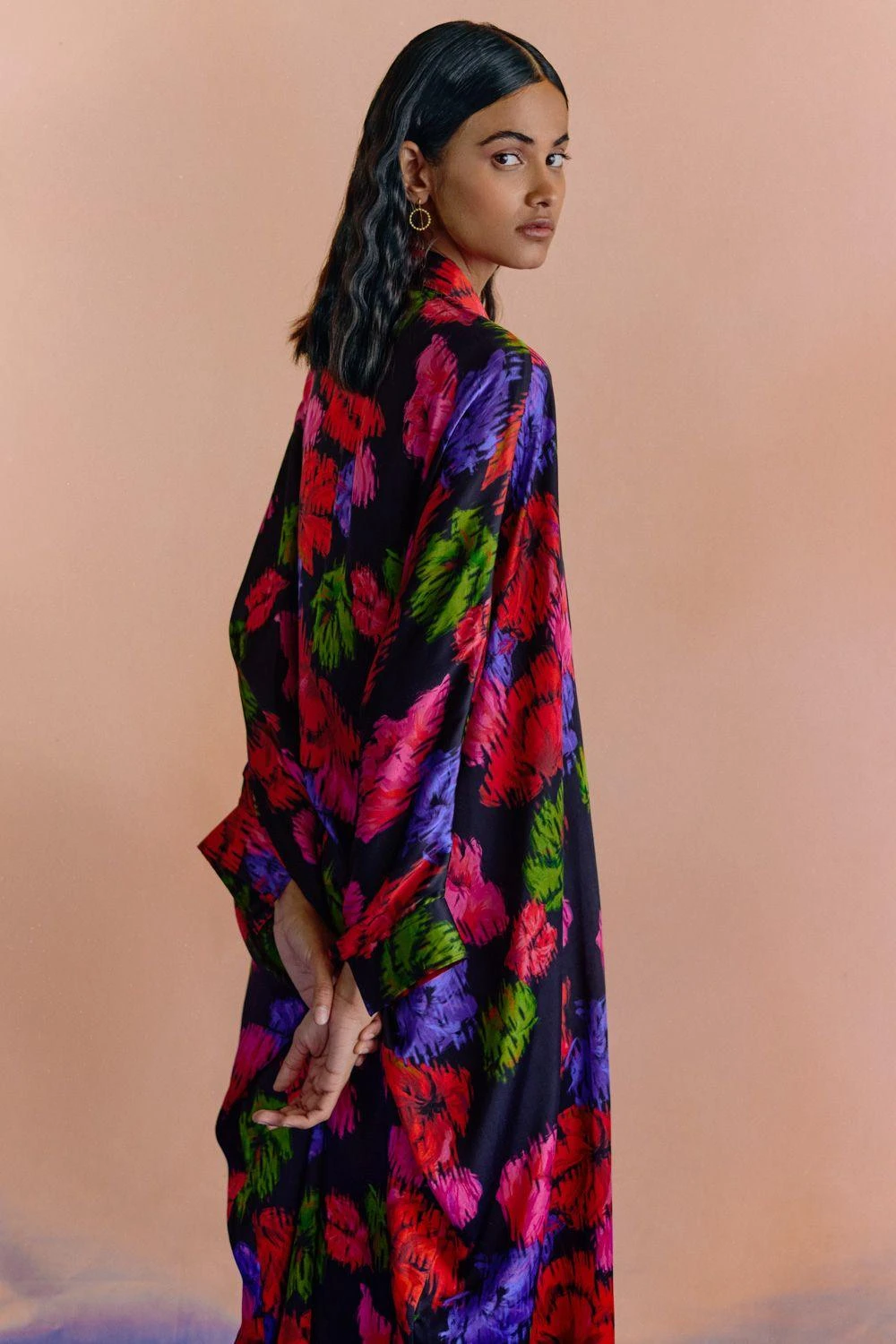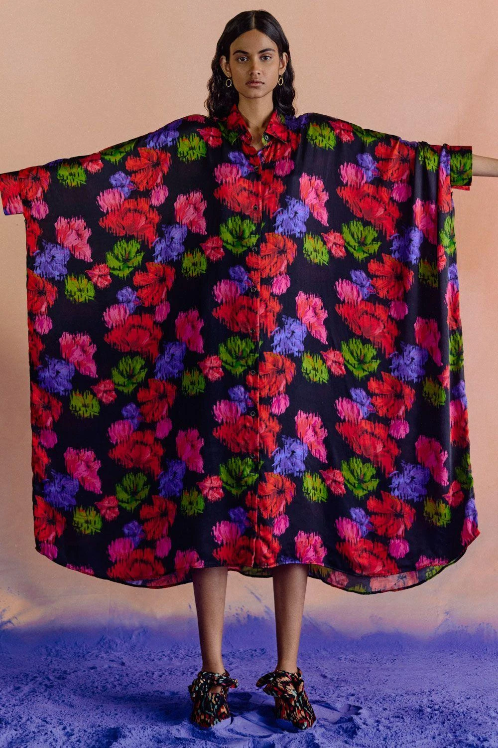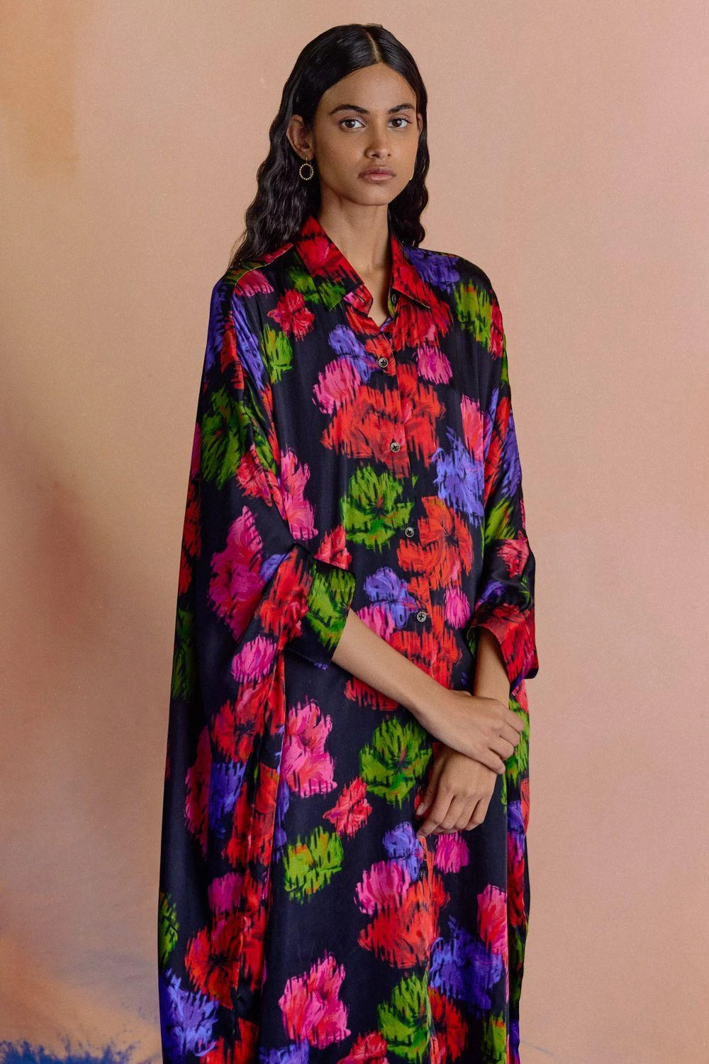 This kalora kimono dress is consciously crafted in digitally printed vegan silk with dystopian floral print. This relaxed fit piece is perfect to transition from day to evening in ease & style. Style it with a pair of statement earrings.