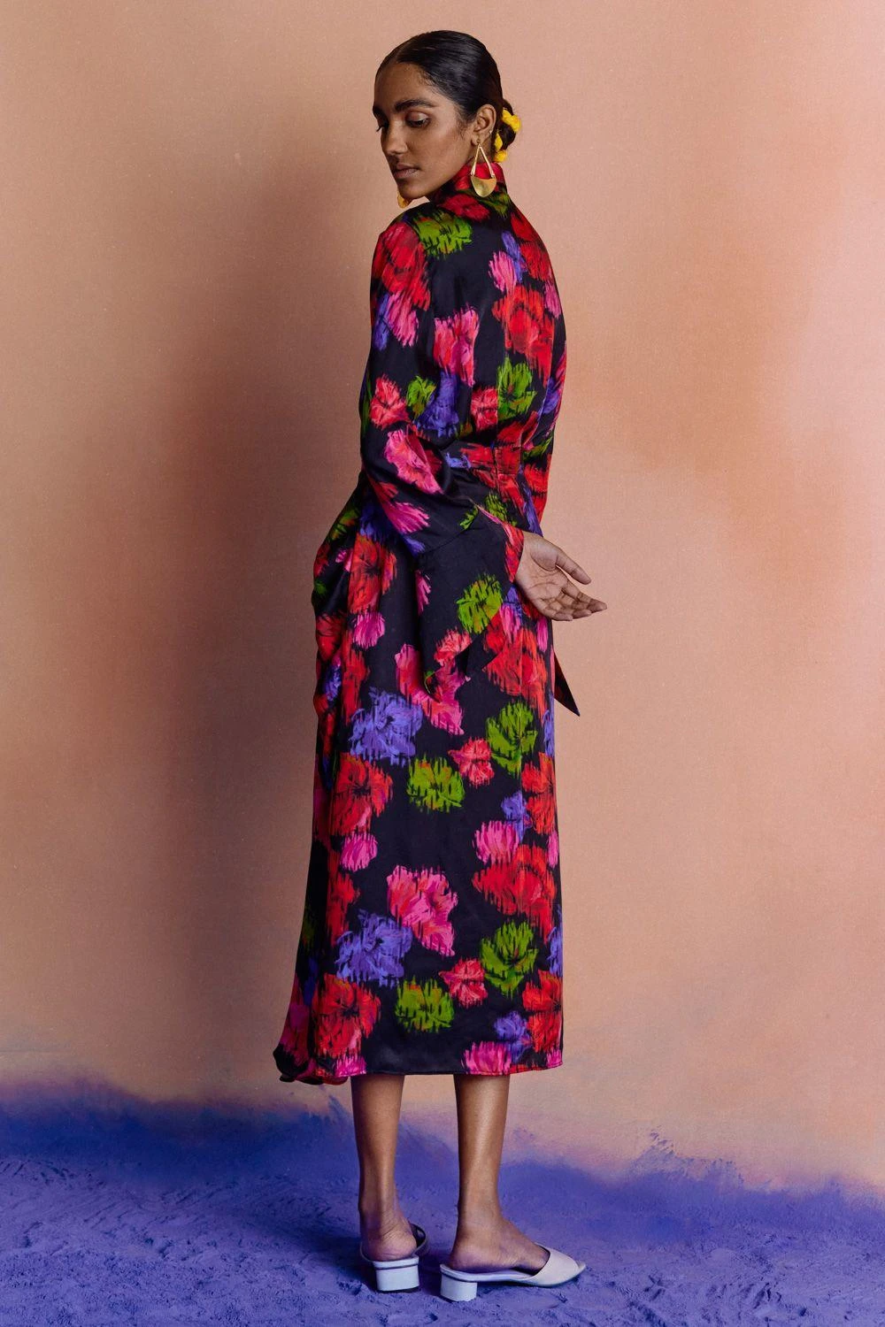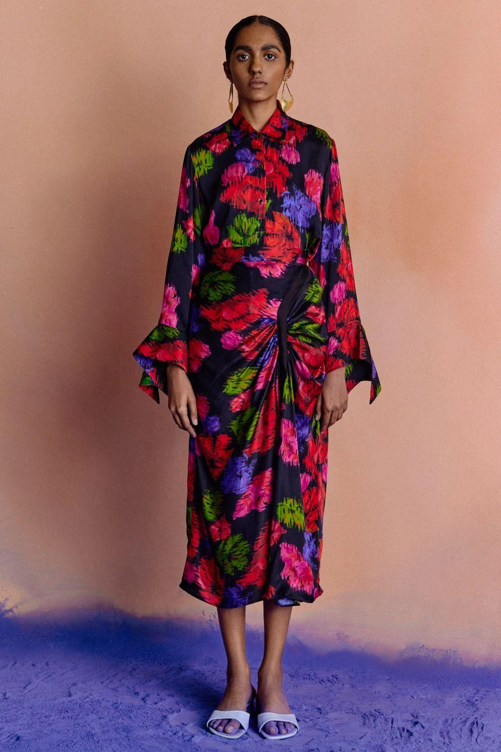 This kalora shirt in vibrant print is a must have holiday piece. This trans-seasonal piece is crafted in vegan silk in dystopian floral print. It features a statement draped cuff with metallic button details. Style it with a coordinating skirt.