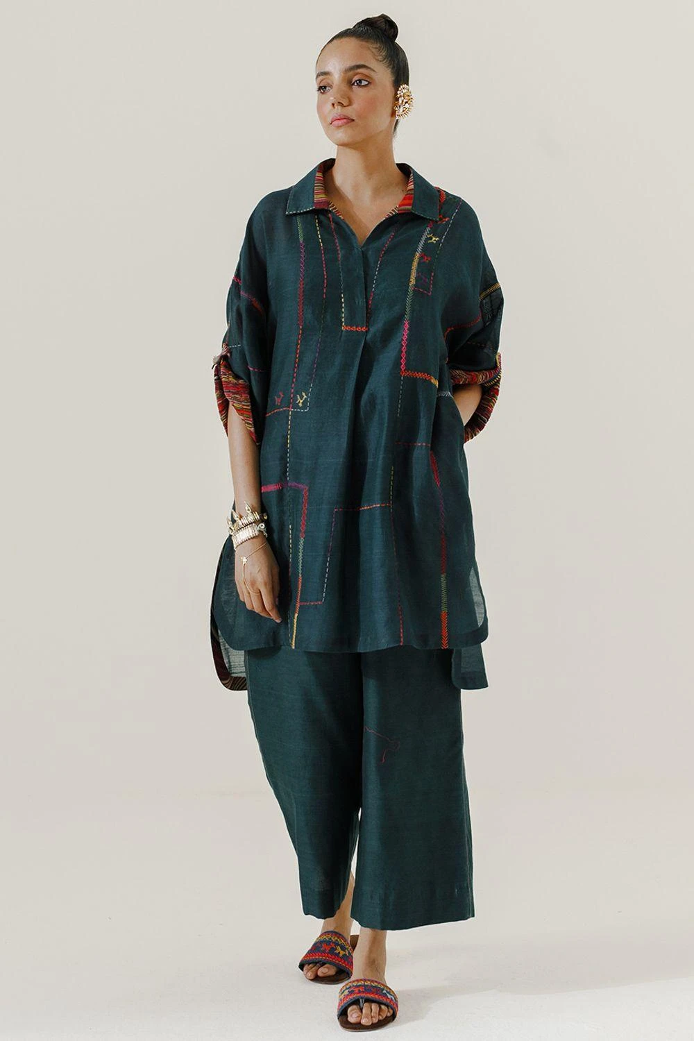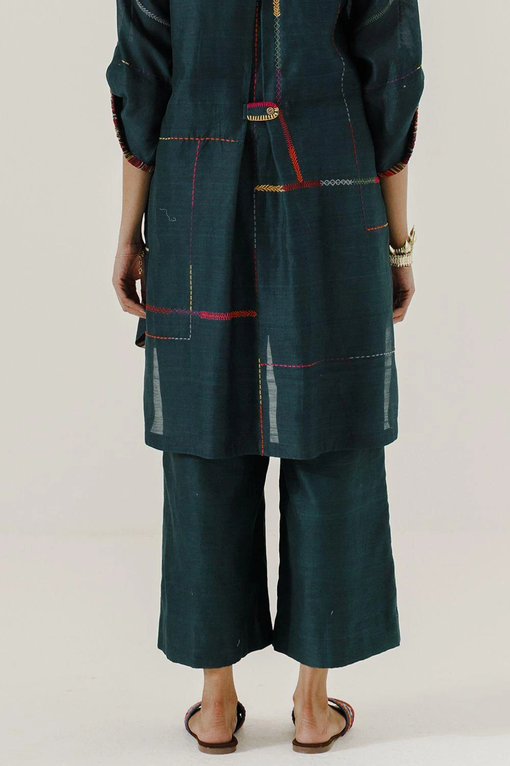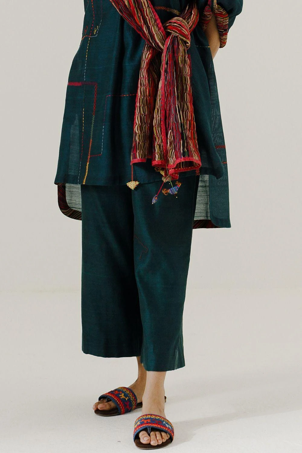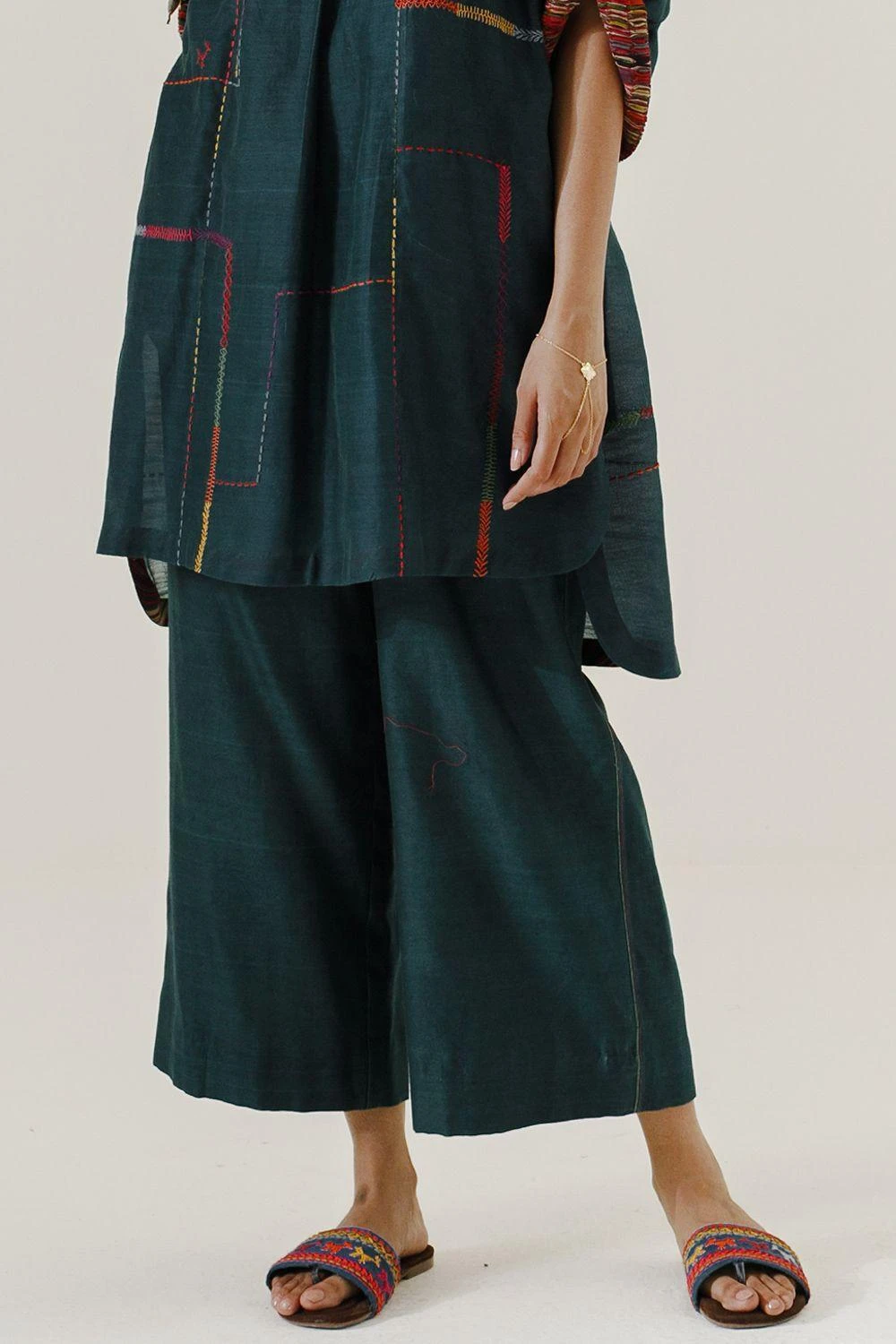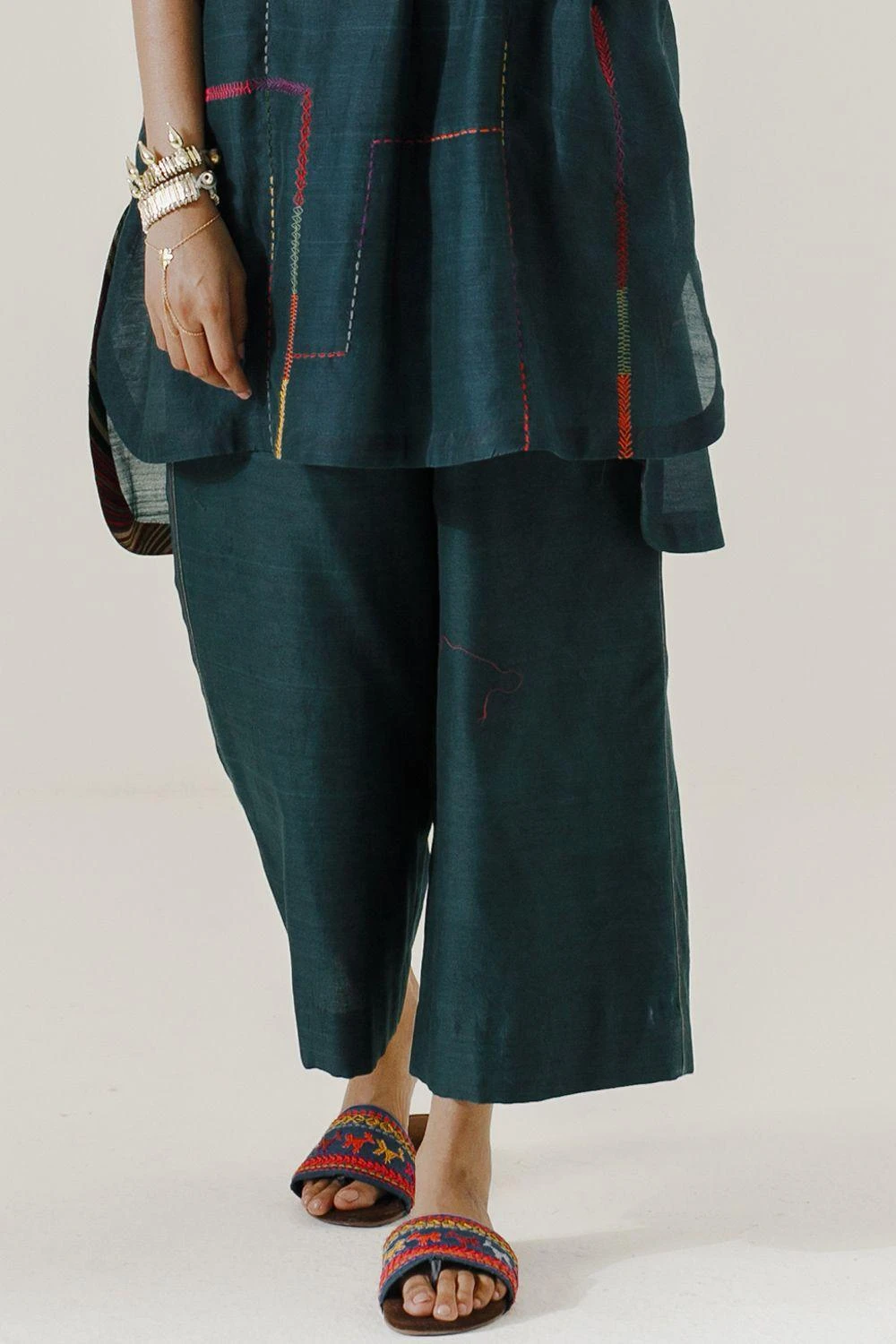 Crafted in handwoven chanderi, these green mool ijar pants feature a hand block print with an elastic waist band at the back and drawstring at the front for maximum comfort. Style these with the green high low kurta to complete the set.
