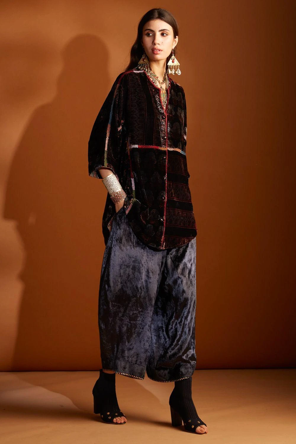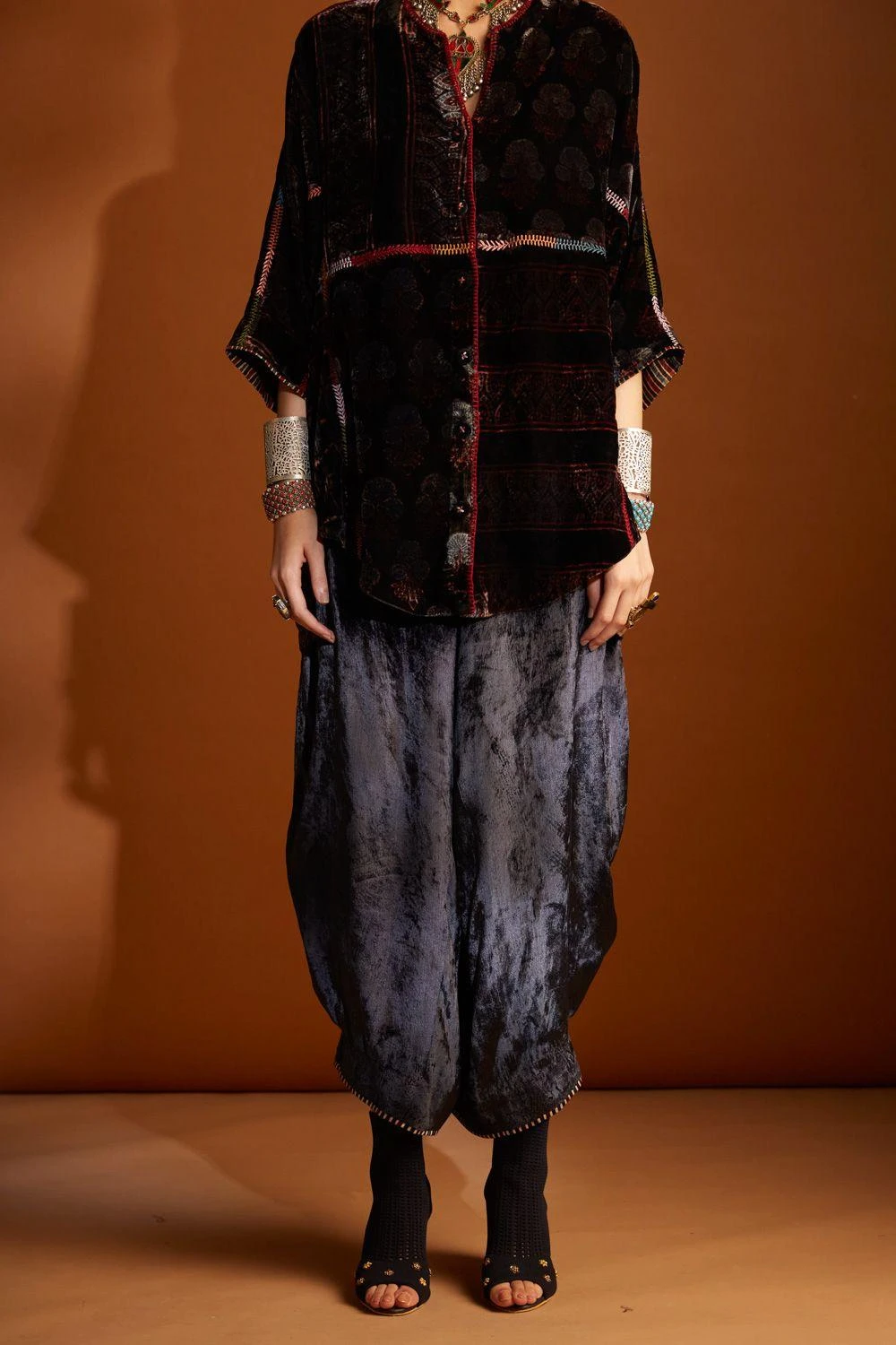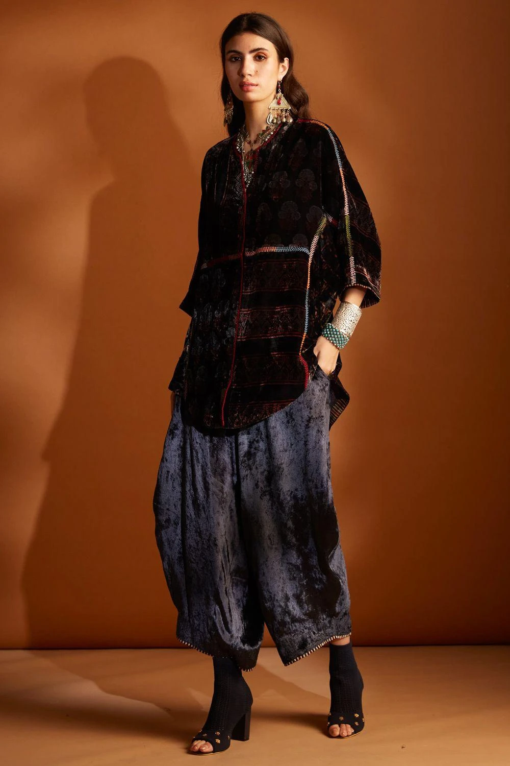 These wide legged cowl pants are crafted in luxurious velvet with ajrakh hand-block prints. It features a drawstring and elastic band at the back for a comfortable fit. Style them with a coordinating kurta from the collection.
