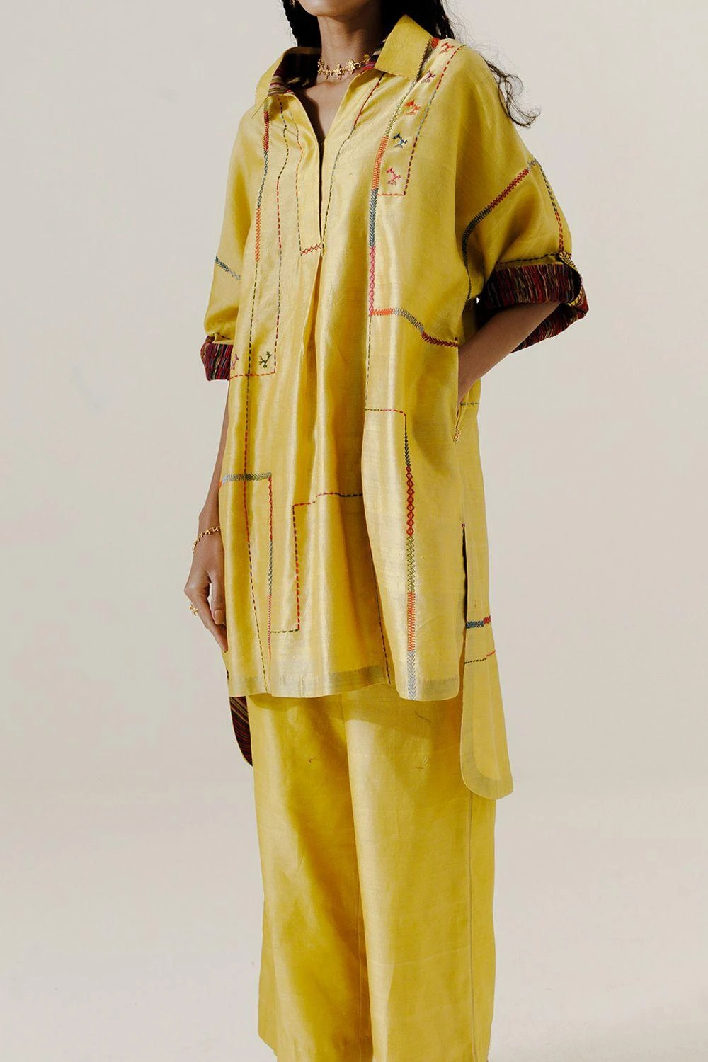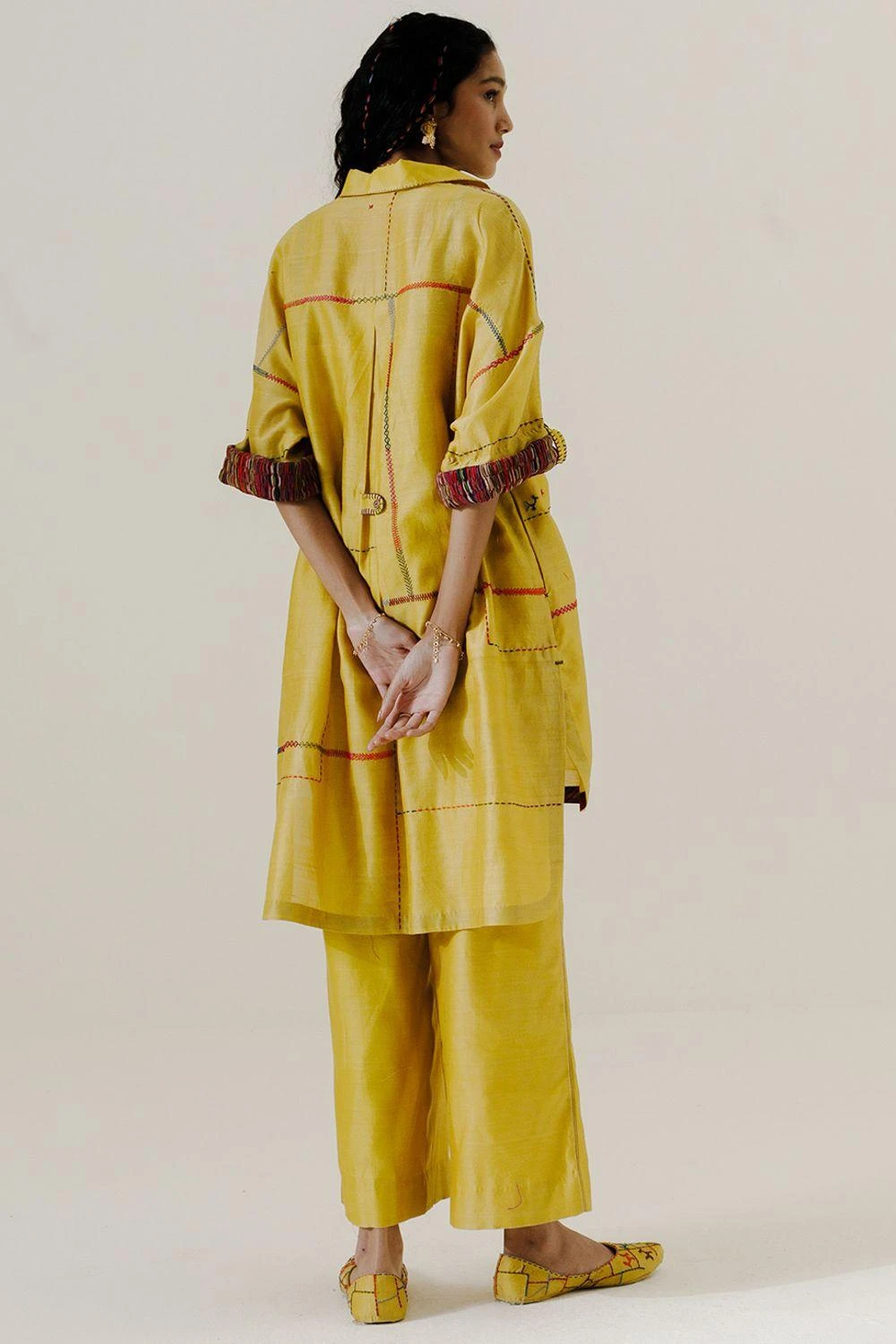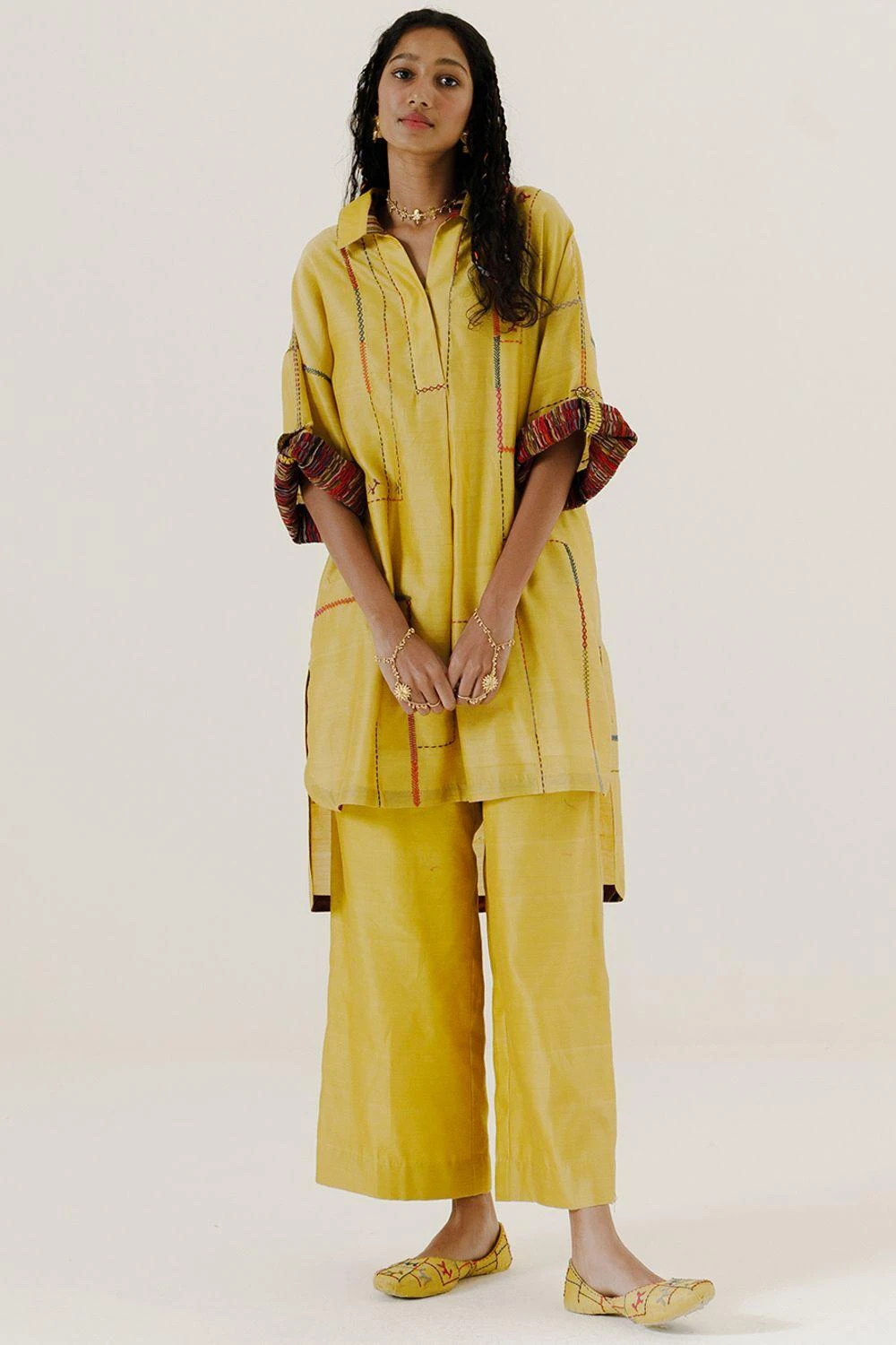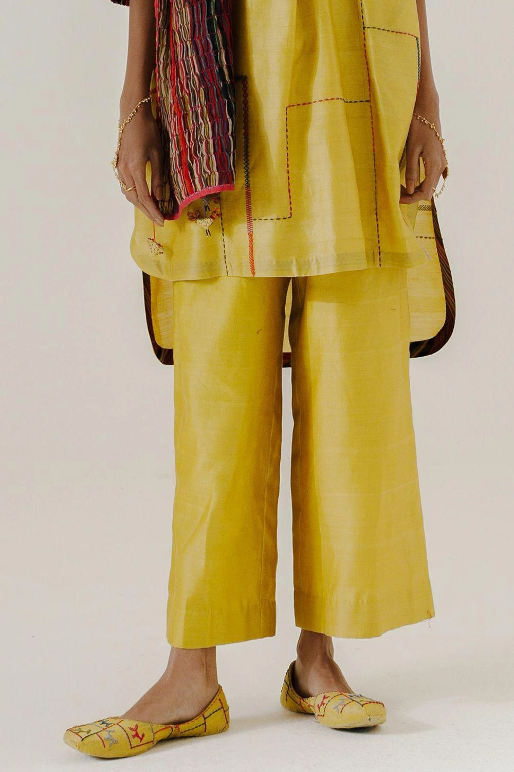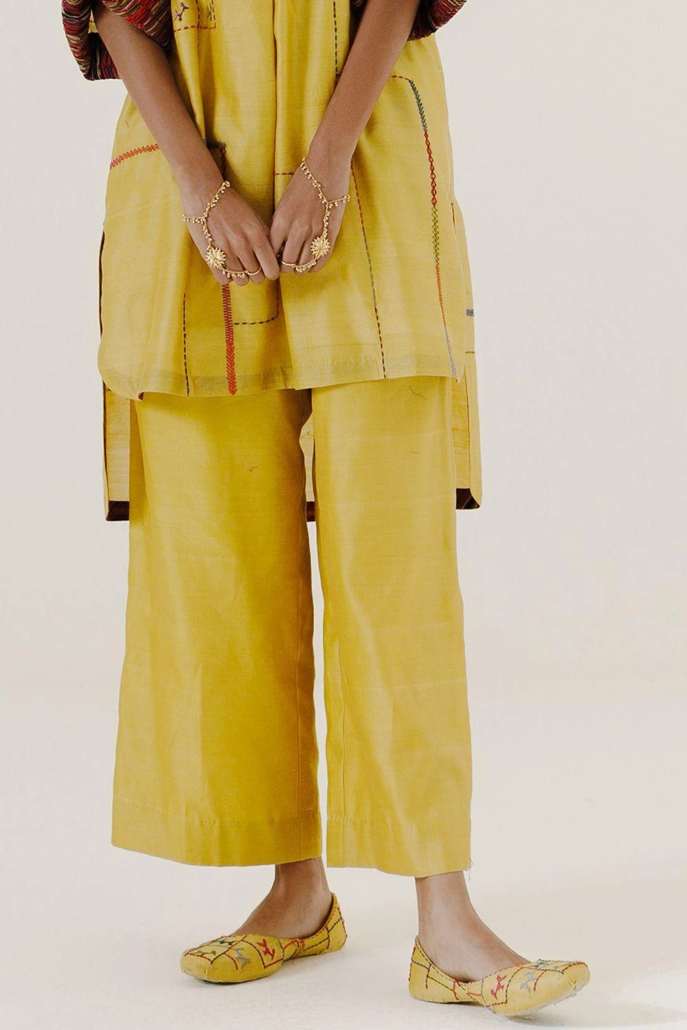 Crafted in handwoven chanderi, these yellow mool ijar pants feature a hand block print with an elastic waist band at the back and drawstring at the front for maximum comfort. Style these with the yellow high low kurta to complete the set.
