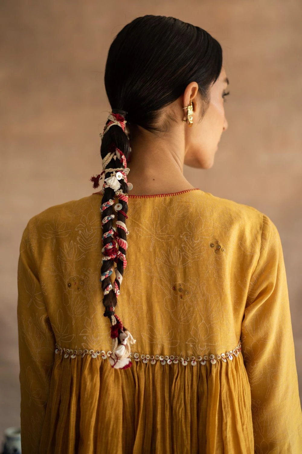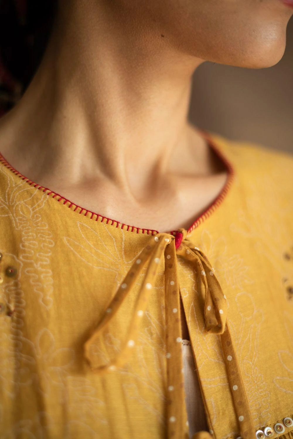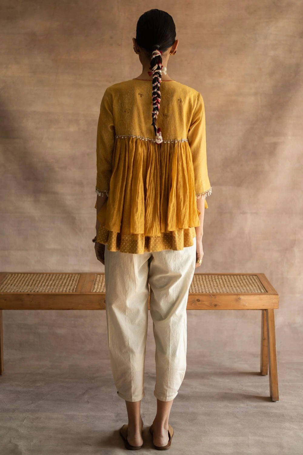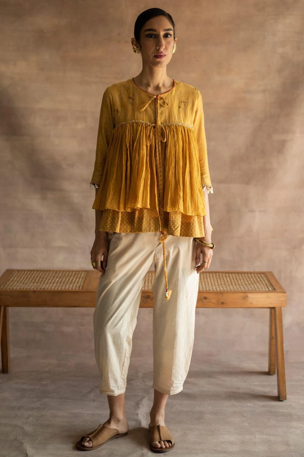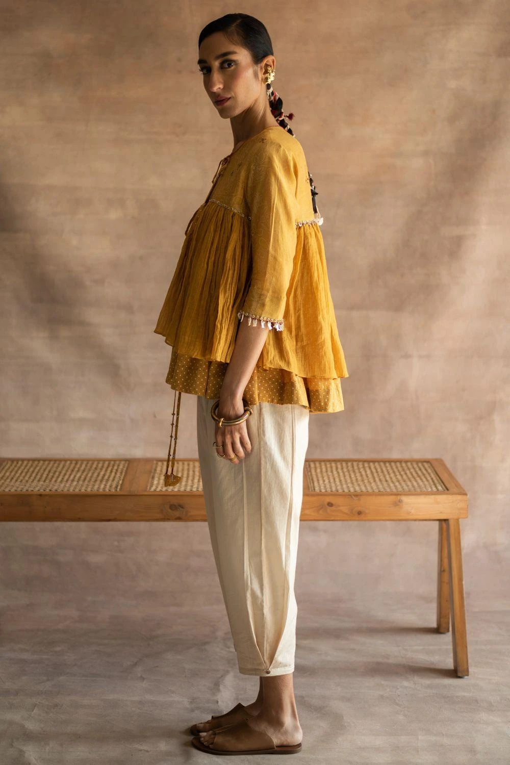 This mustard kedi top is a great piece for an everyday elevated look. It is made in handwoven chanderi mul & pinstriped chanderi with hand-block prints, tassels & Mother of Pearl details. You can style it with a pair of blue denims & wedges.