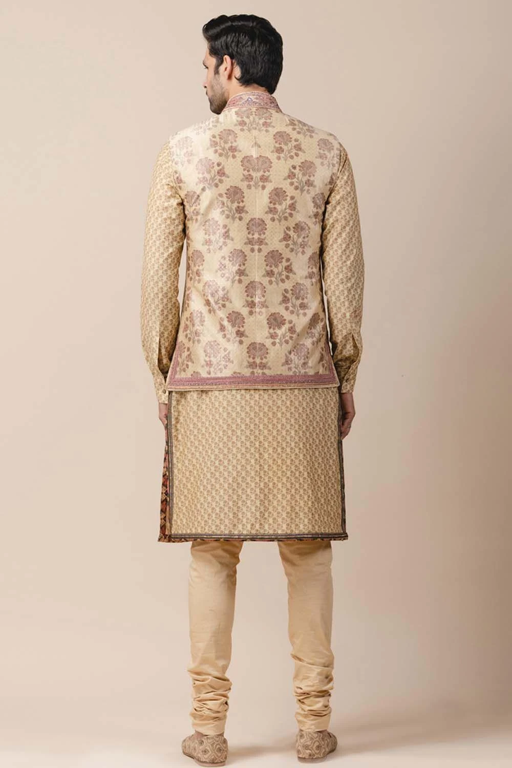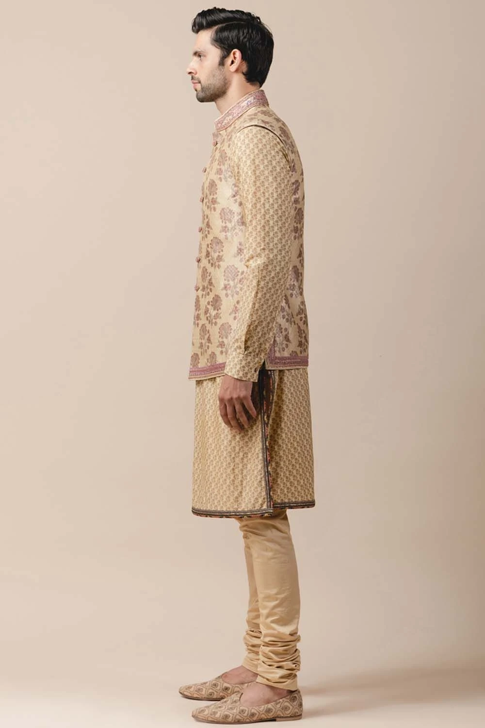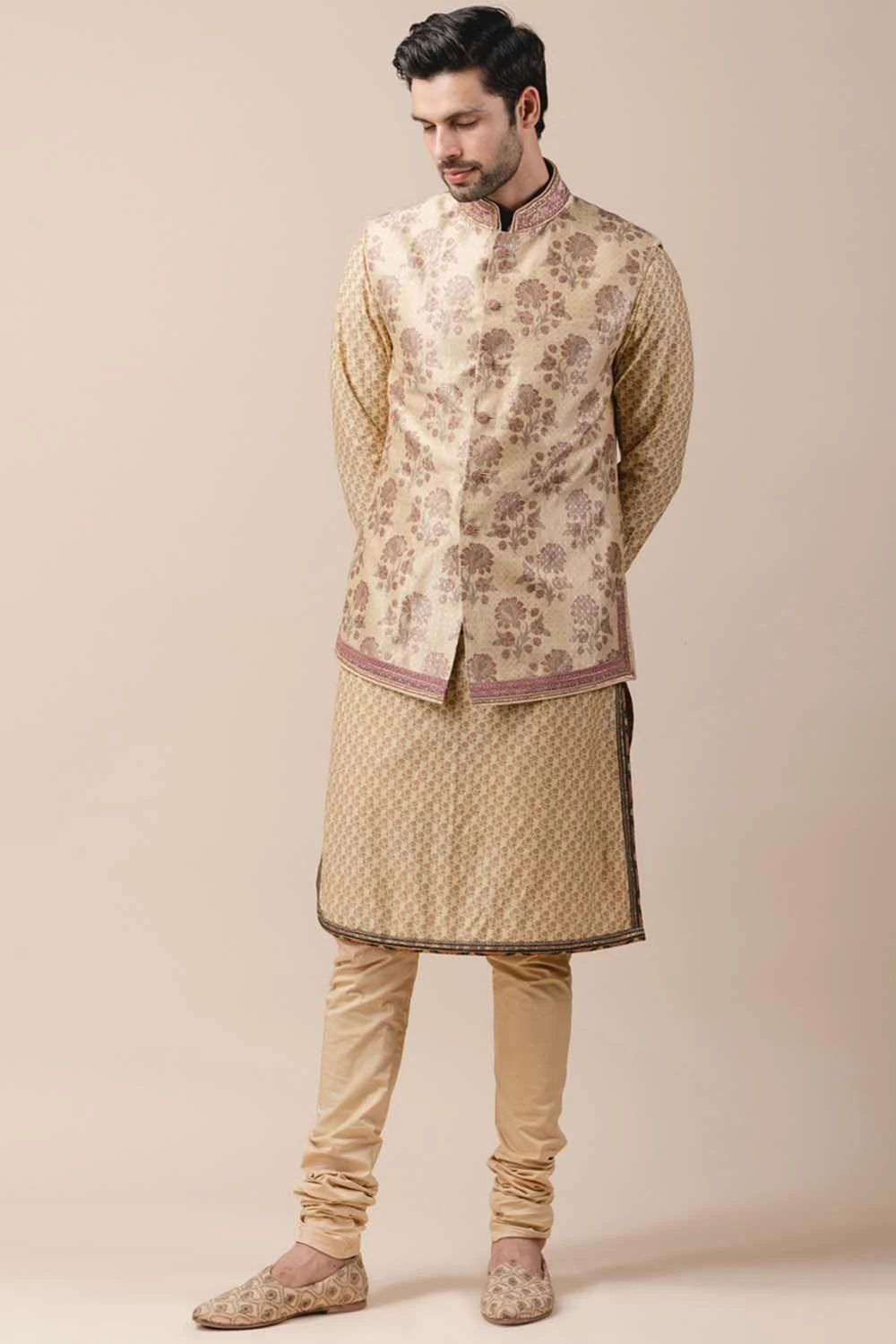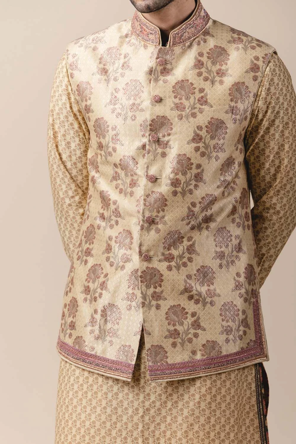 This printed bundi jacket is woven in brocade with highlighted collars. The collar and the hem is embellished with zardosi border. The loop buttons are also enhanced with zardosi work. Pair it with subtle kurta and churidaar to finish the look.