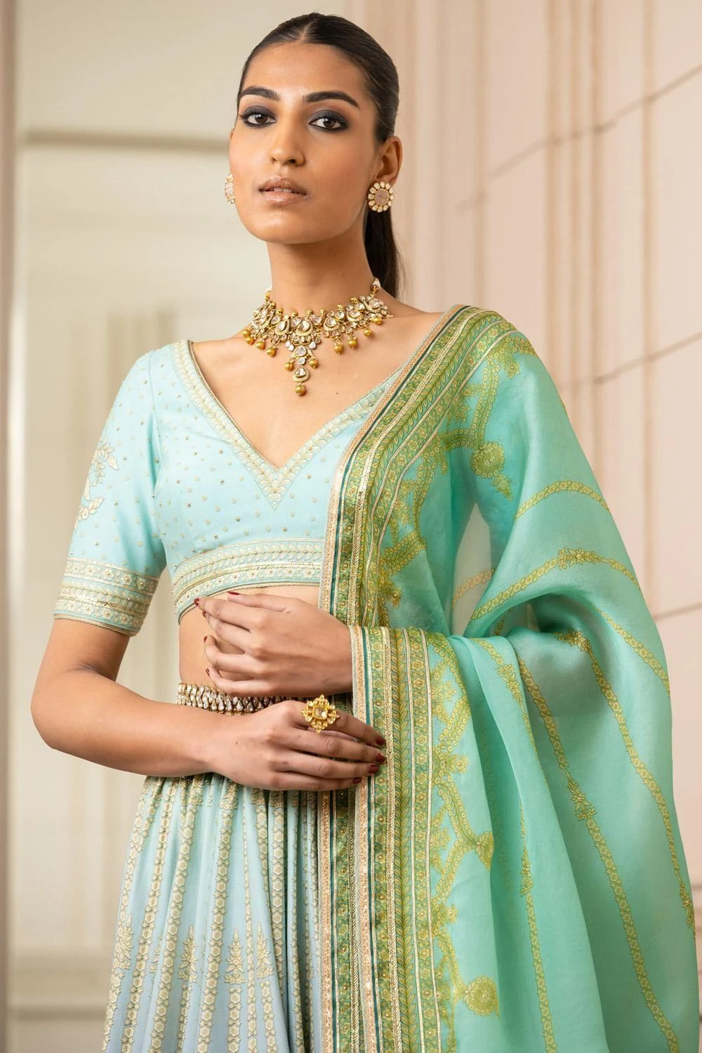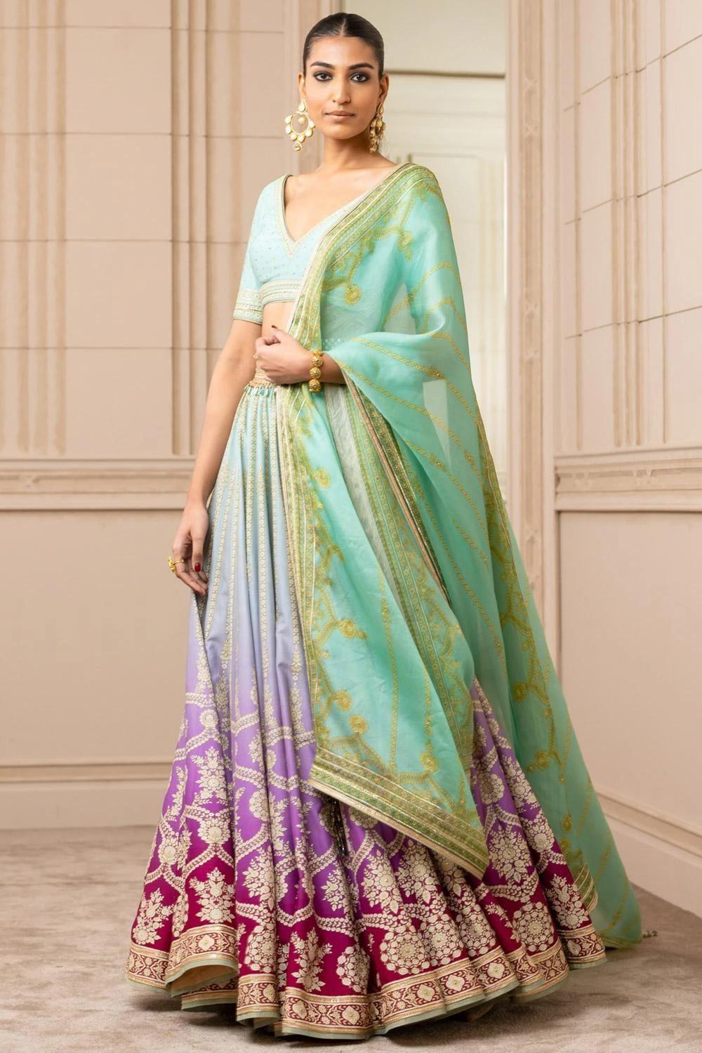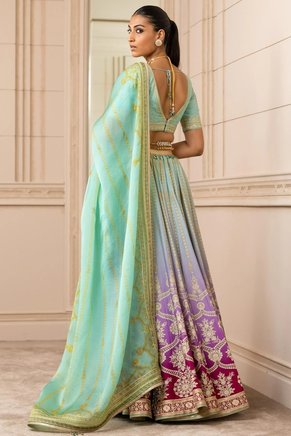 Welcome summer in a vibrant colour palette with this mint to fuchsia ombre printed lehenga that is highlighted with studs and features crystal tassel detailing on the waistline. It is paired with a foil jersey blouse & matching dupatta.