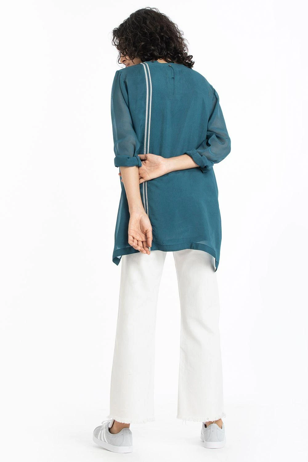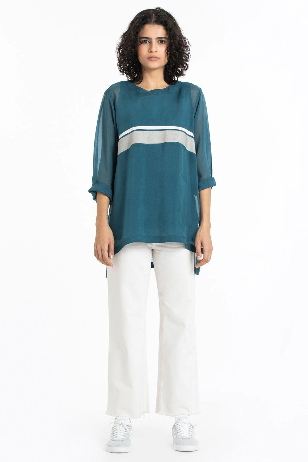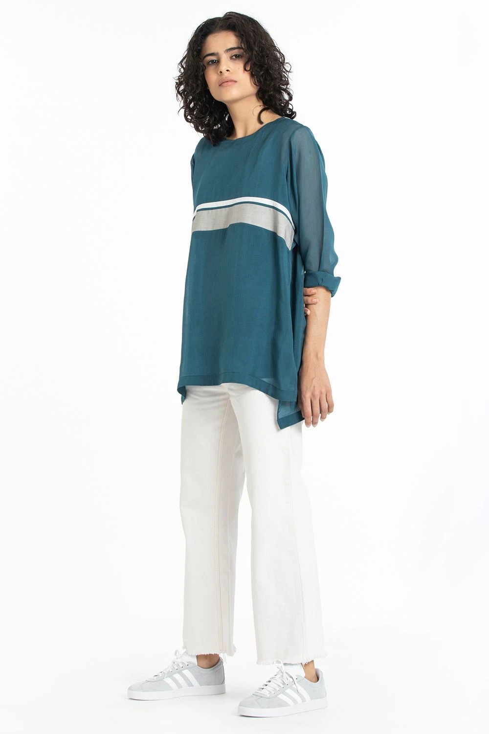 Pair this loose organza top with your white bell bottoms for a lunch with your girls. Look for that stripe detail both at the front and back!
