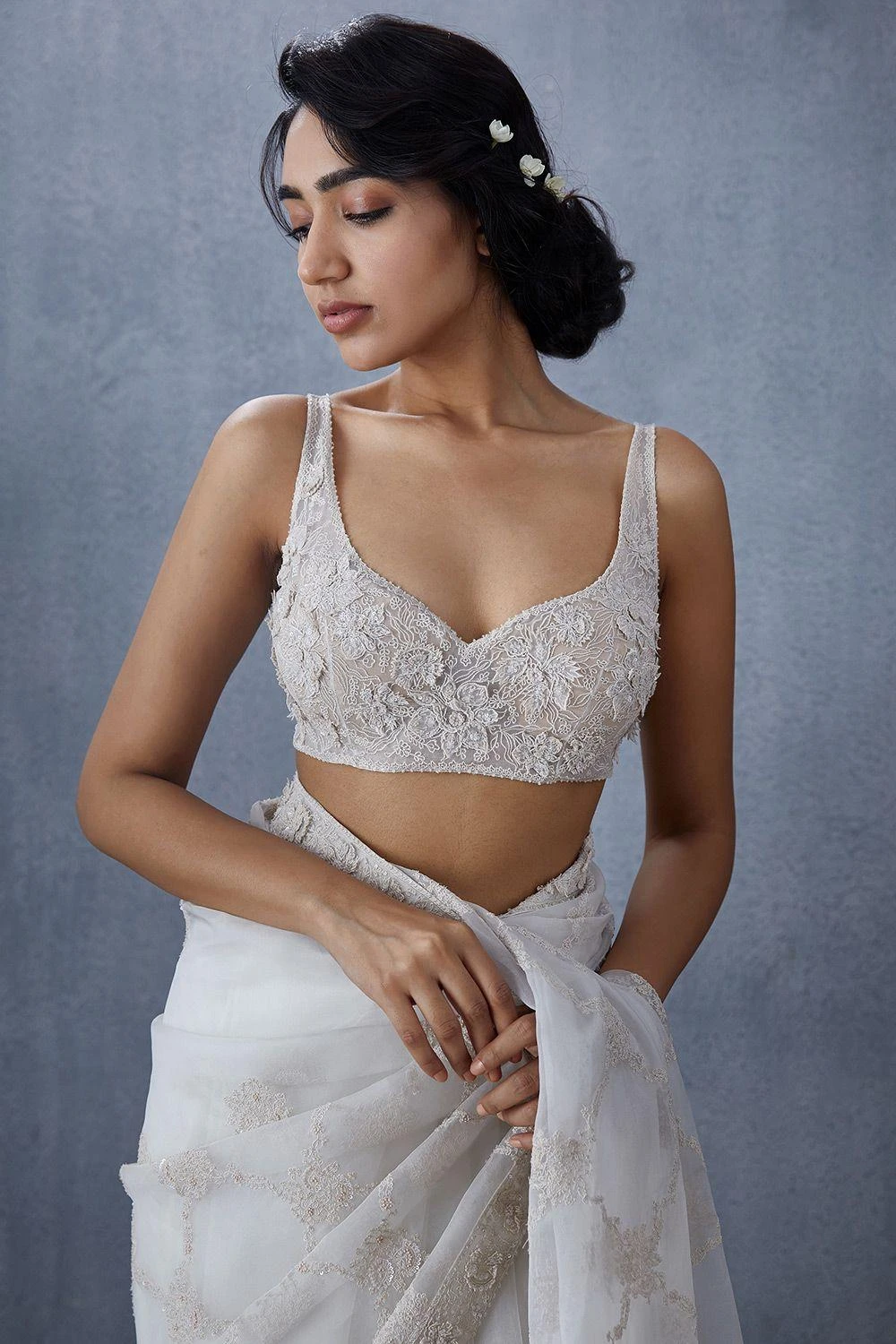 With tonal dori work on organza, this white choli is the contemporary take on the traditional craftsmanship. Wear it with a plain georgette sari for a farewell or pair it with a voluminous organza lehenga for a poolside mehendi.