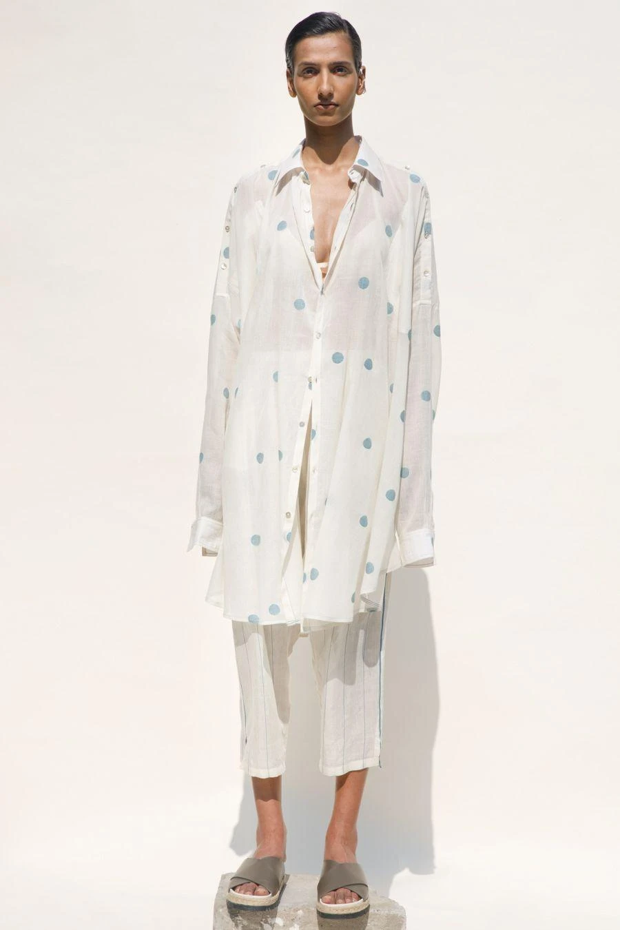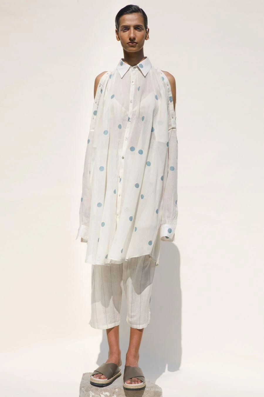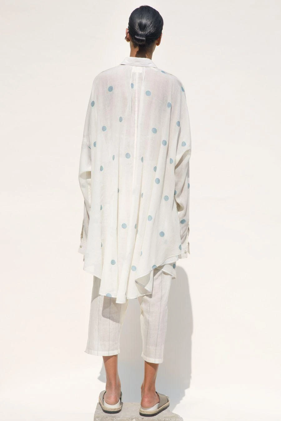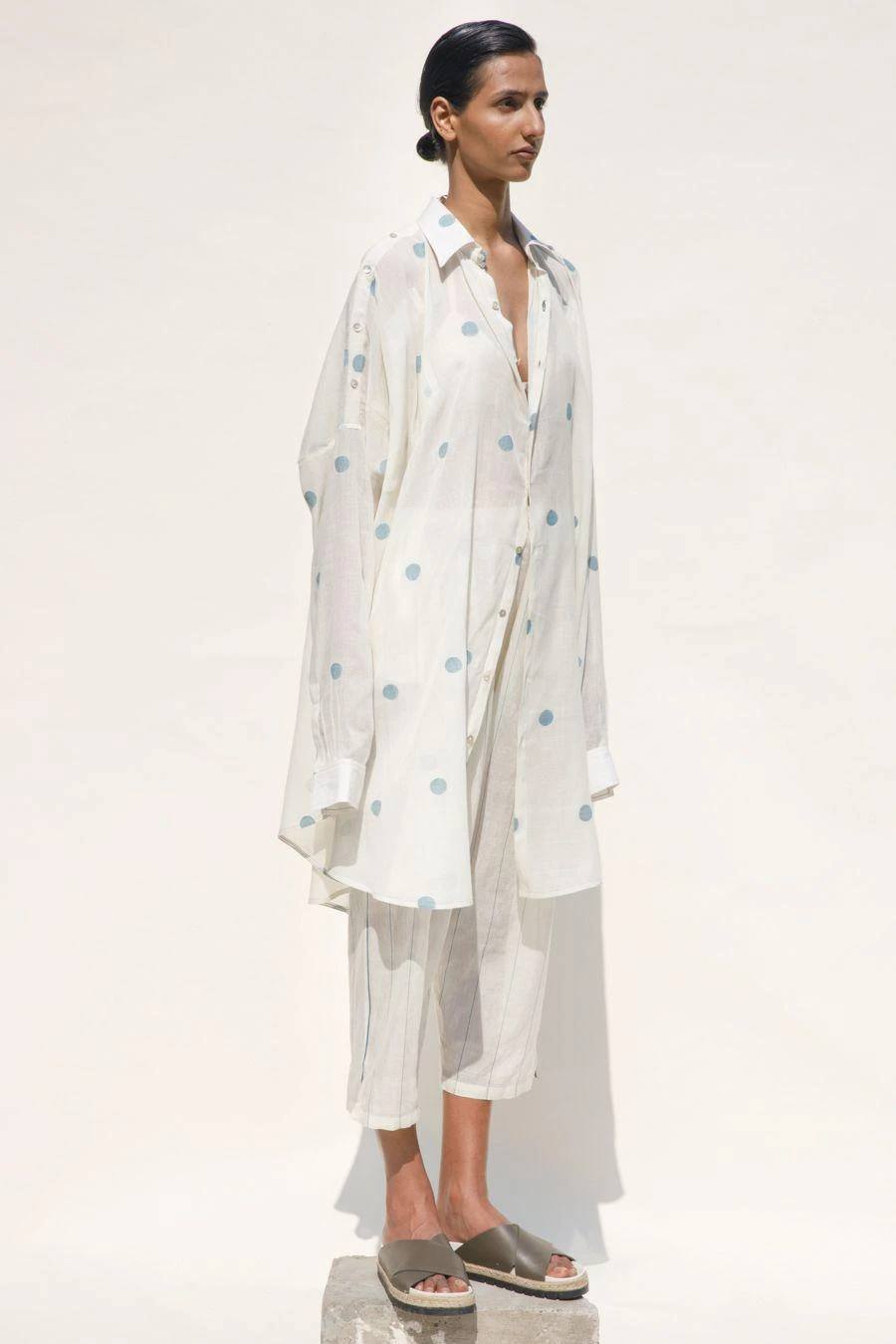 Whether you’re looking to make a bold statement or just seeking to elevate your style quotient, this sartorial marvel is a must-have. This buttoned-down, relaxed-fit polka shirt dress is crafted in hand spun jamdani cotton-silk.