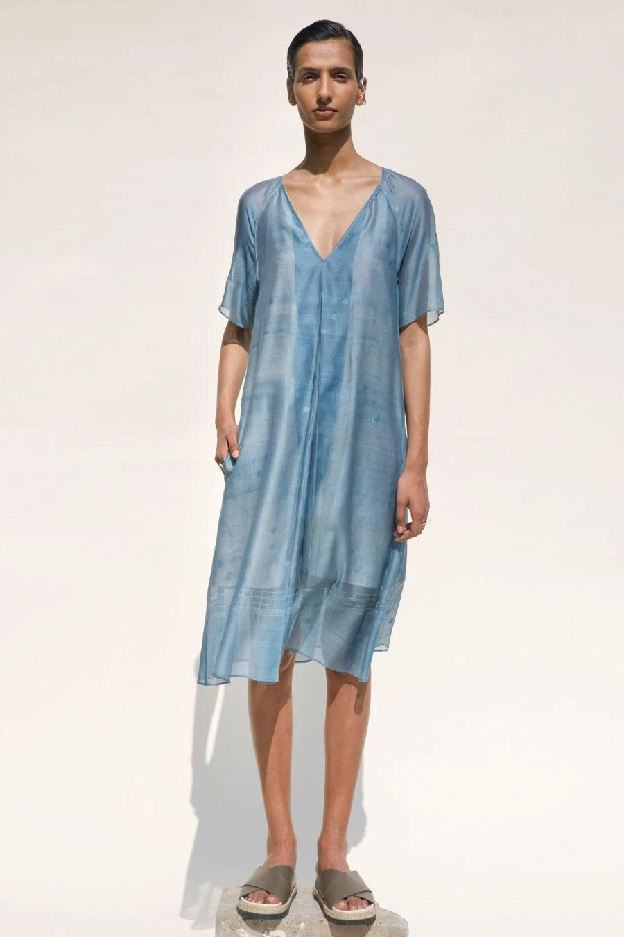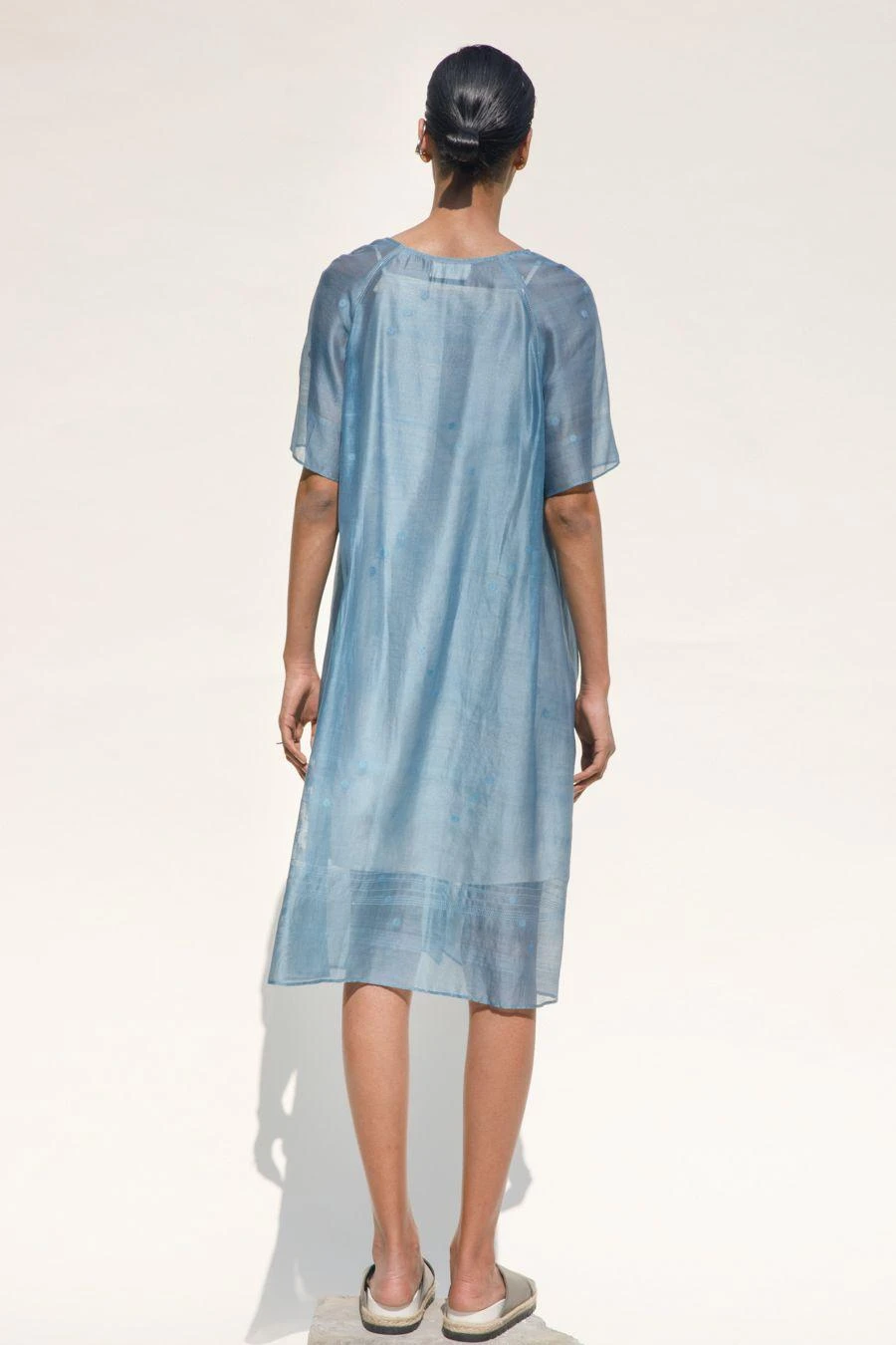 Whether you’re looking to make a bold statement or just seeking to elevate your style quotient, this sartorial marvel is a must-have. Crafted in handloom jamdani cotton silk, this sheer dress features inverted pleated & fagoting details.