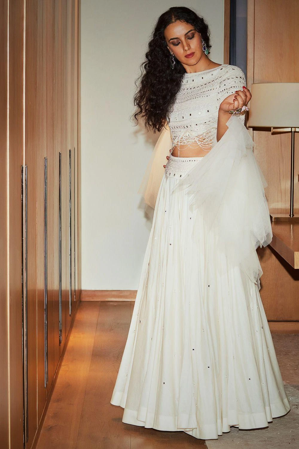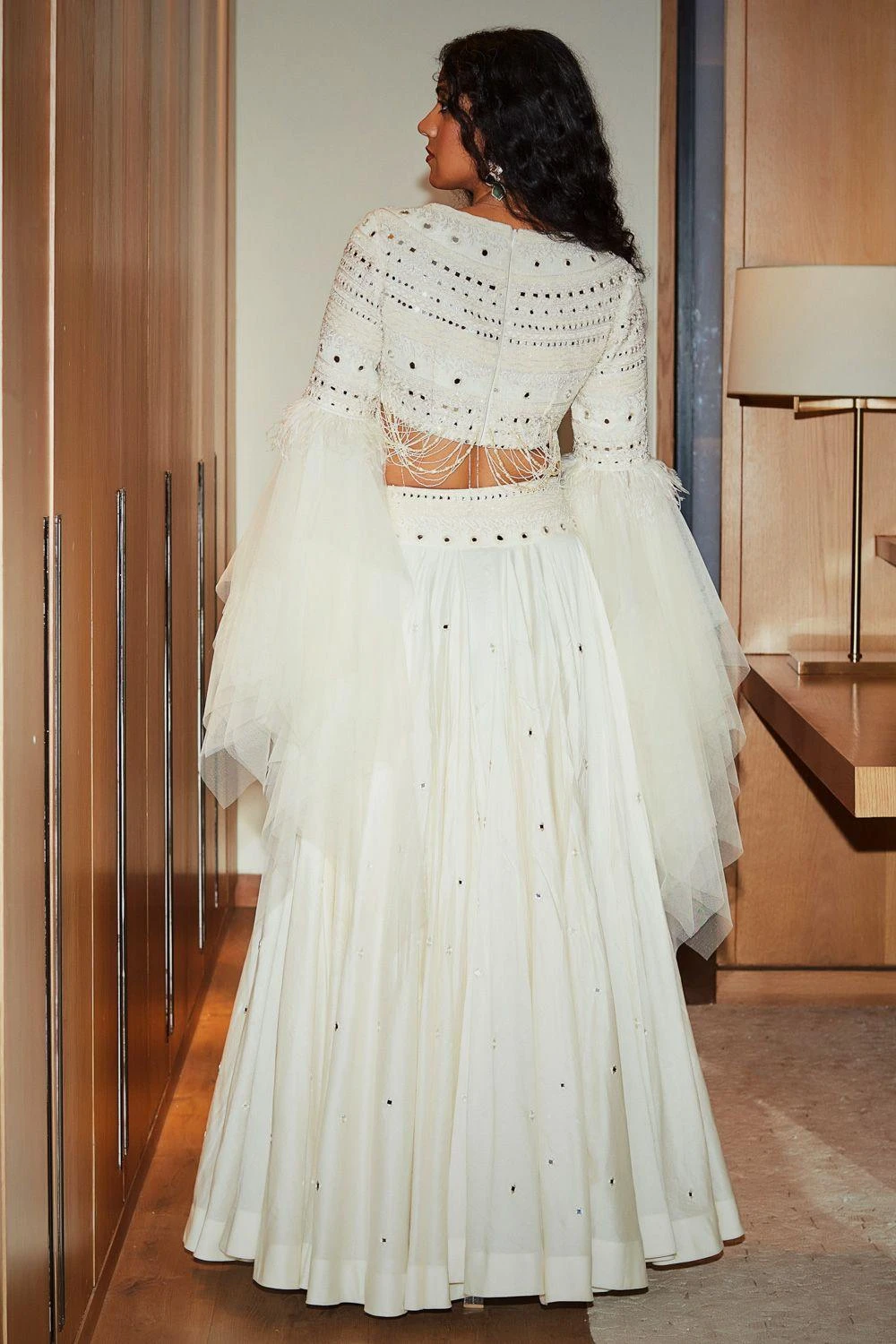 Couture elegance meets the old world glamour with this ivory lehenga set. It features a hand embroidered chanderi skirt paired with a tone on tone hand embroidered crop top with draped tulle sleeves. Add a pair of emeralds with this look.