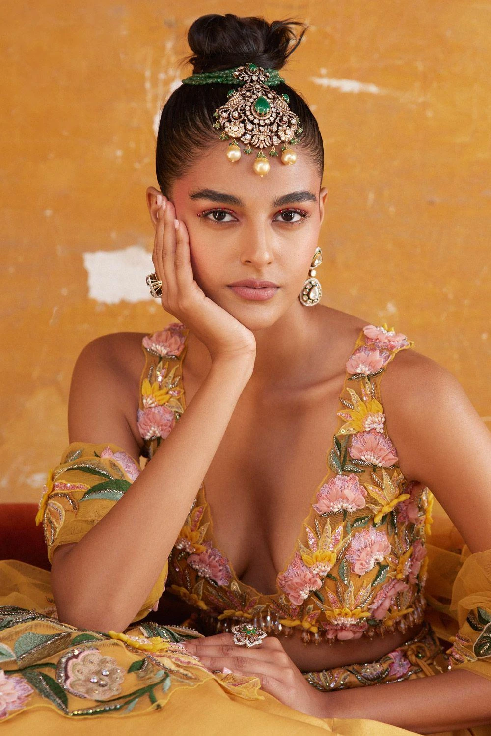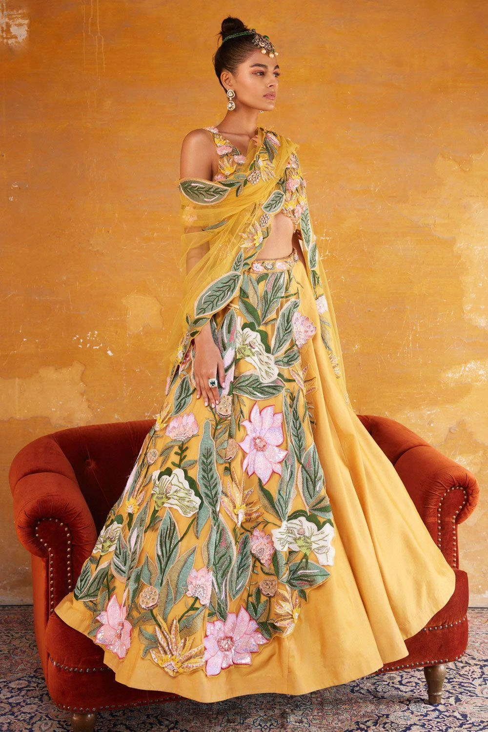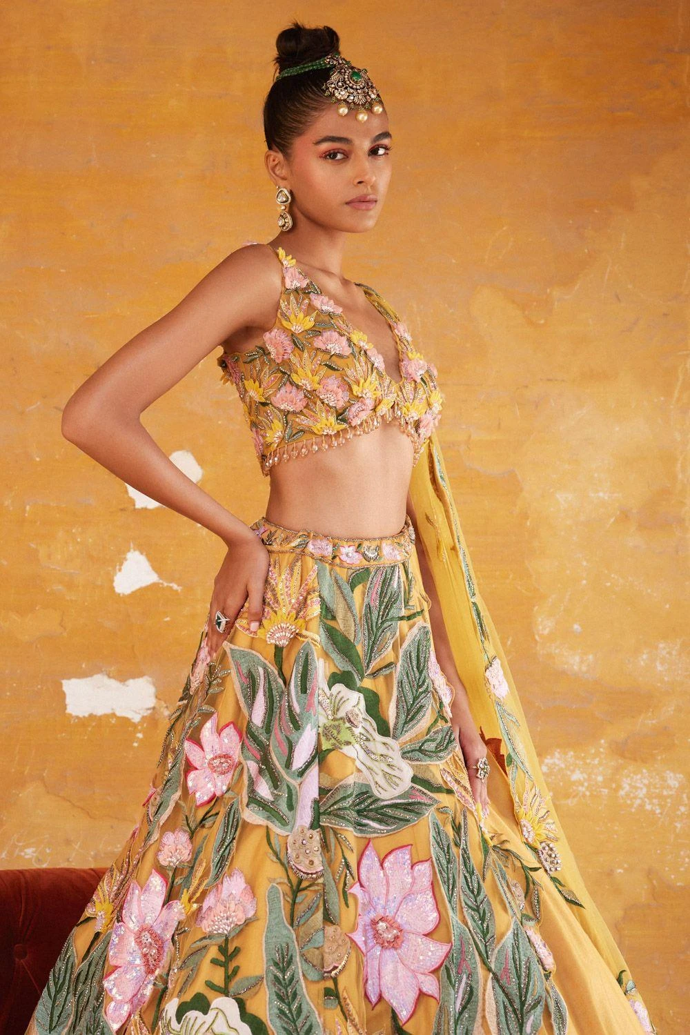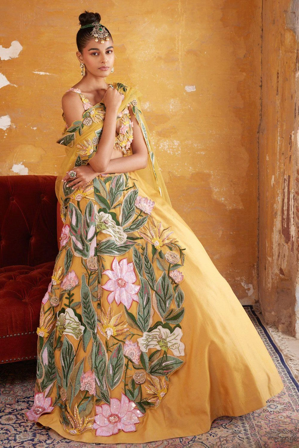Immerse yourself in the radiance of this embroidered lehenga set. The fully embroidered blouse showcases exquisite cutwork and delicate handmade 3D floral accents. Paired with a layered yellow skirt & dupatta, this ensemble exudes timeless elegance.