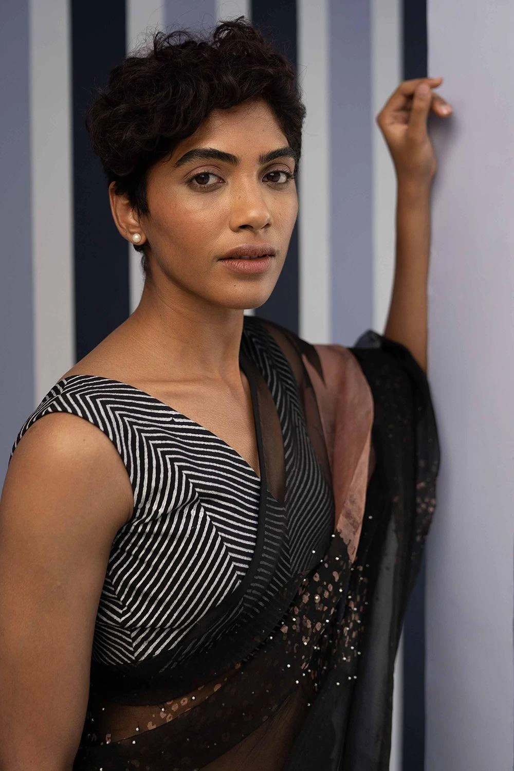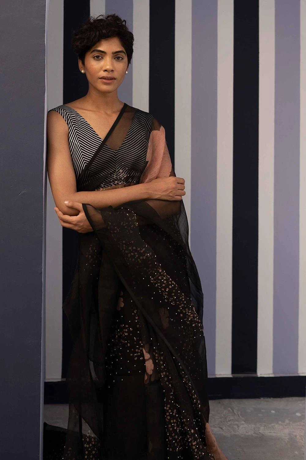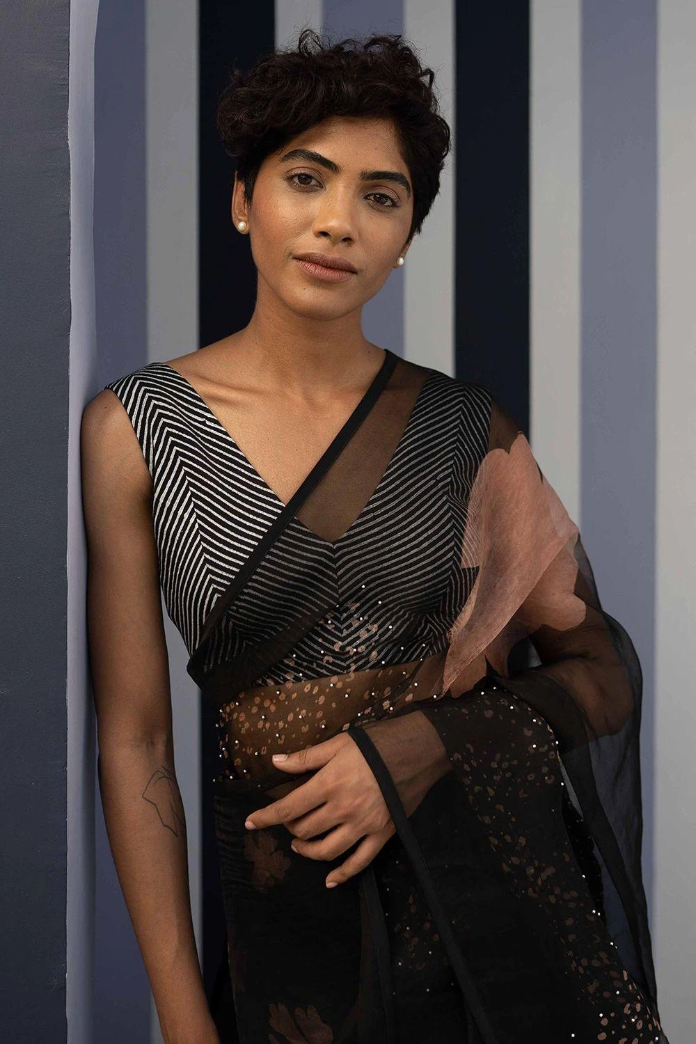 This blouse features striped prints on a black base. Style it as a different look each time by pairing it with a pre draped twist skirt or a black ophelia floral print sari to complete the look.