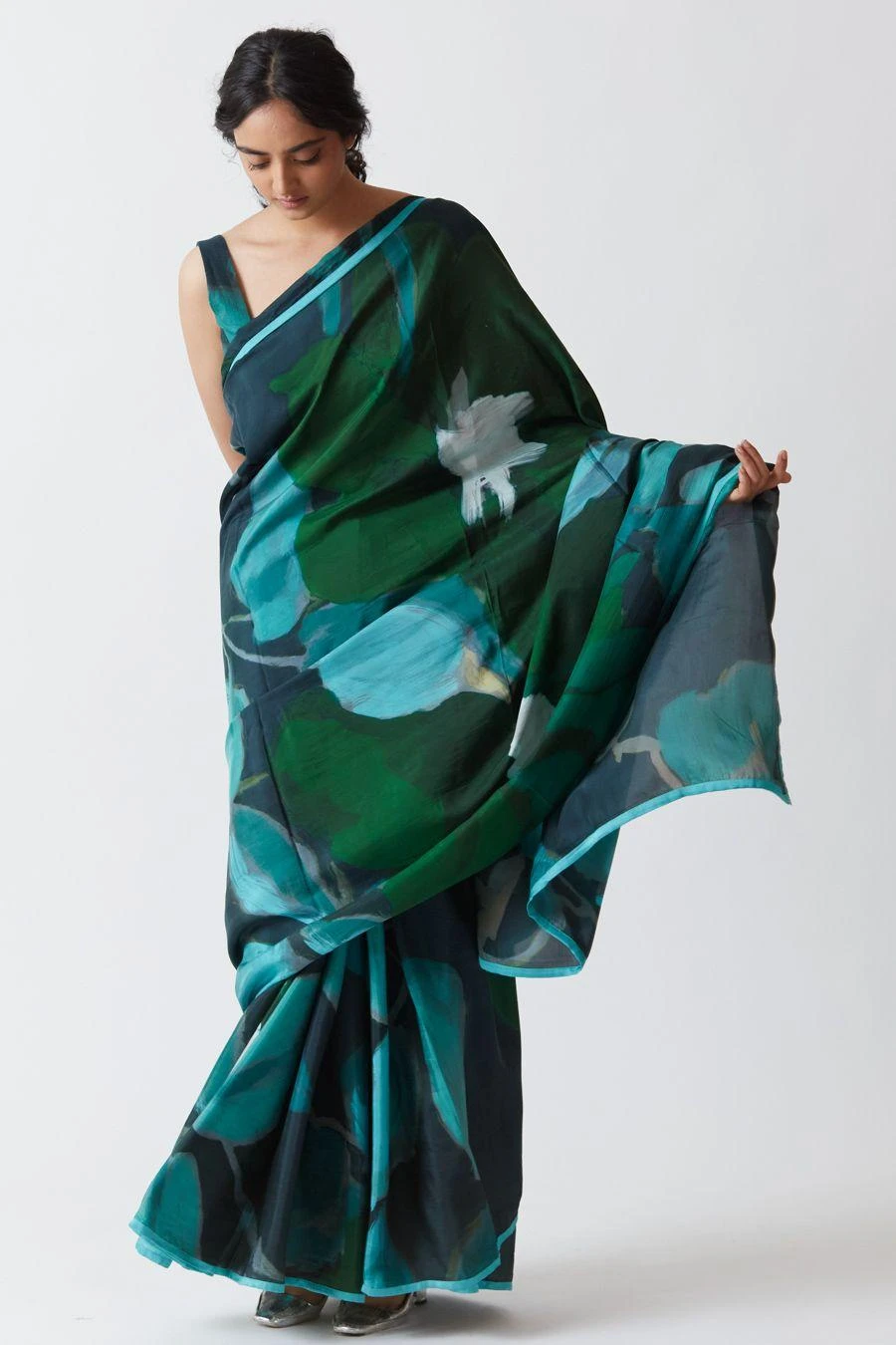 Crafted in pure linen, hand-painted & printed florals with vines & small rosettes adorn this jade green blouse. Style it with the Jade green silk sari & a pair of statement earrings to complete the look.