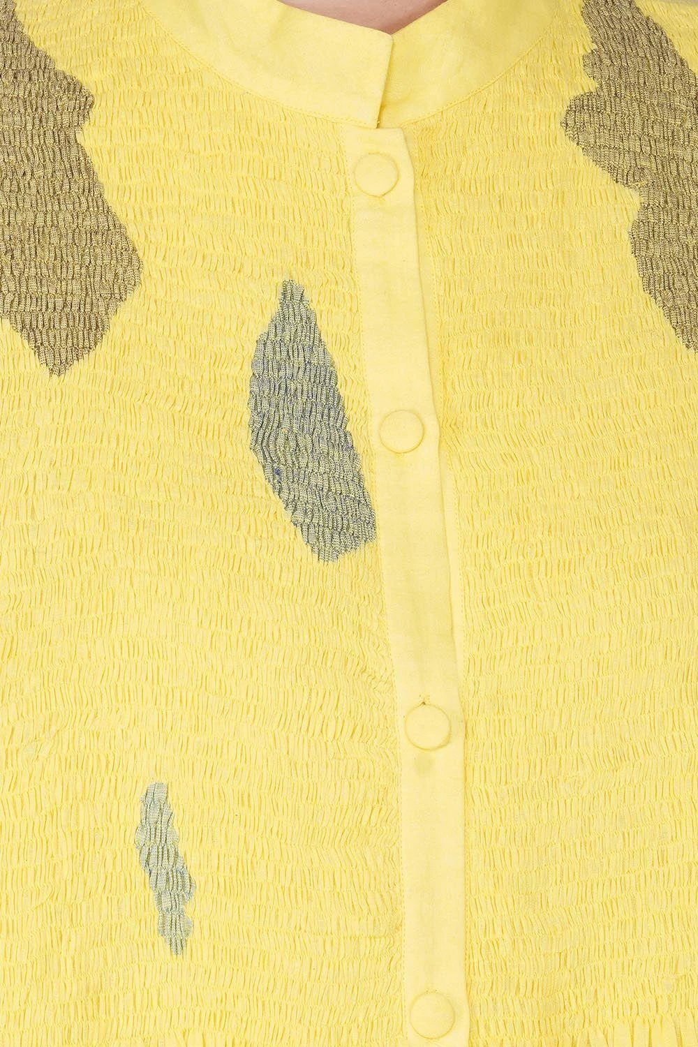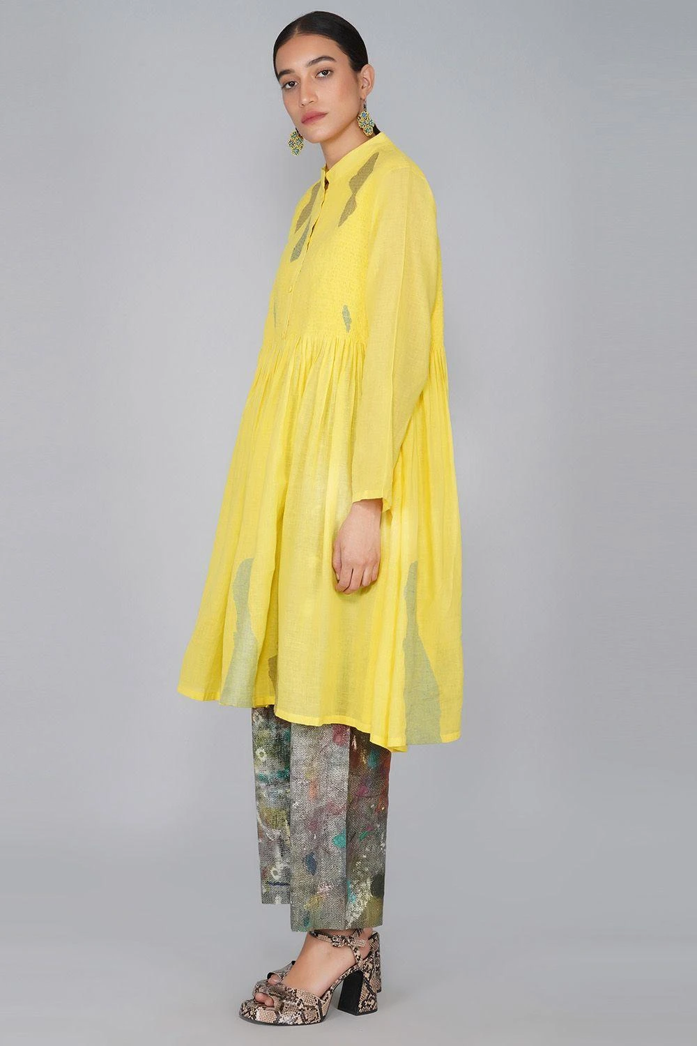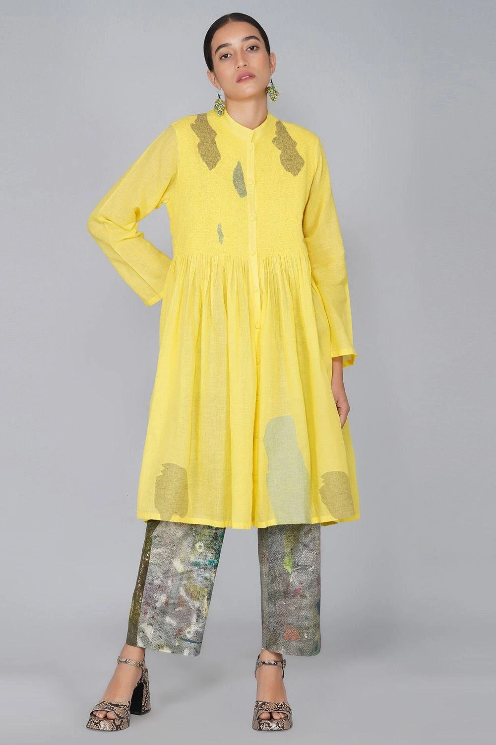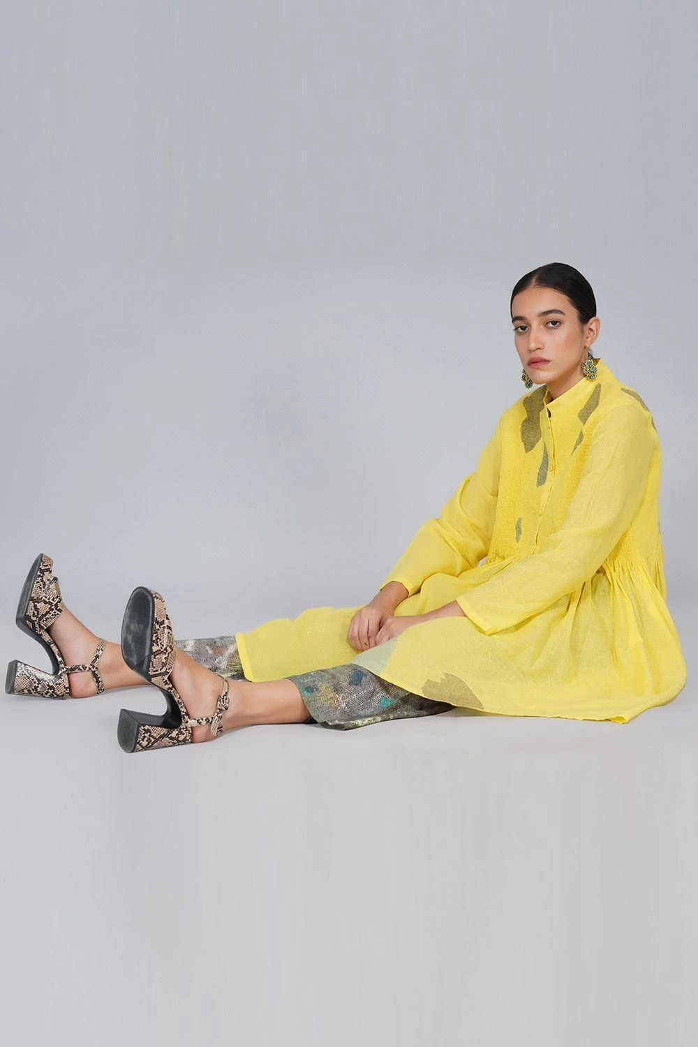 Radiate sunshine in this day glo dress. Woven in cotton jamdani, it features front yoke button down placket with gathering details. Wear it solo or style it with impressionist pants from the collection for a dressy look.